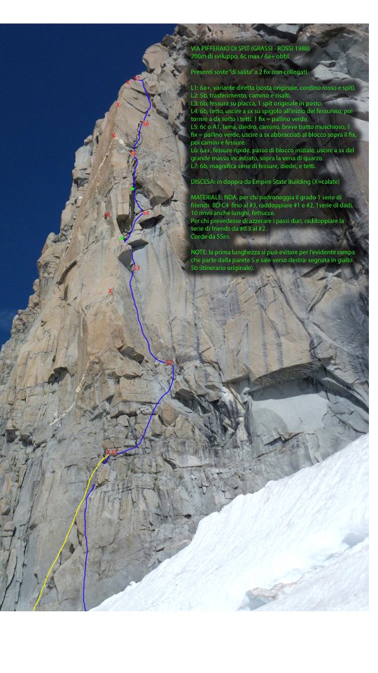 - L1: 6a+, variante diretta (sosta originale. cordino rosso e spit). Evitabile passando per la rampa dalla parete Sud