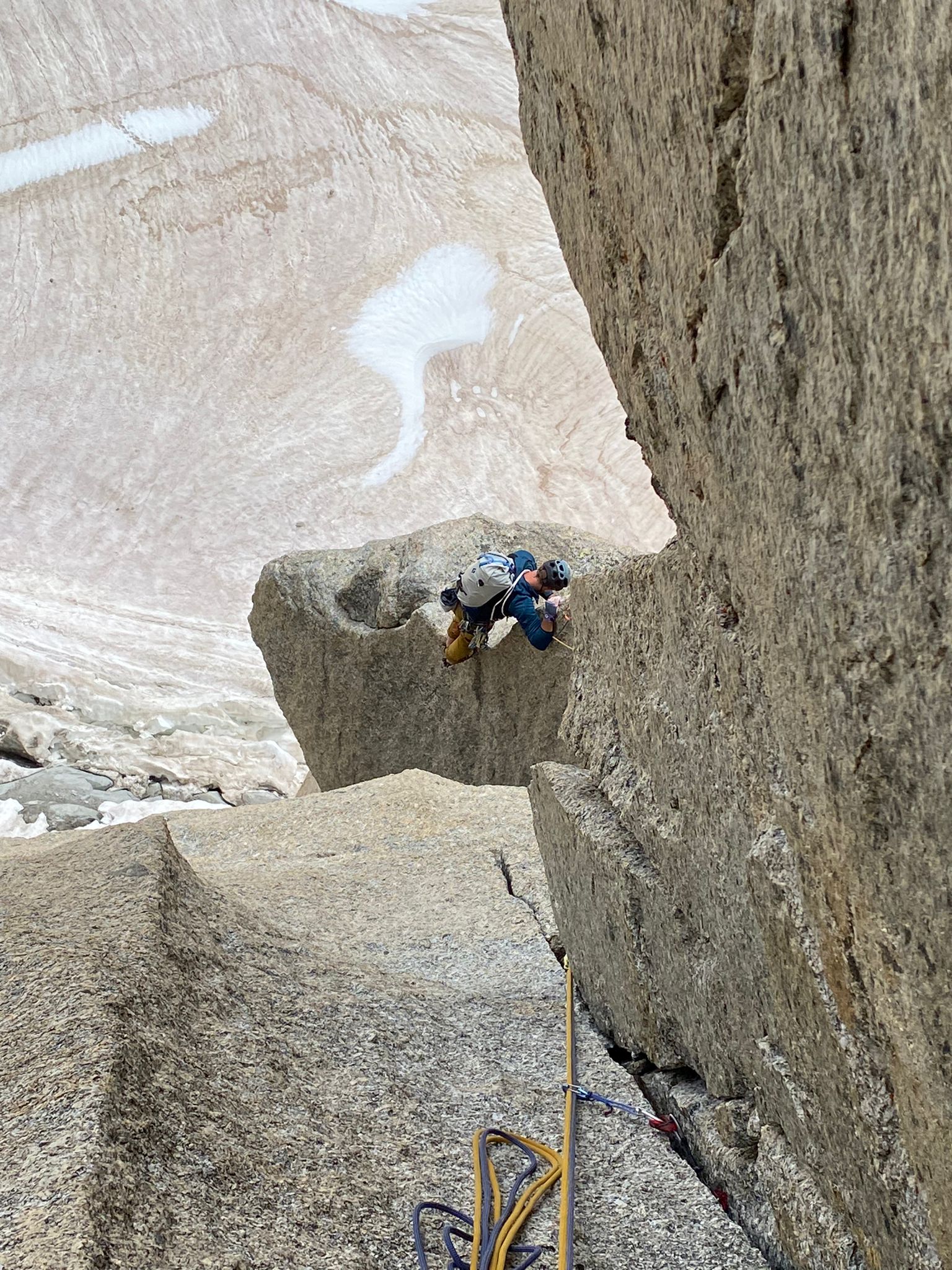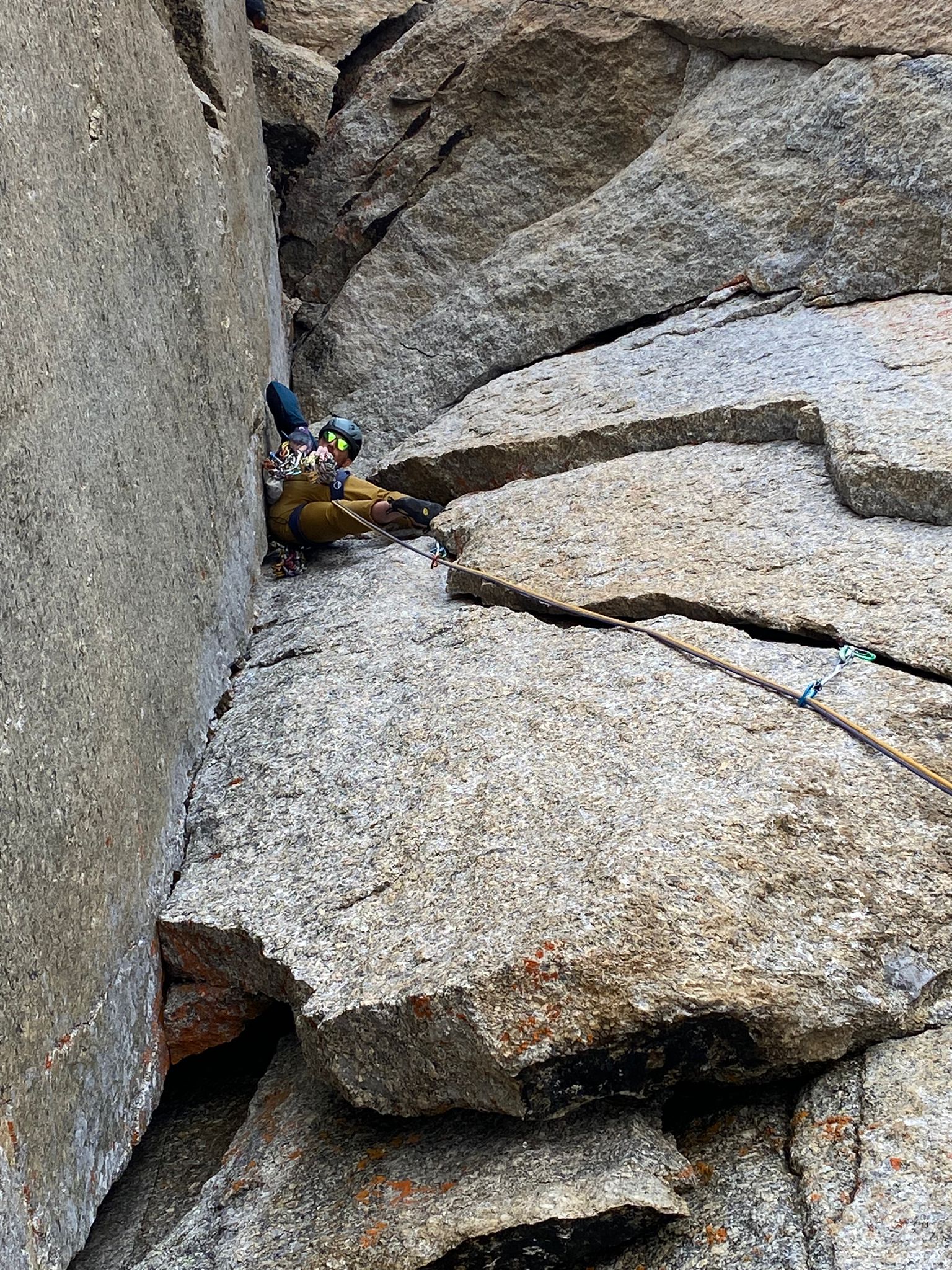 - L5: 6c o Al, lama. diedro, camino. breve tratto muschioso, 1 fix. uscire a sx abbracciati al blocco sopra il fix, poi camini e fessure