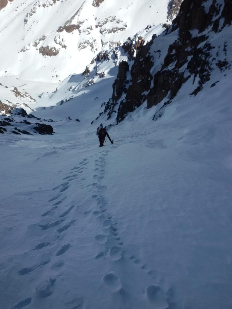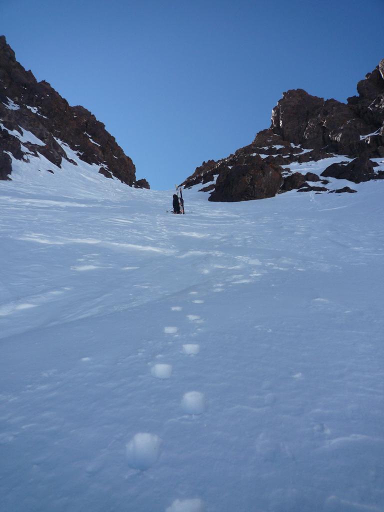 Canale molto bello rettilineo e con pendenze continue. E’ a due passi dal rifugio quindi è molto comodo e si può abbinare ad altre gite vicine. Si sale sci ai piedi fino a 3/4 del canale poi dove restringe abbiamo calzato i ramponi. Abbiamo trovato neve portante nella parte alta per presenza di placche da vento dure, Ancora tratti di farina vecchia ai lati e sulle contropendenze. Parte centrale e parte bassa su neve lavorata dal vento, crosta non portante ma ancora ben sciabile.