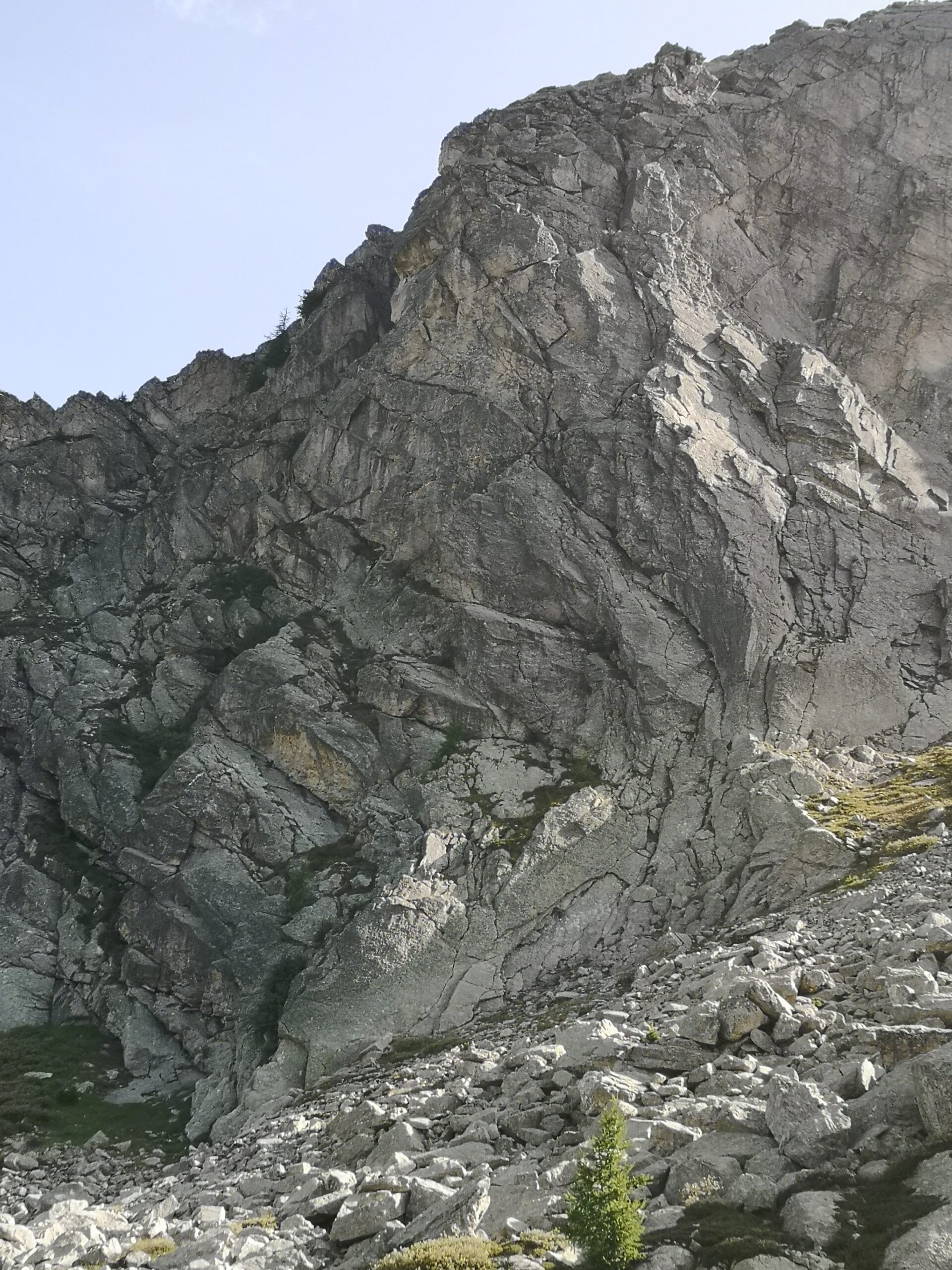 L2 5c – seguire lo spigolo, dove si trova un primo spit. Passare a sinistra di dei blocchi, fino alla seconda sosta.
