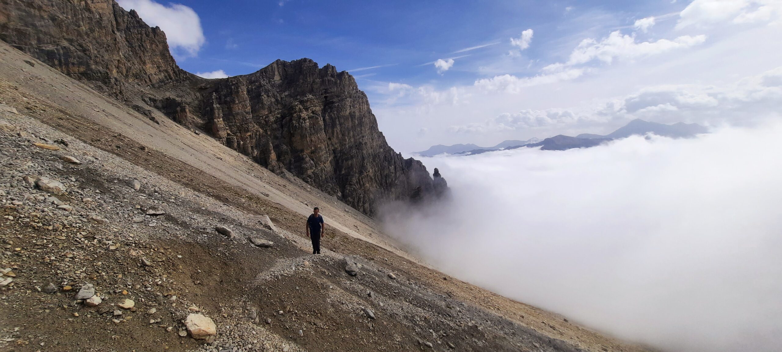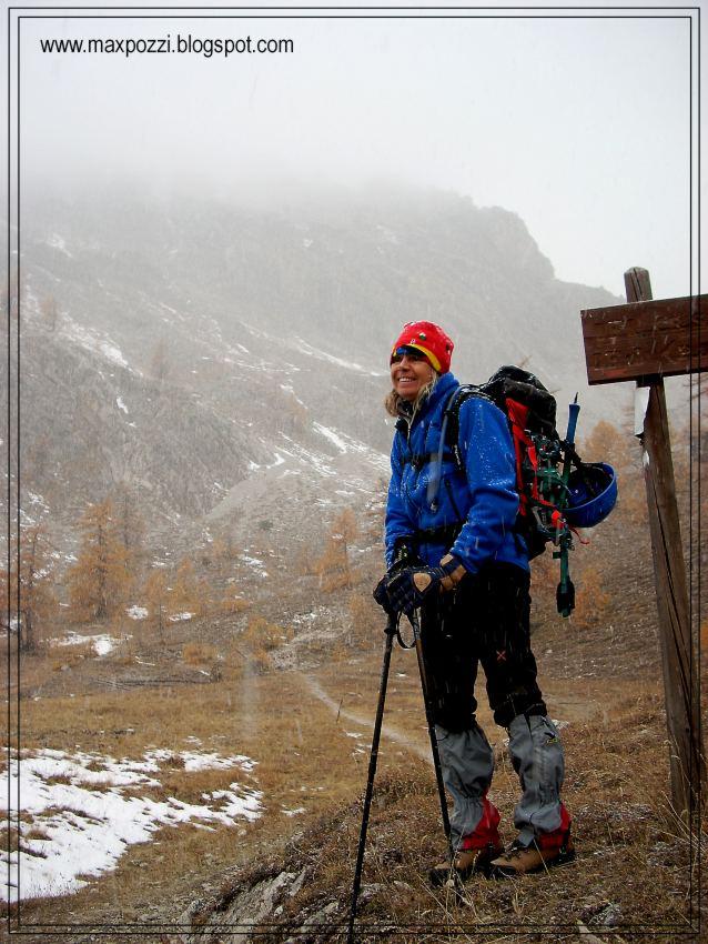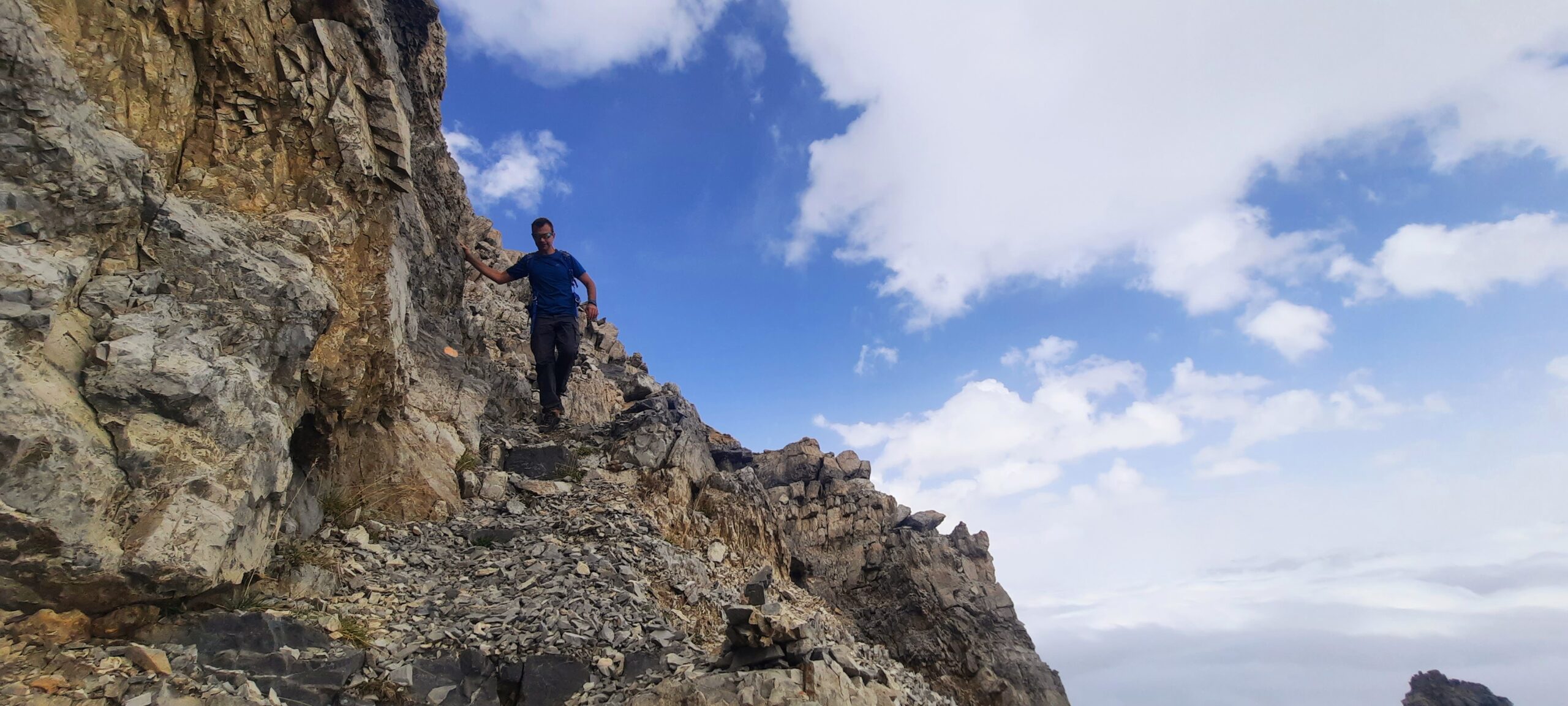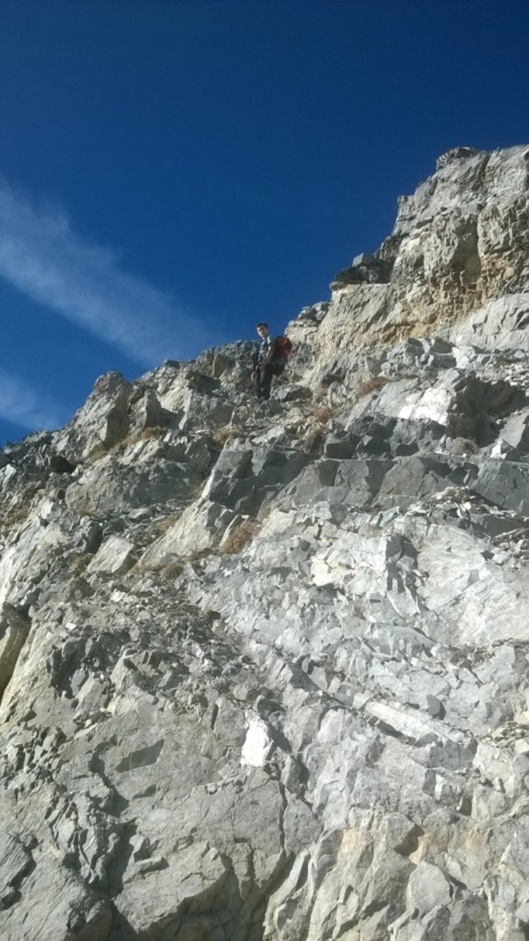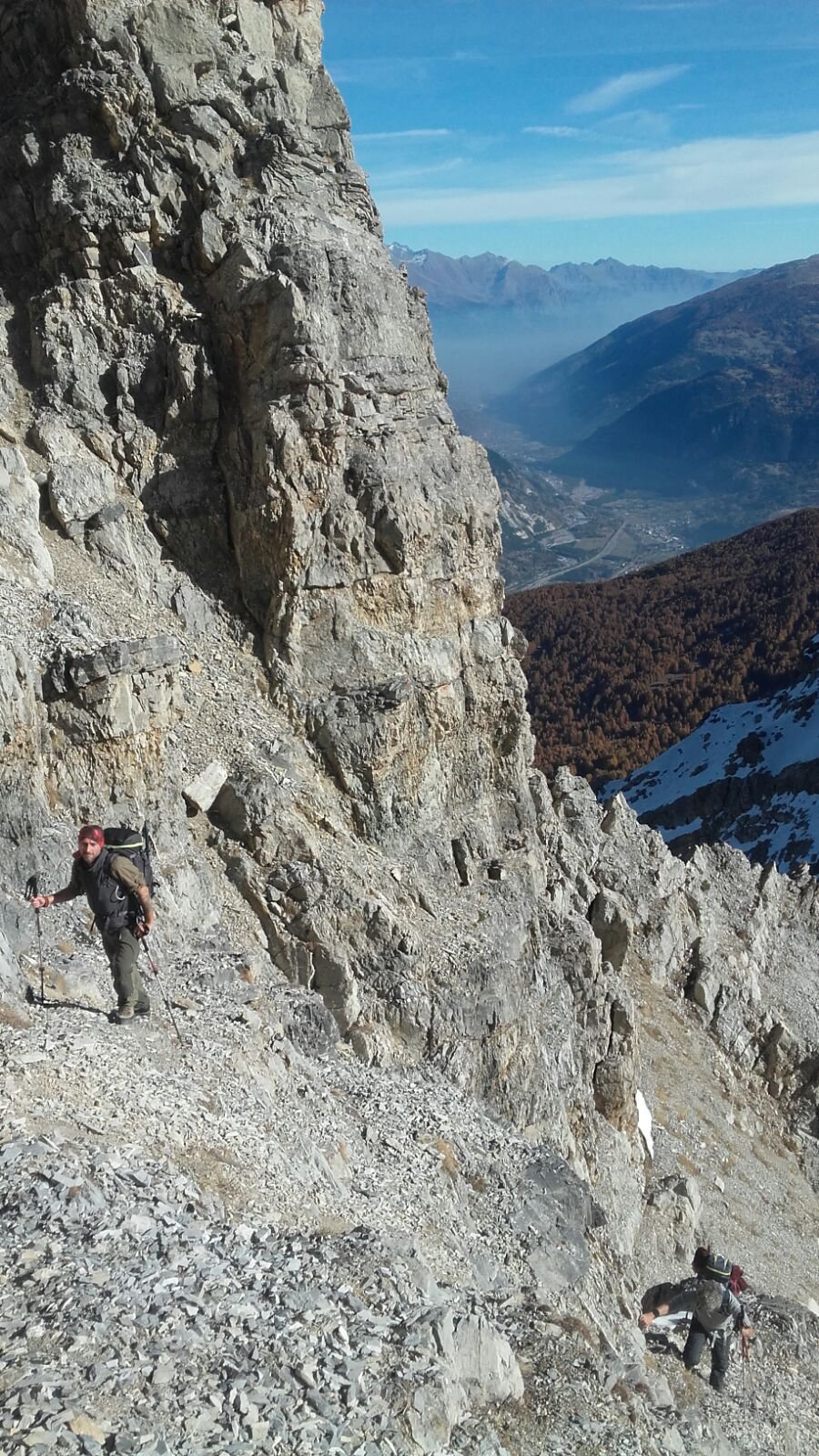 Si scende di qualche metro e si percorre una cengia ampia e non esposta particolarmente, ma resa insidiosa dal fine pietrisco scivoloso (non ci sono grossi problemi senza neve o ghiaccio).
