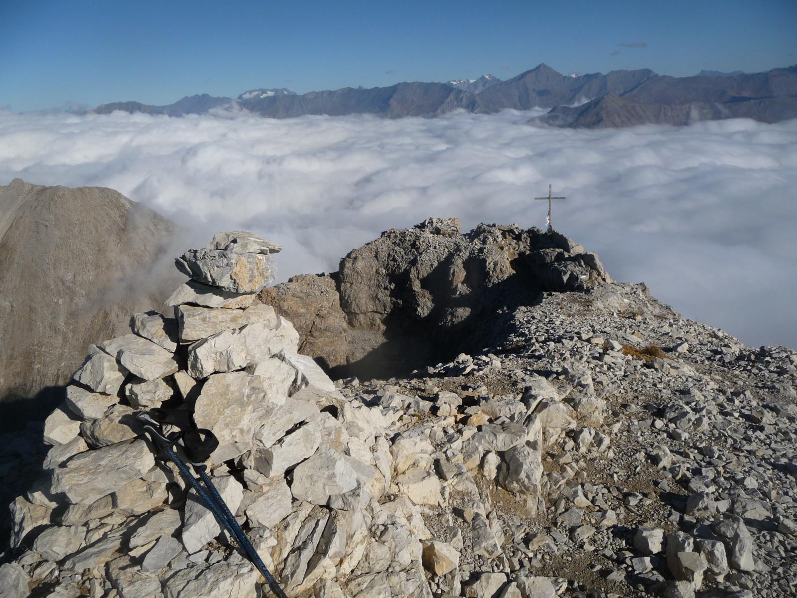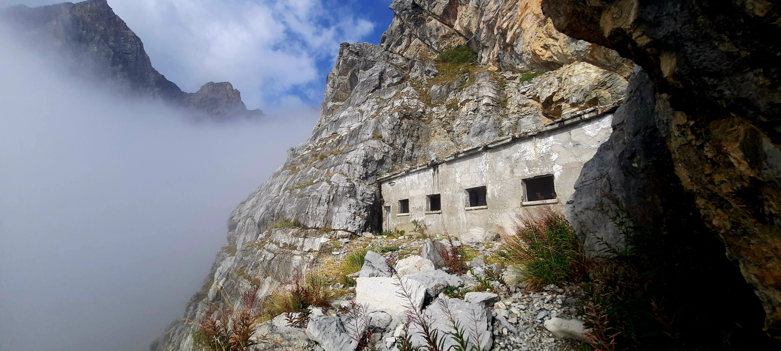 Dalla croce abbassarsi di qualche metro fino alla conca dove vi sono i ruderi di un baraccamento militare. Proseguire verso NO e raggiungere un grosso canalone detritico, quindi superare la bastionata rocciosa per cengette e canalini facili ma molto instabili e franosi.
