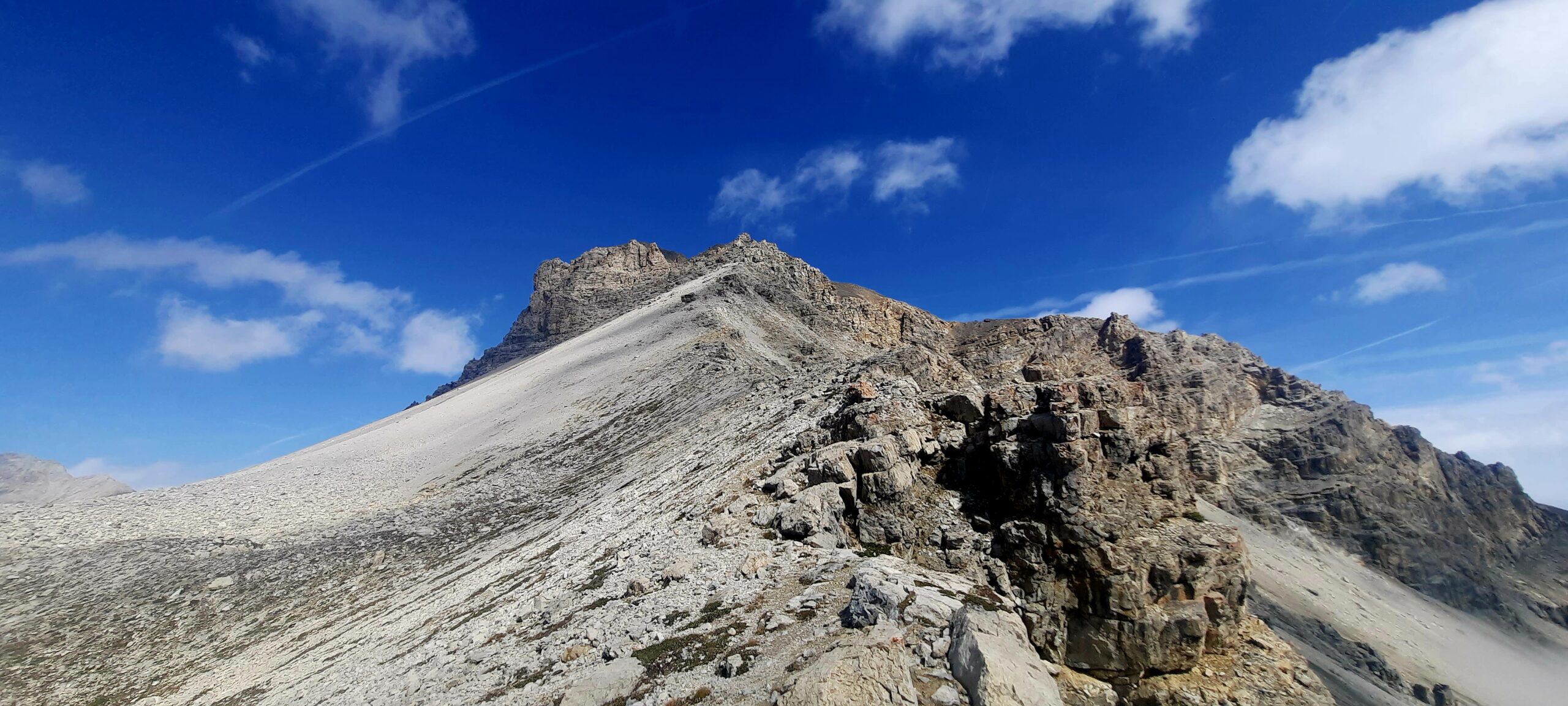 Da qui continuare per la facile cresta solcata da una traccia di sentiero ad una conca erbosa sospesa non visibile dal basso, da dove si sale per pendio erboso-detritico raggiungendo il sentiero della via normale del Passo Desertes, ben visibile in alto.