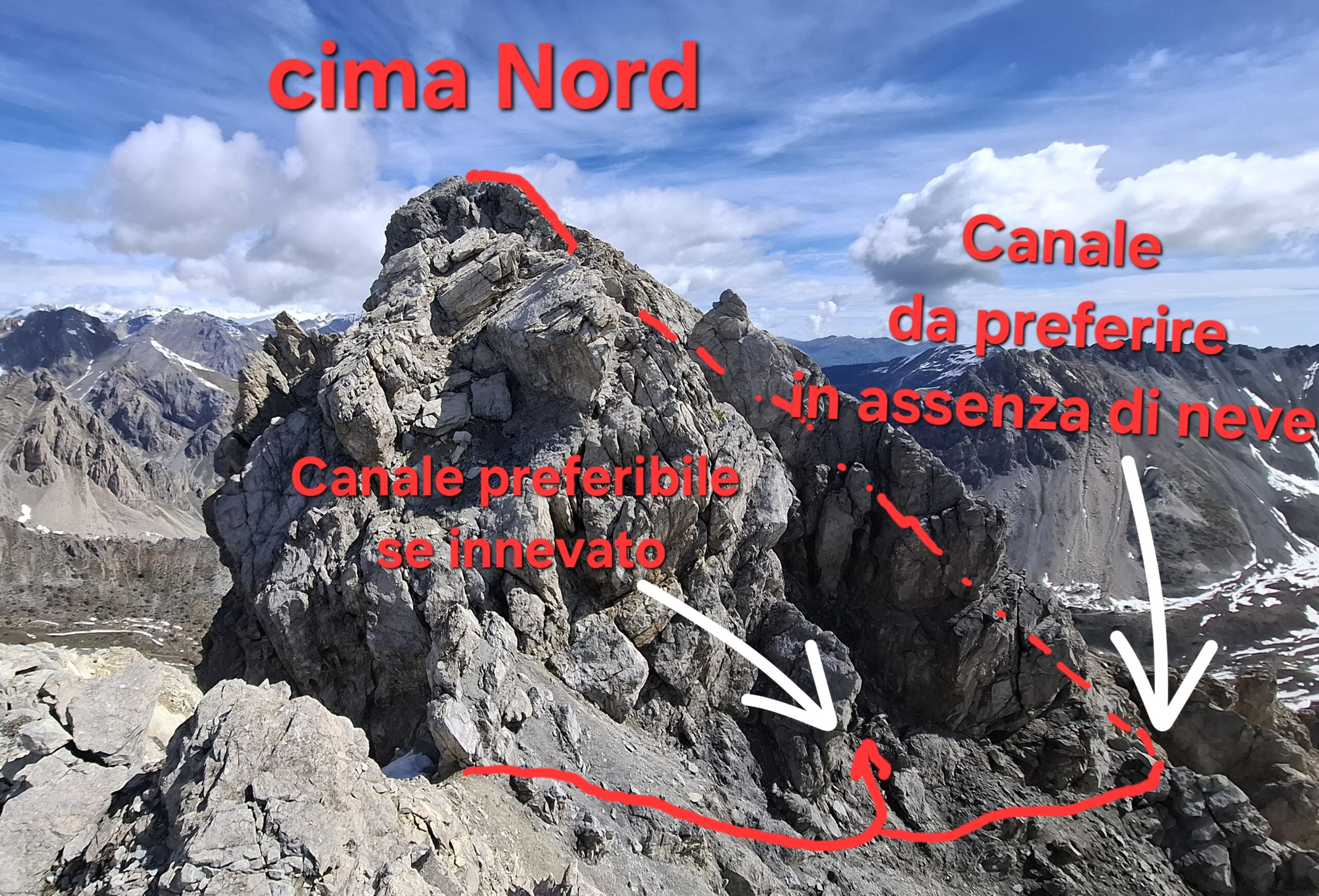Dal colletto volgendo a dx in pochi metri di facile cresta nevosa si tocca la cima Sud (segnale di pietre). Per raggiungere la cima Nord o principale occorre invece prendere a sx, aggirare un dentino roccioso e attaccare una placca con una delicata salita in diagonale ascendente da dx a sx (passo iniziale di II, poi neve a 50° per qualche metro poi 45°). Raggiunto il sommo del breve pendio, si scende un gradino, si scavalca un piccolo colletto e si rimonta la cresta finale (possibile cornice). Le difficoltà dipendono dal grado di innevamento e dalla consistenza della neve).