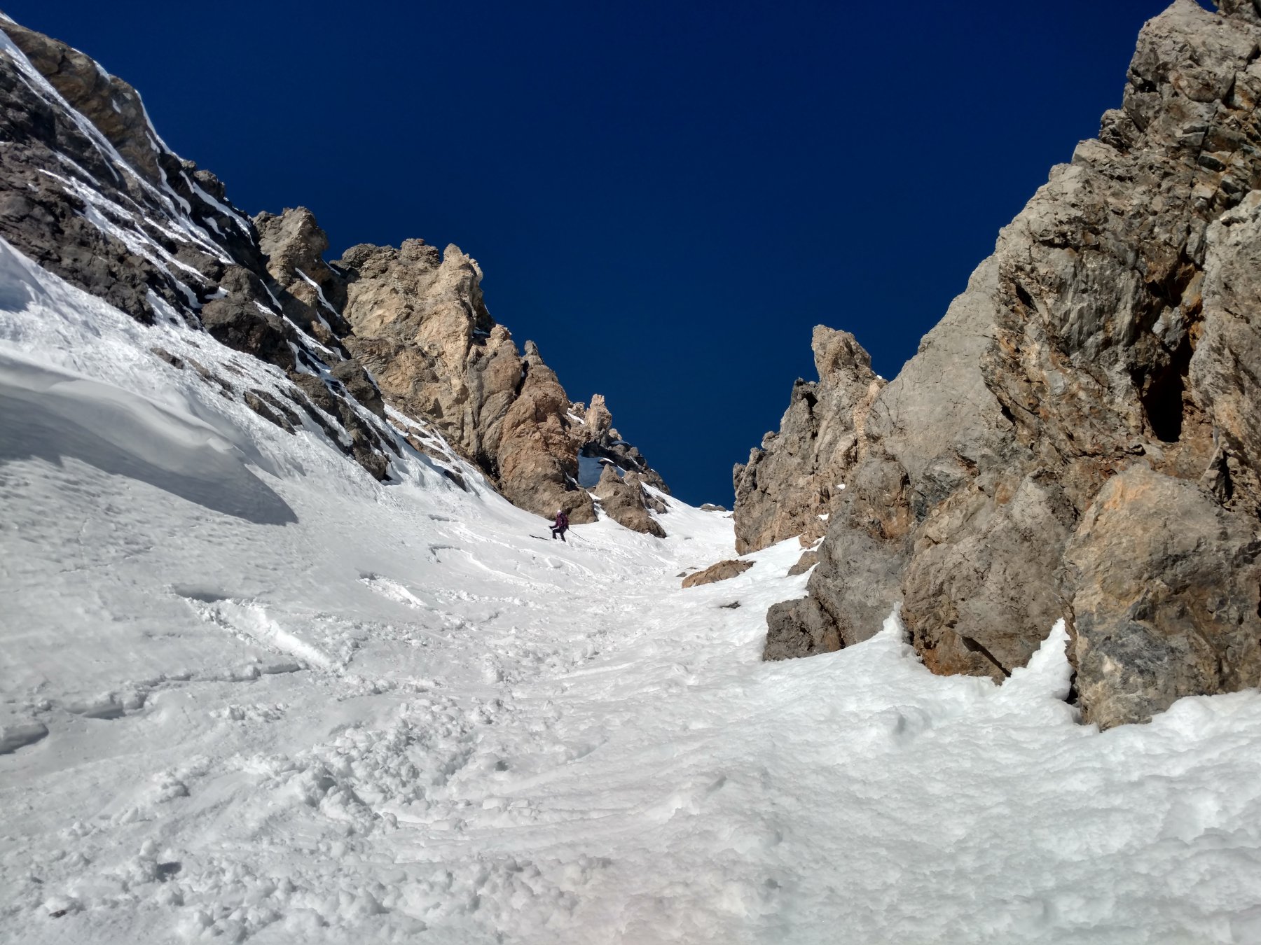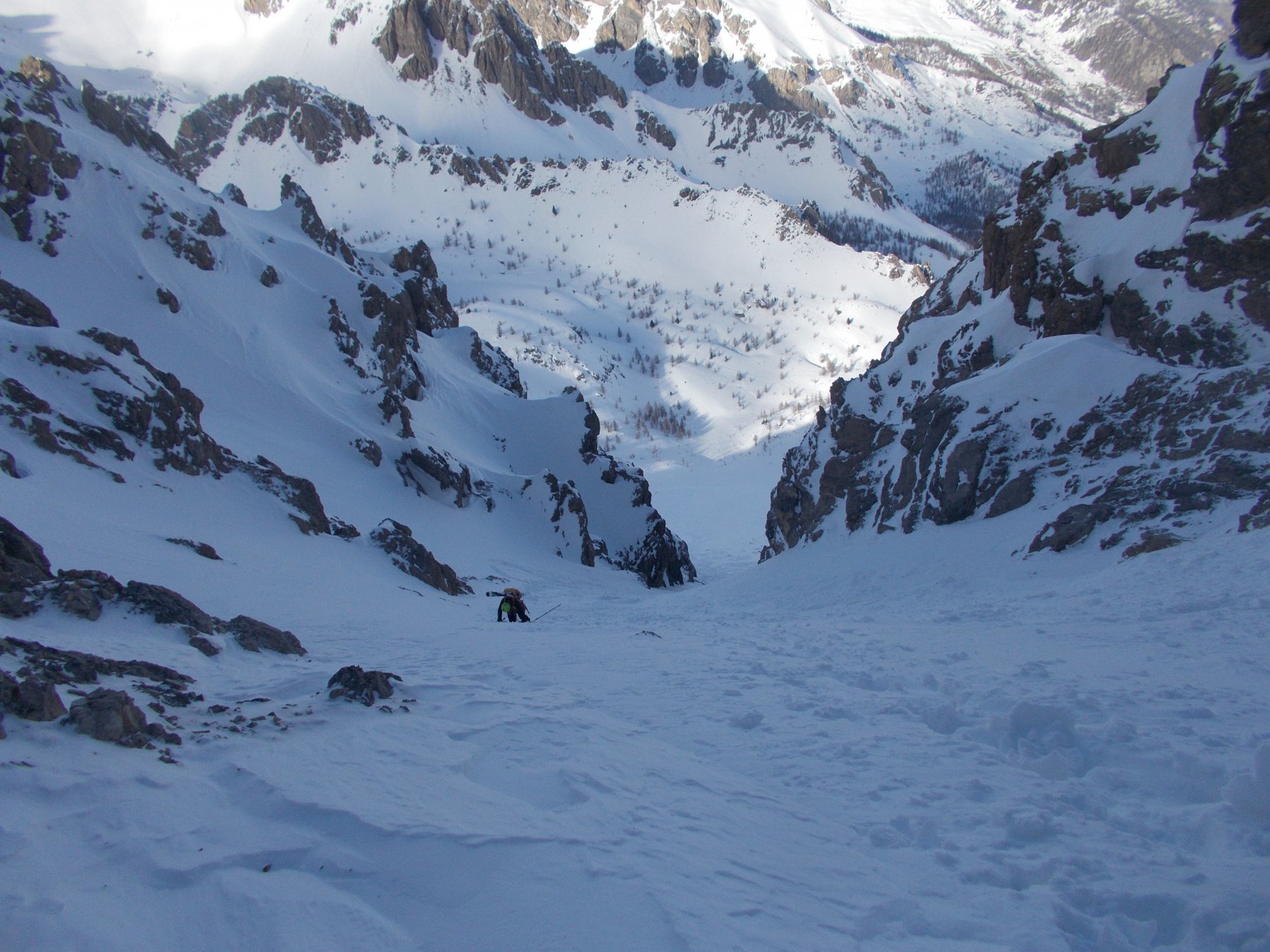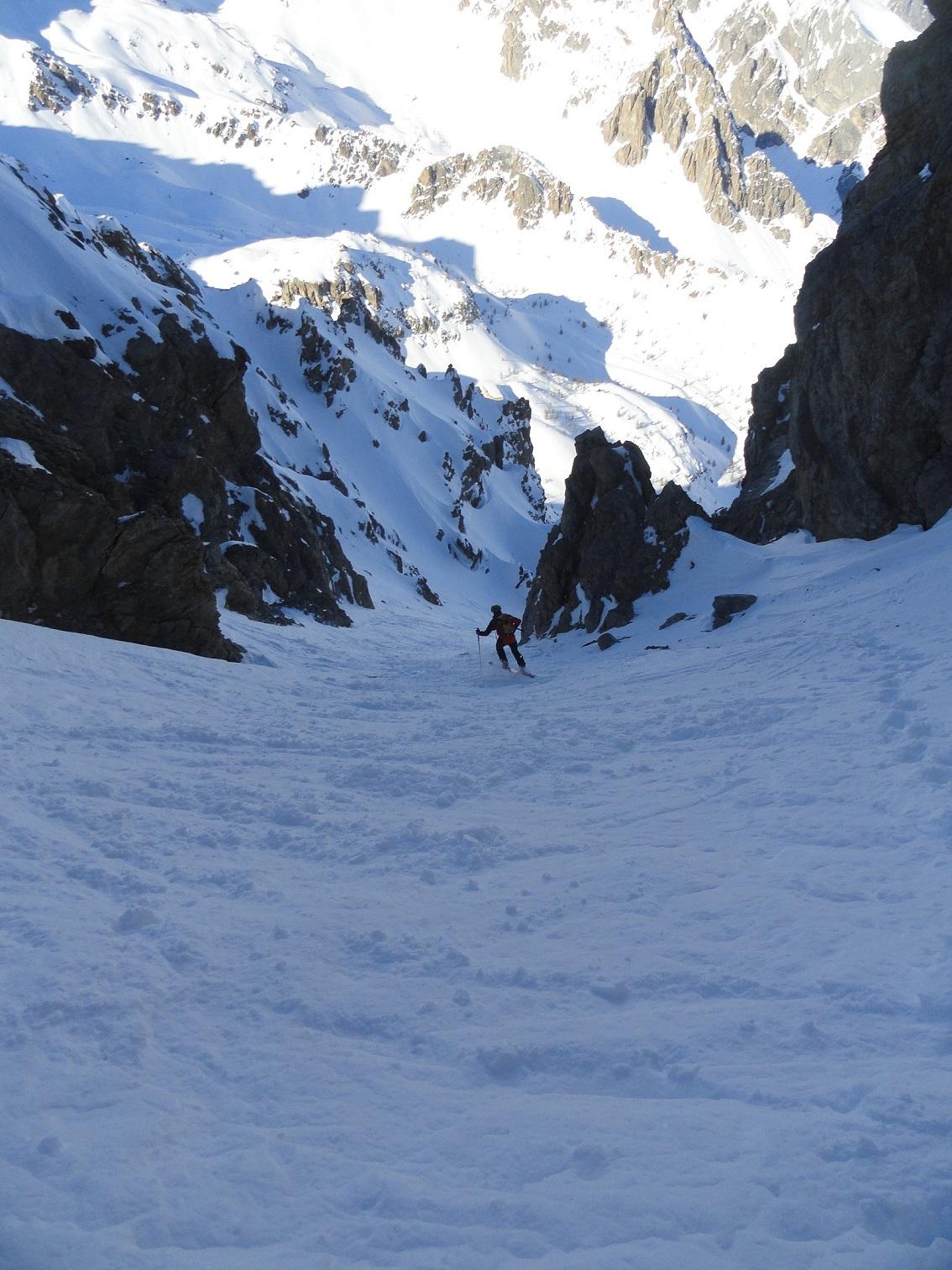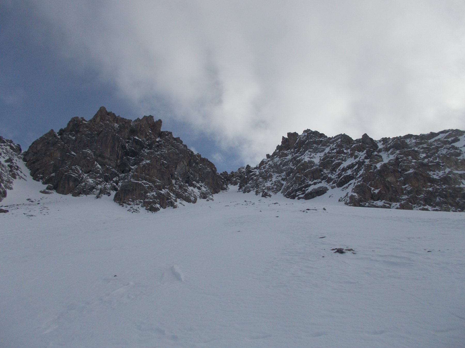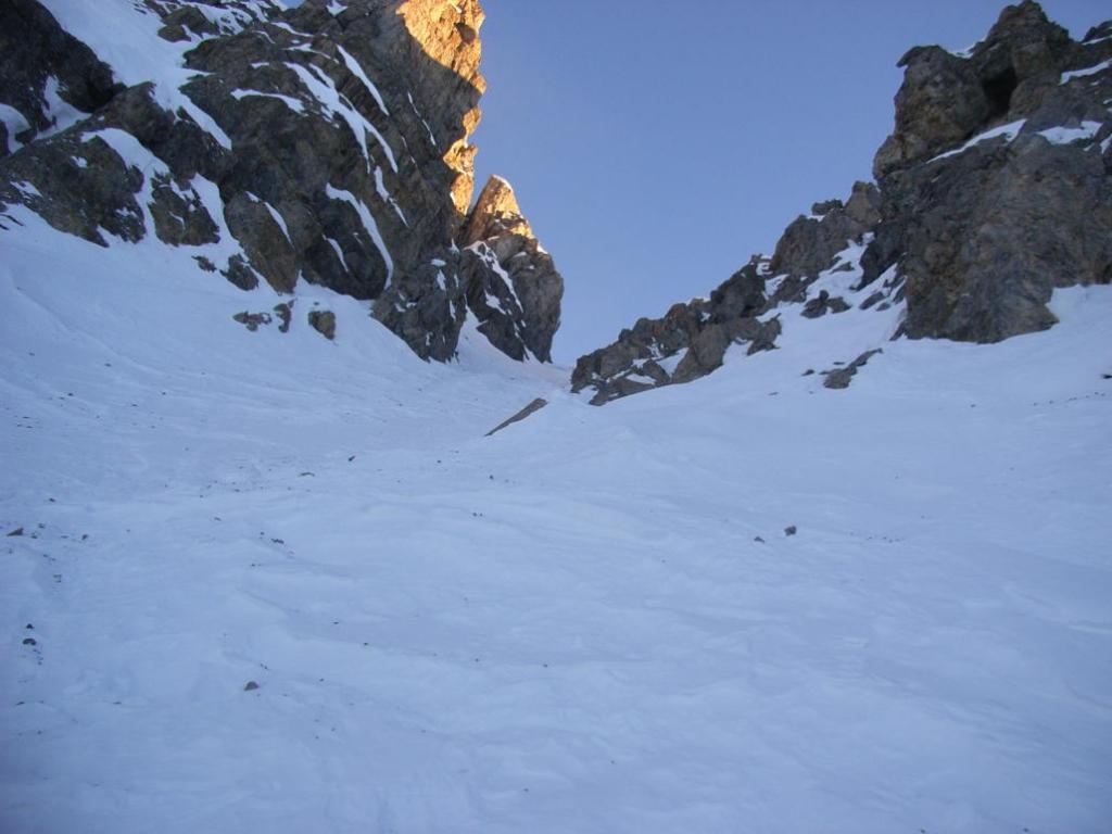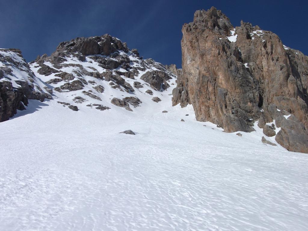 Raggiunta la quota 2150 piegare a sx e risalire l’evidente conoide di iniziazione sui 30/35° per 300m e in seguito il canale fino alla Breche 250m pend 40° max, a breve distanza dalla vetta sud, raggiungibile sulla sx con pochi metri di facile cresta.