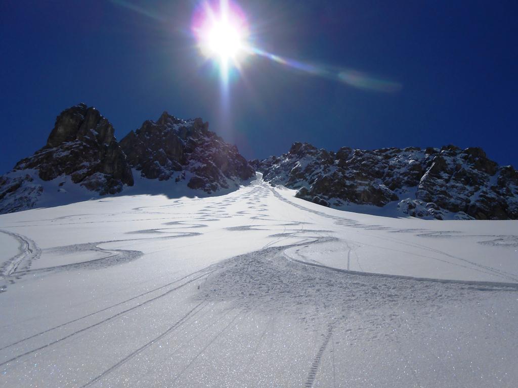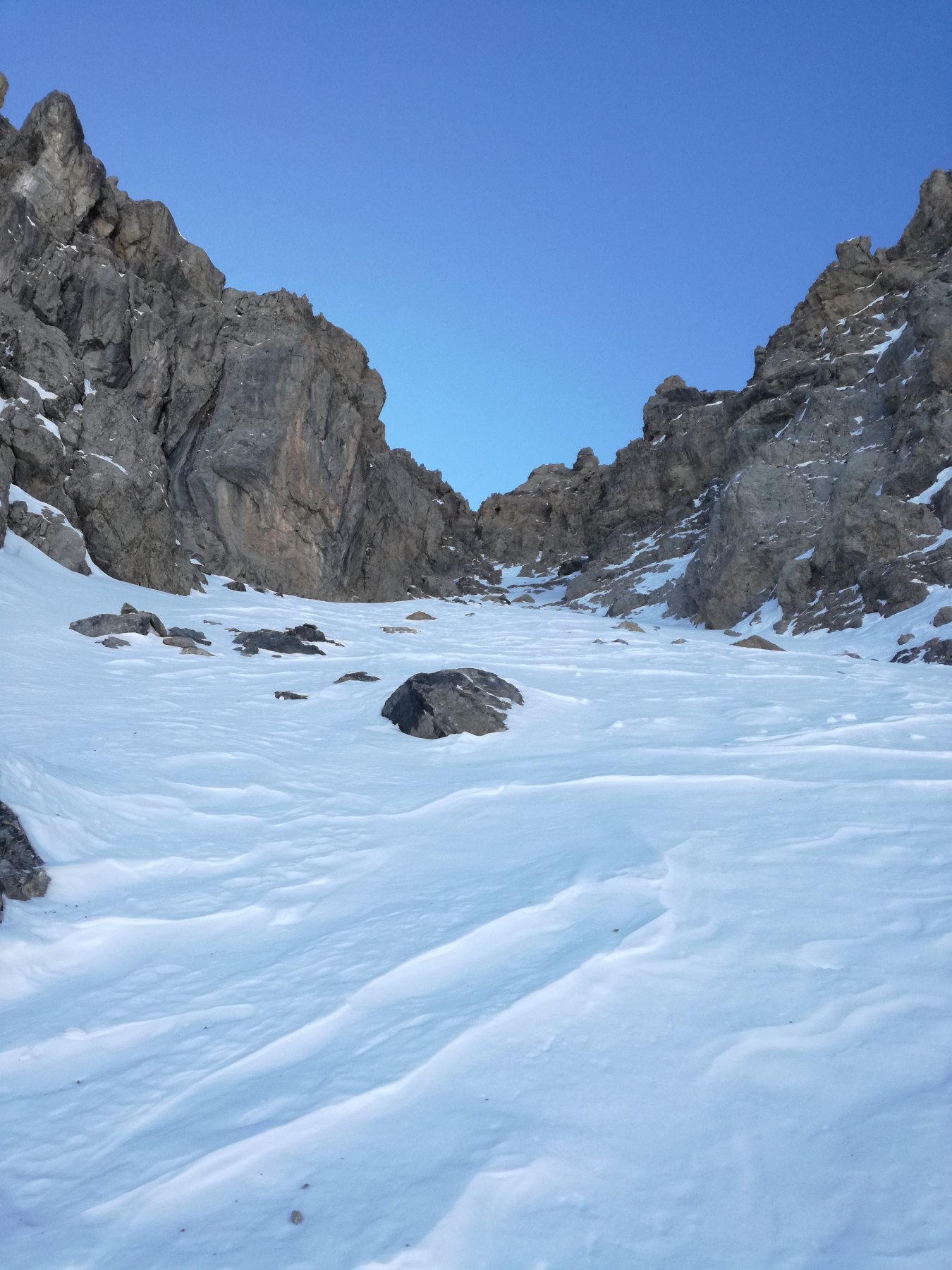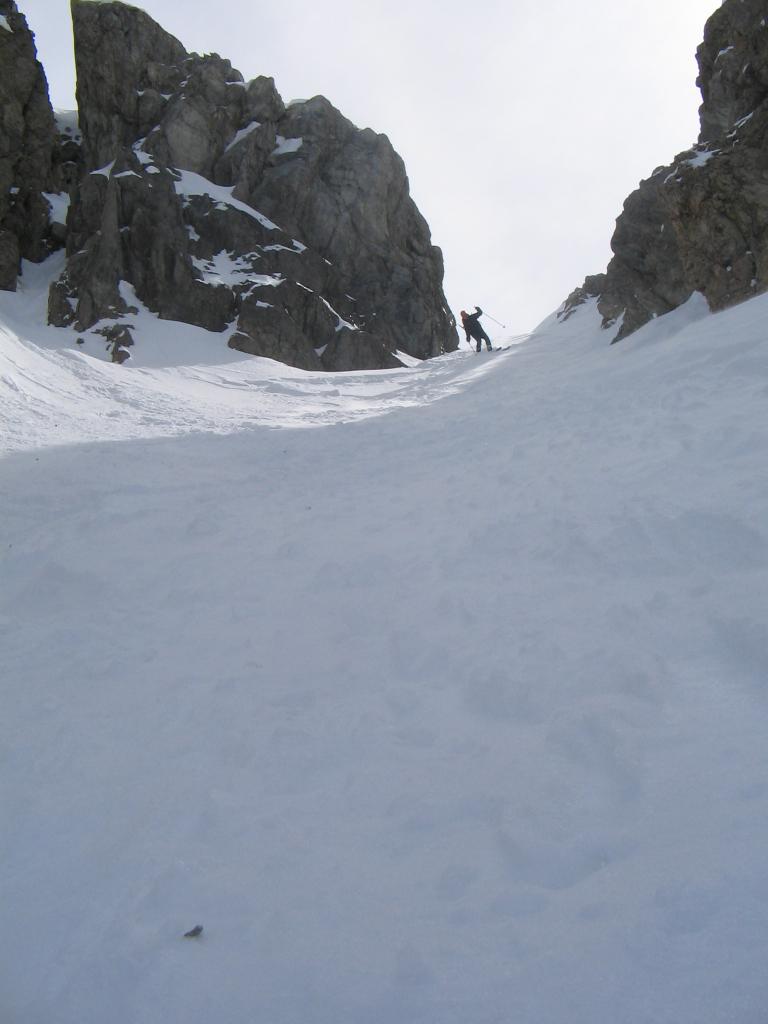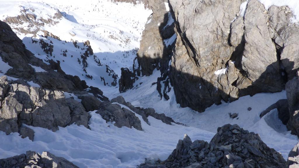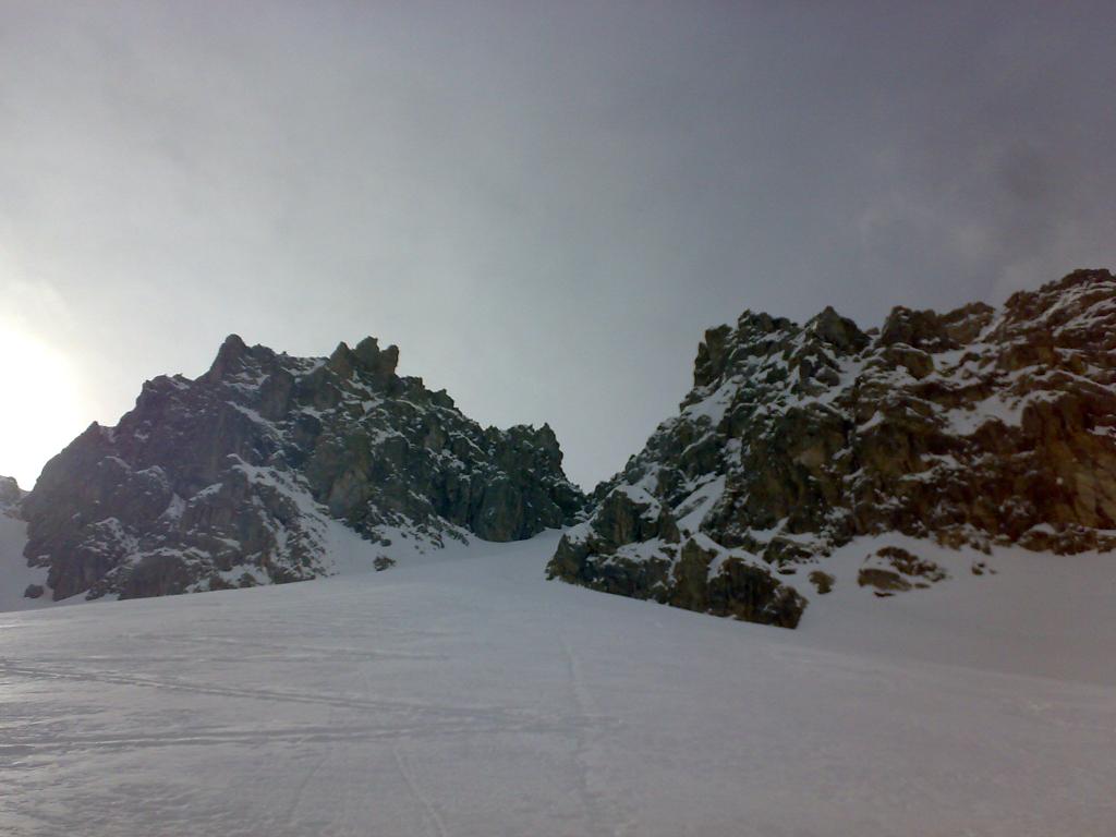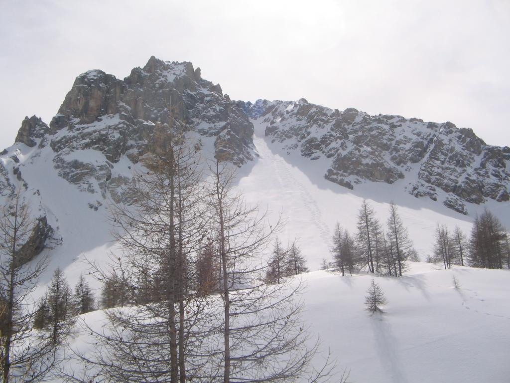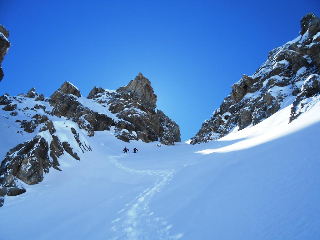 Raggiunta la quota 2150 piegare a sx e risalire l’evidente conoide di iniziazione sui 30/35° per 300m e in seguito il canale fino alla Breche 250m pend 40° max, a breve distanza dalla vetta sud, raggiungibile sulla sx con pochi metri di facile cresta.