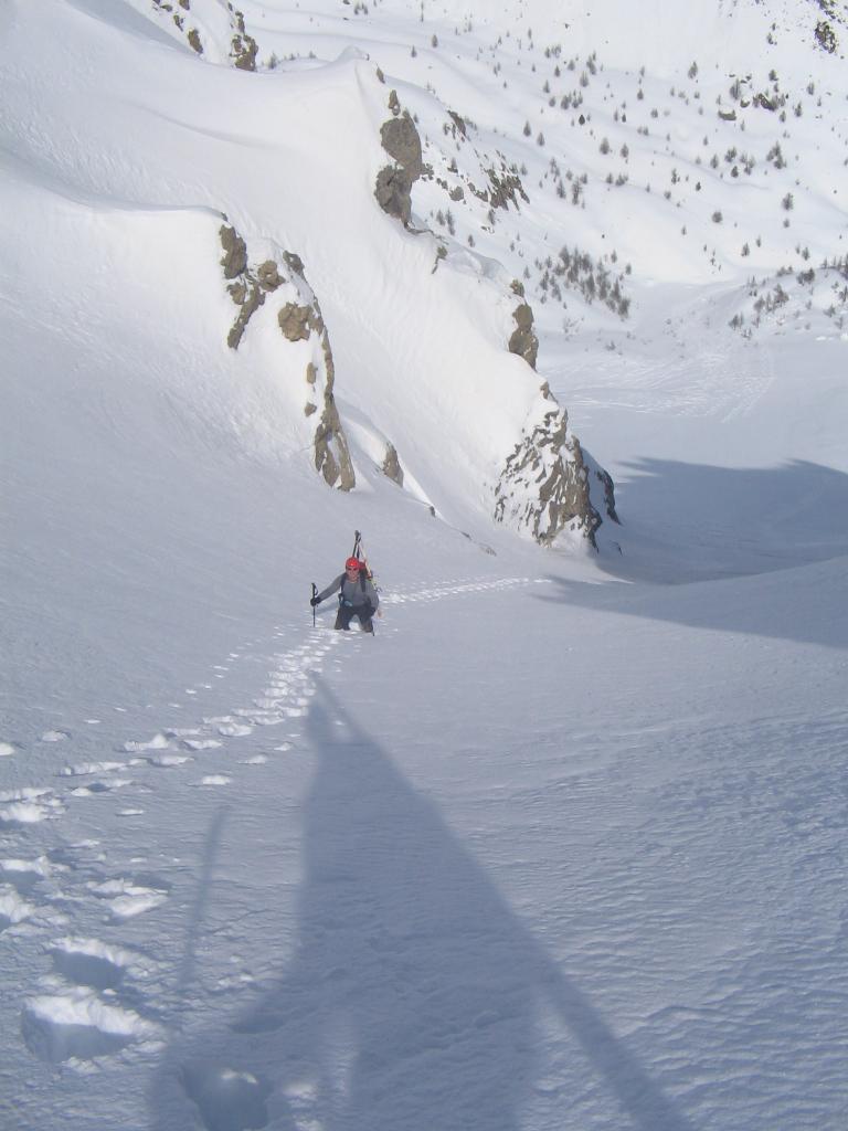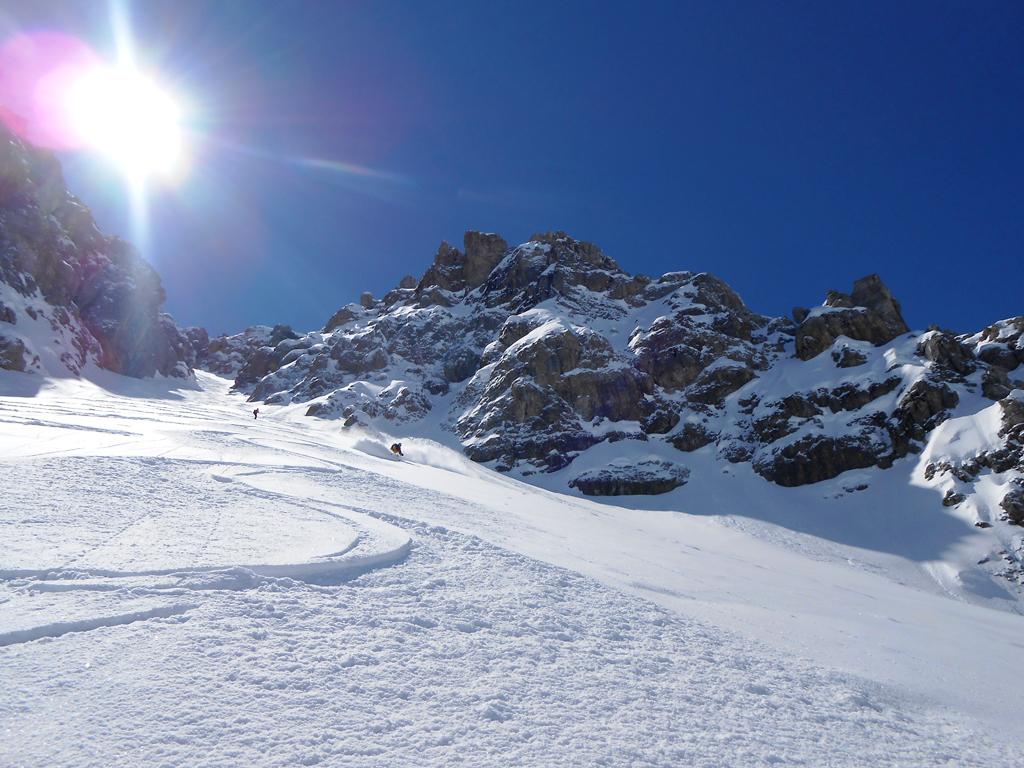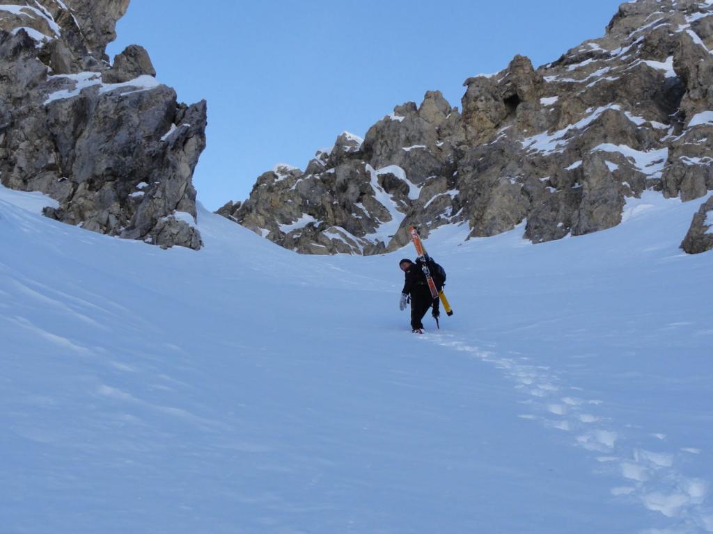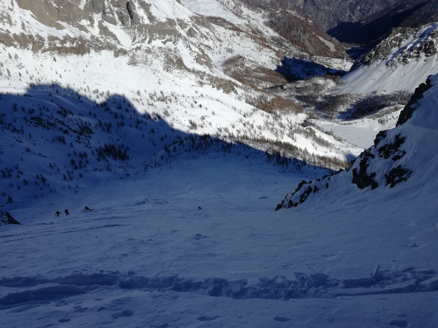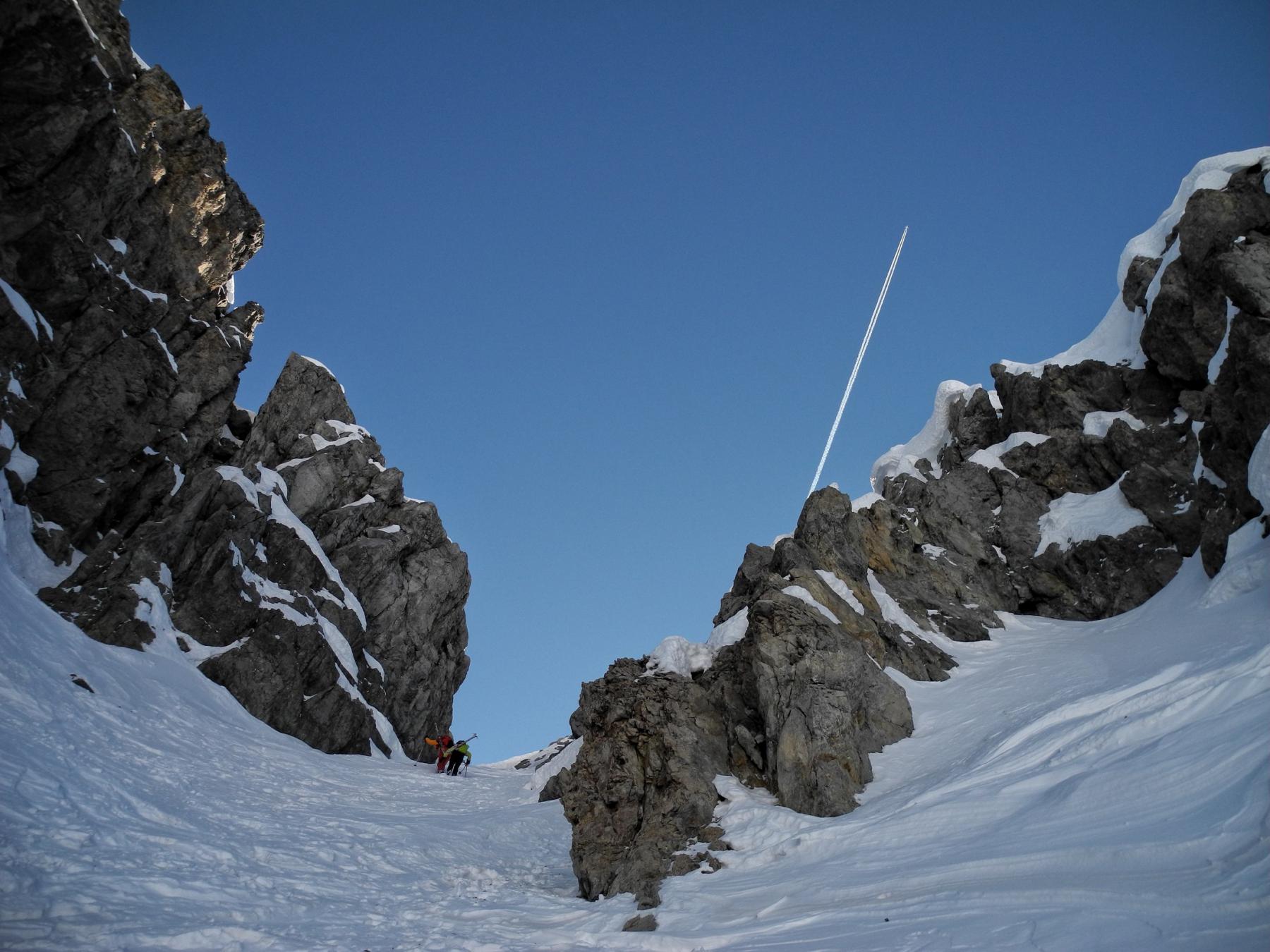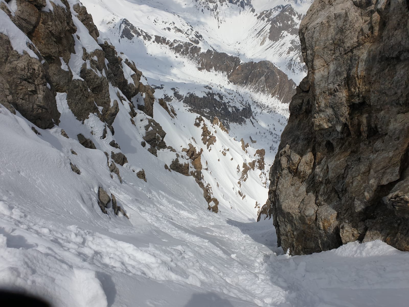 Raggiunta la quota 2150 piegare a sx e risalire l’evidente conoide di iniziazione sui 30/35° per 300m e in seguito il canale fino alla Breche 250m pend 40° max, a breve distanza dalla vetta sud, raggiungibile sulla sx con pochi metri di facile cresta.