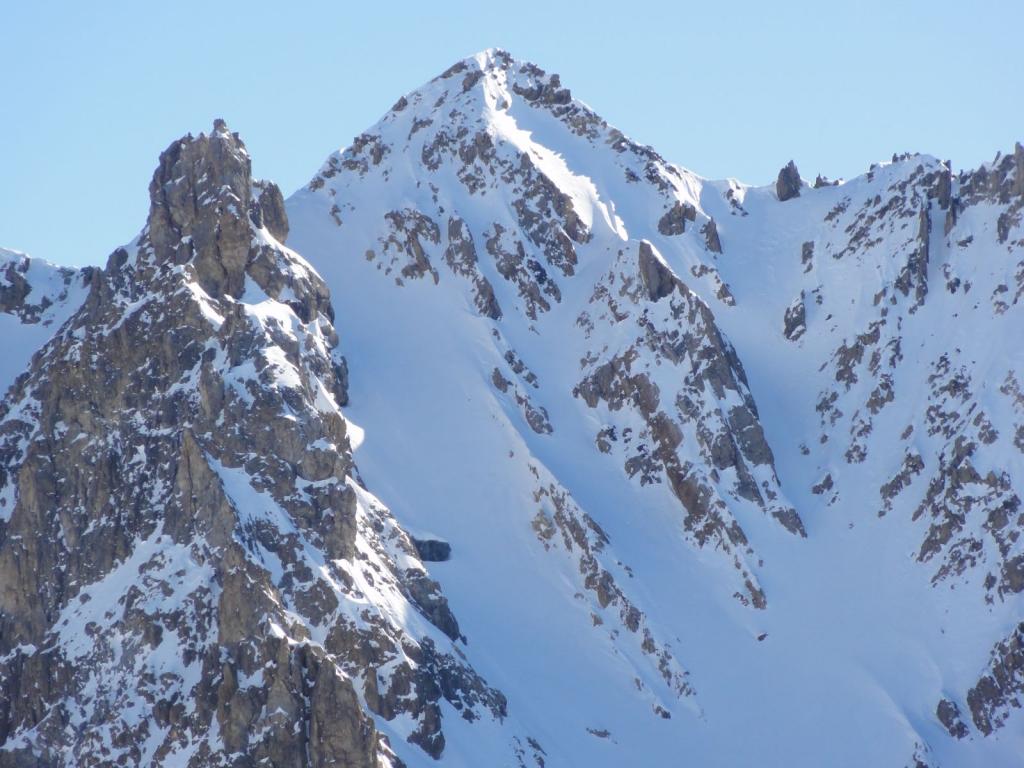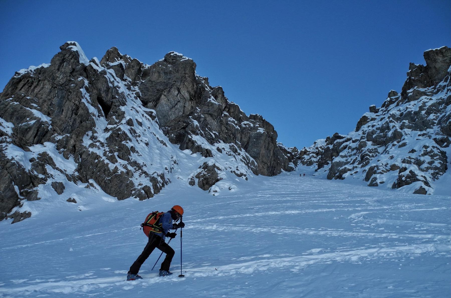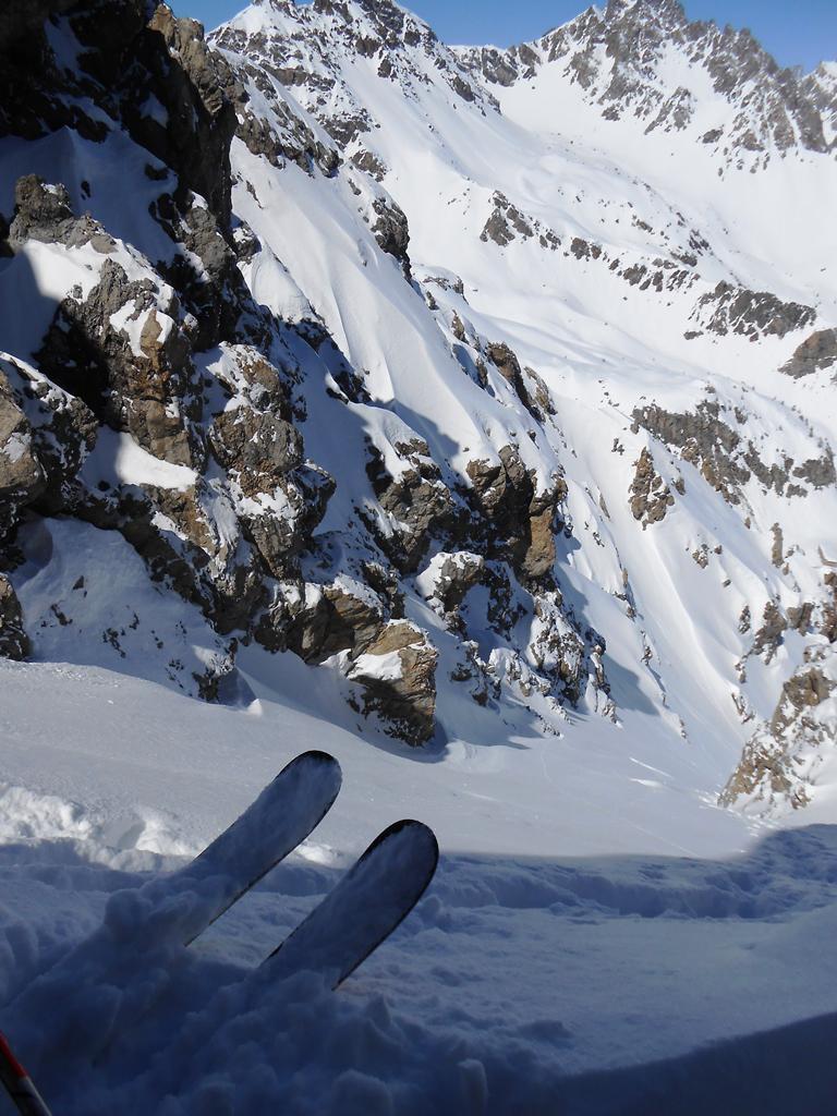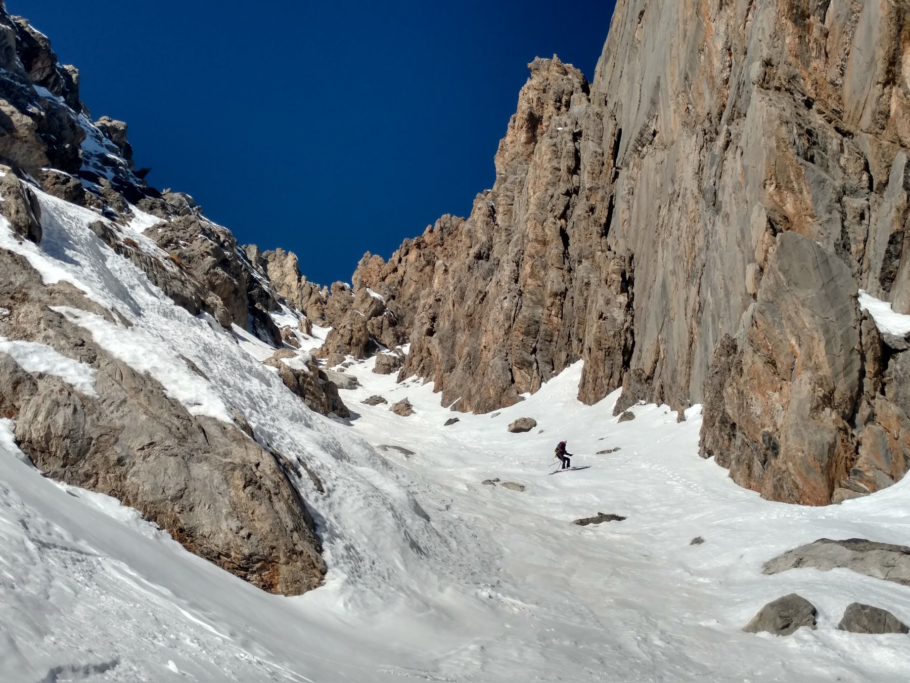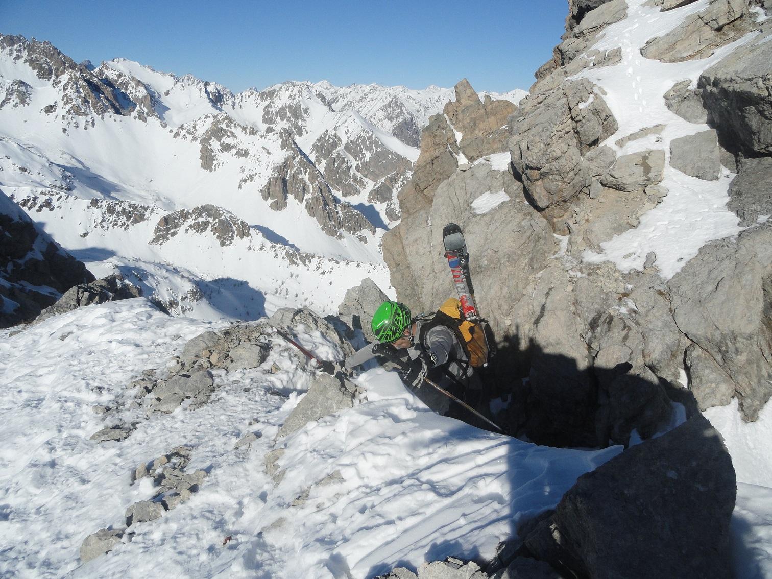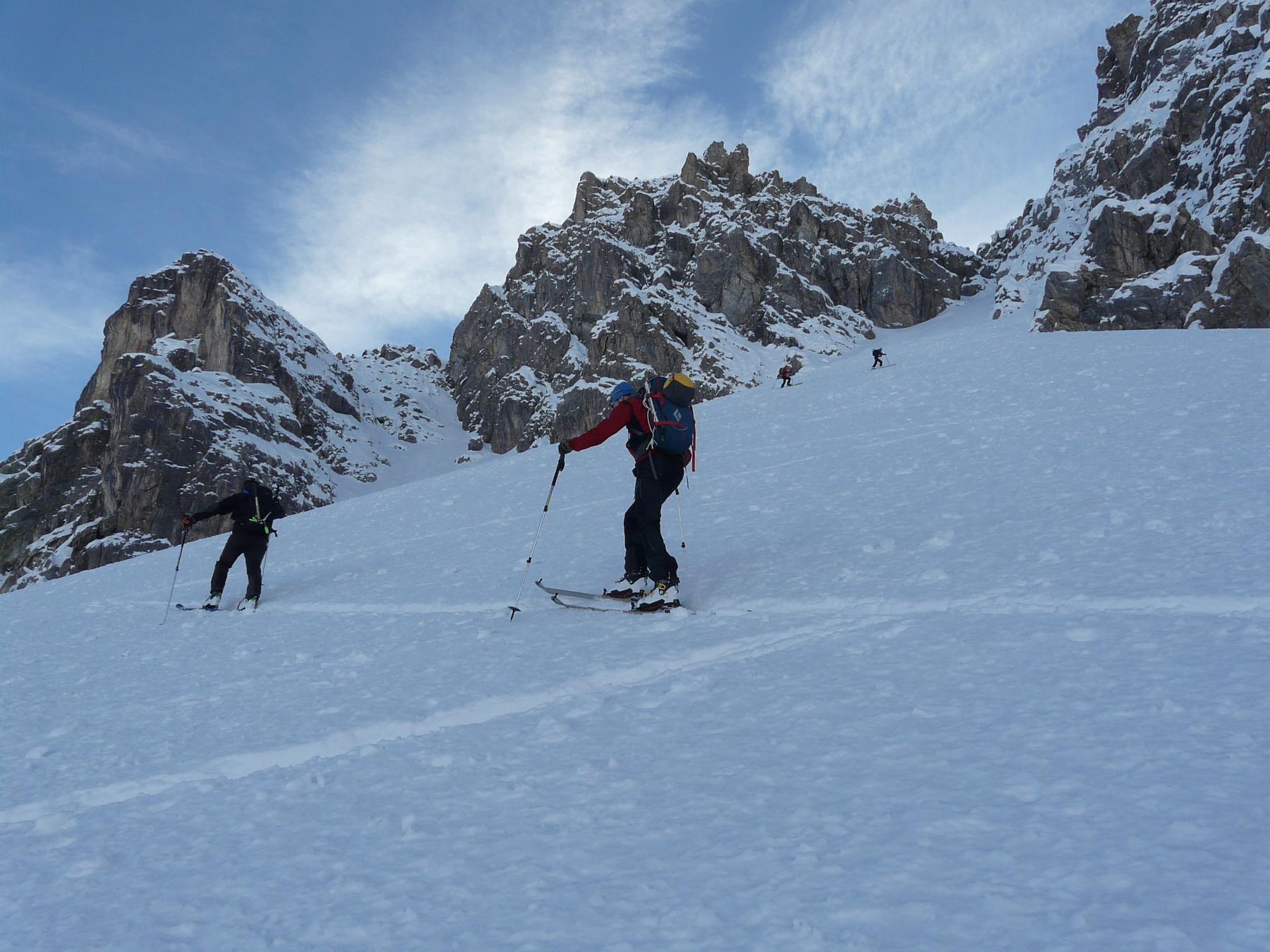 Raggiunta la quota 2150 piegare a sx e risalire l’evidente conoide di iniziazione sui 30/35° per 300m e in seguito il canale fino alla Breche 250m pend 40° max, a breve distanza dalla vetta sud, raggiungibile sulla sx con pochi metri di facile cresta.