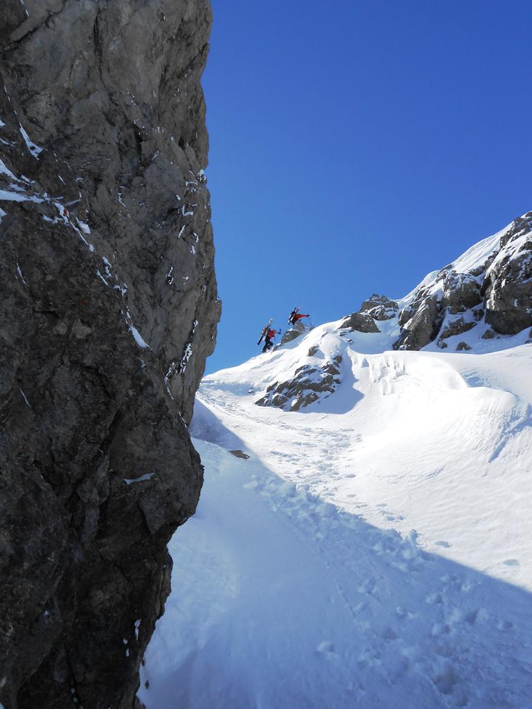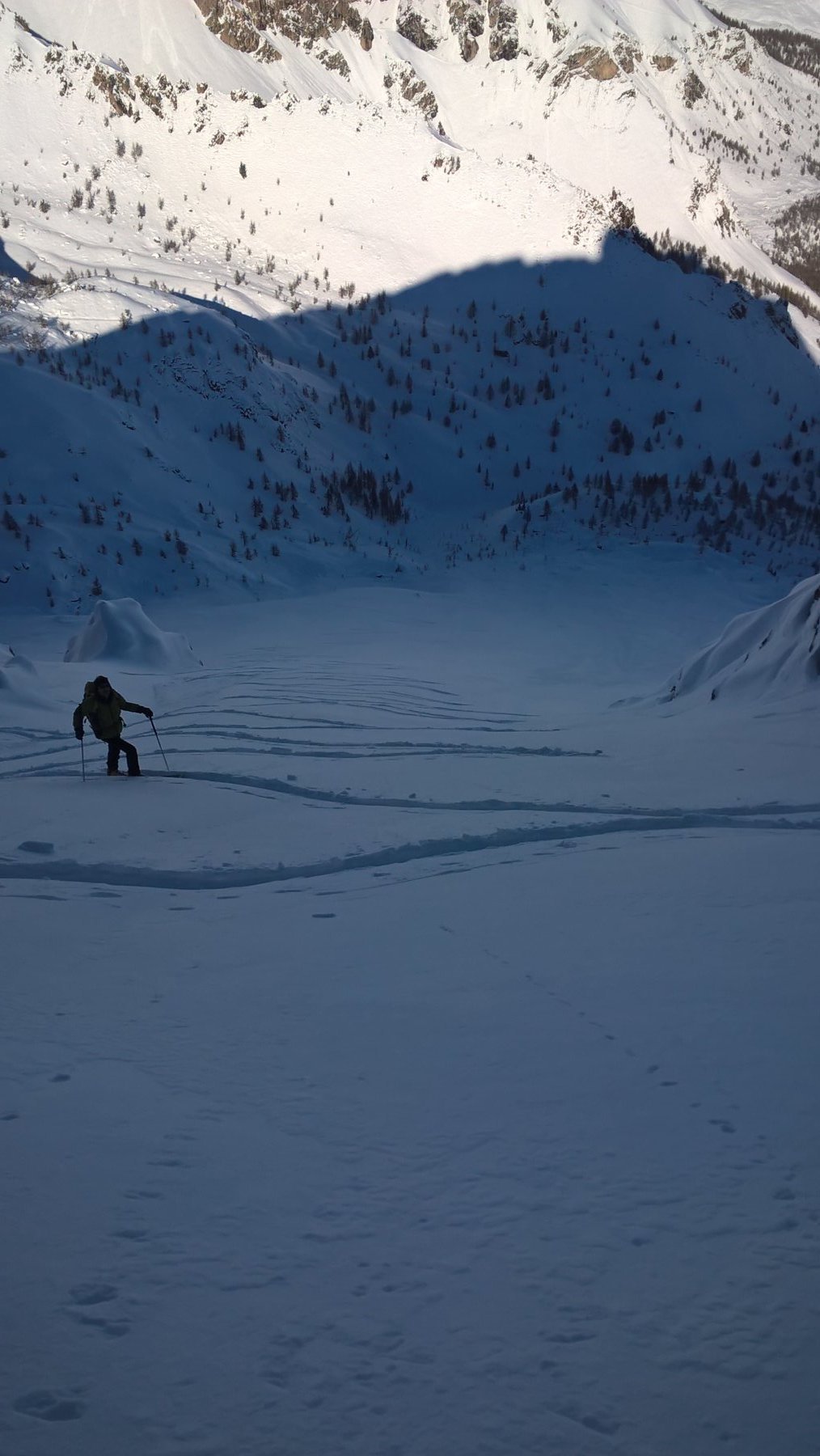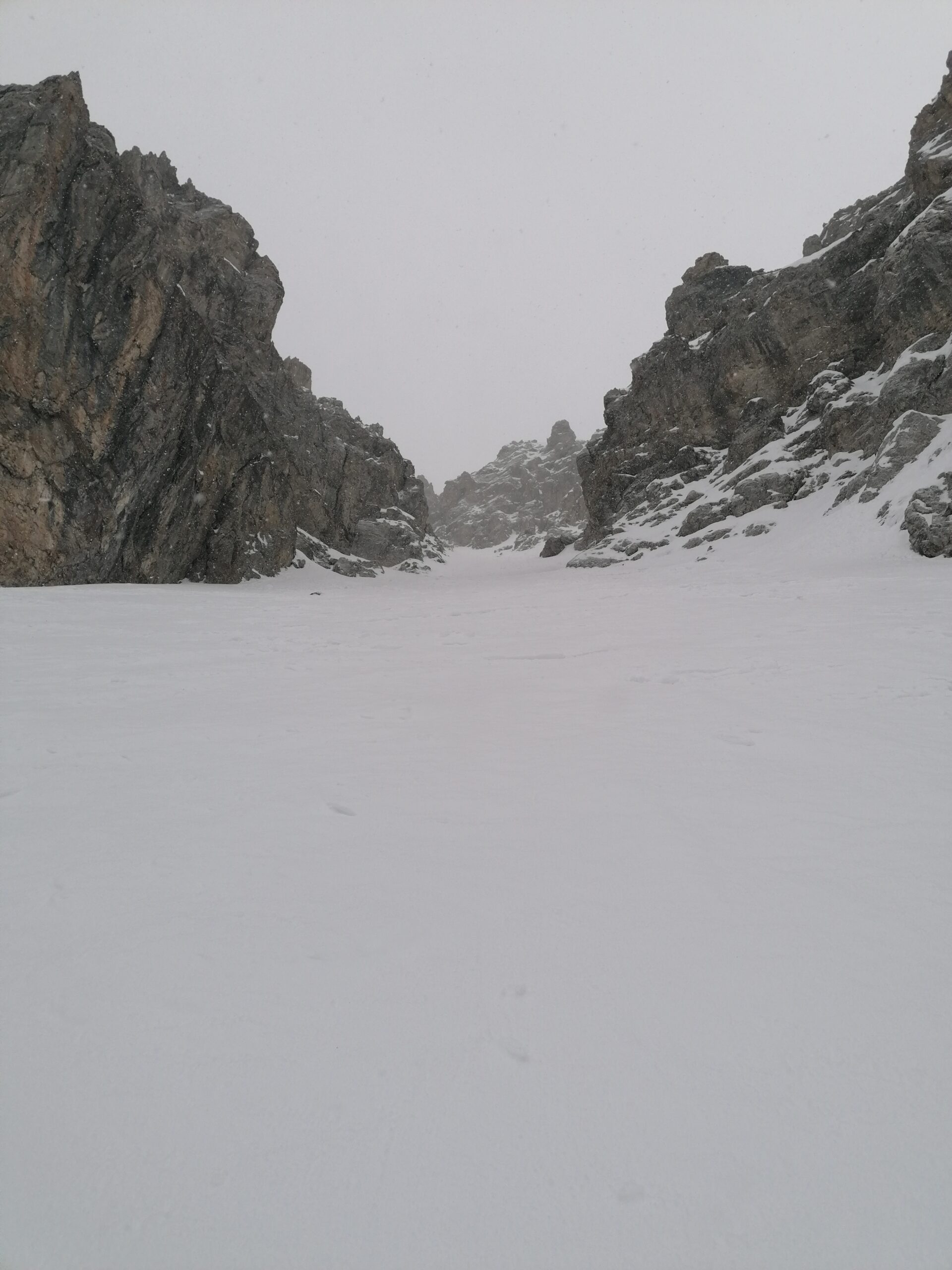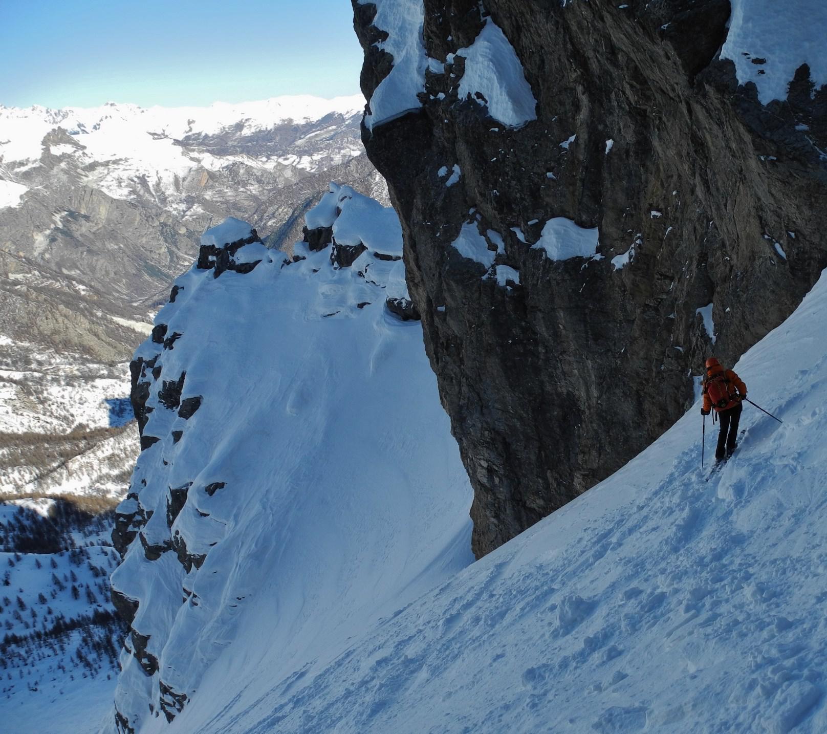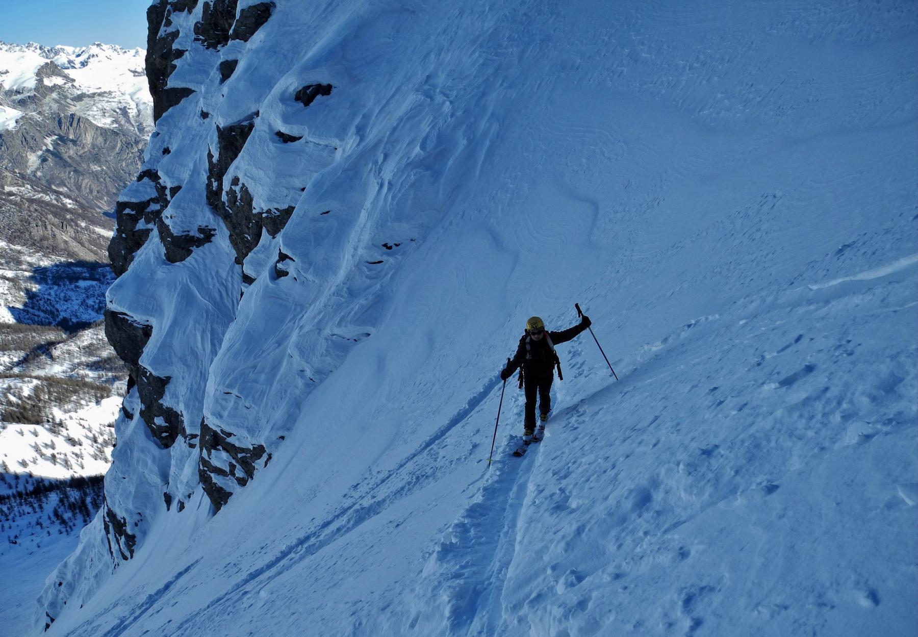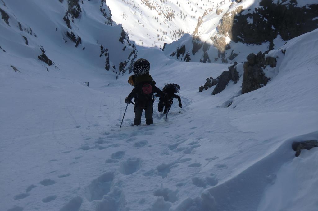 Raggiunta la quota 2150 piegare a sx e risalire l’evidente conoide di iniziazione sui 30/35° per 300m e in seguito il canale fino alla Breche 250m pend 40° max, a breve distanza dalla vetta sud, raggiungibile sulla sx con pochi metri di facile cresta.