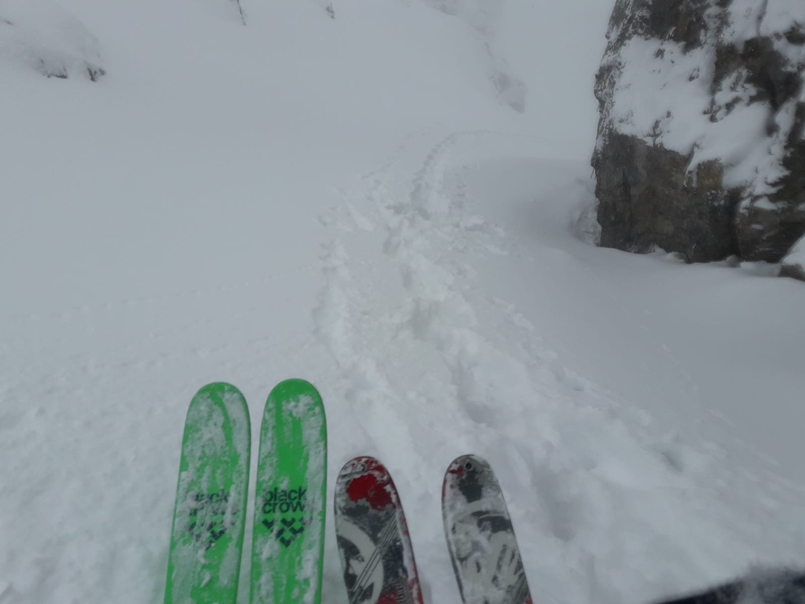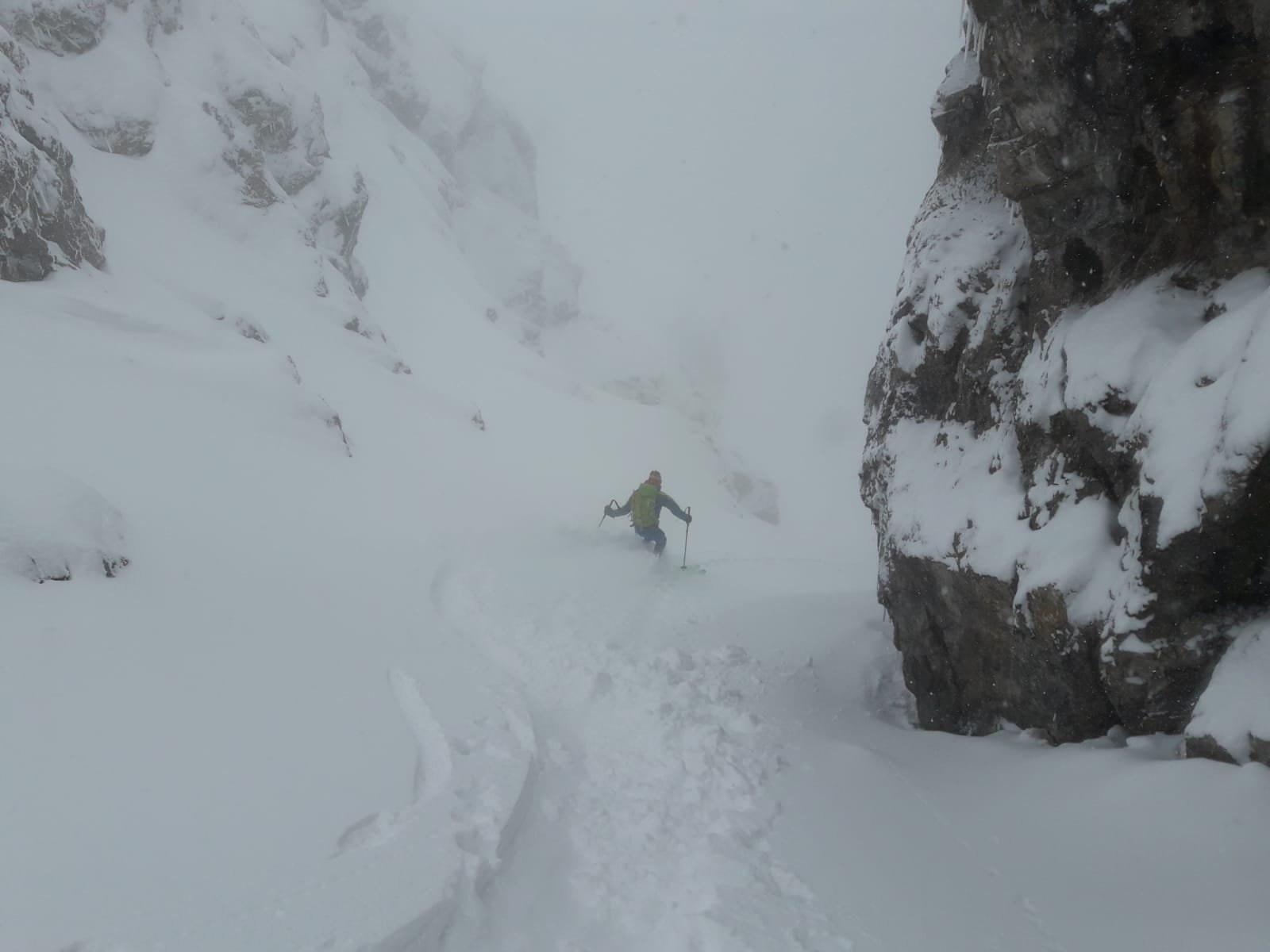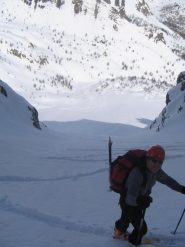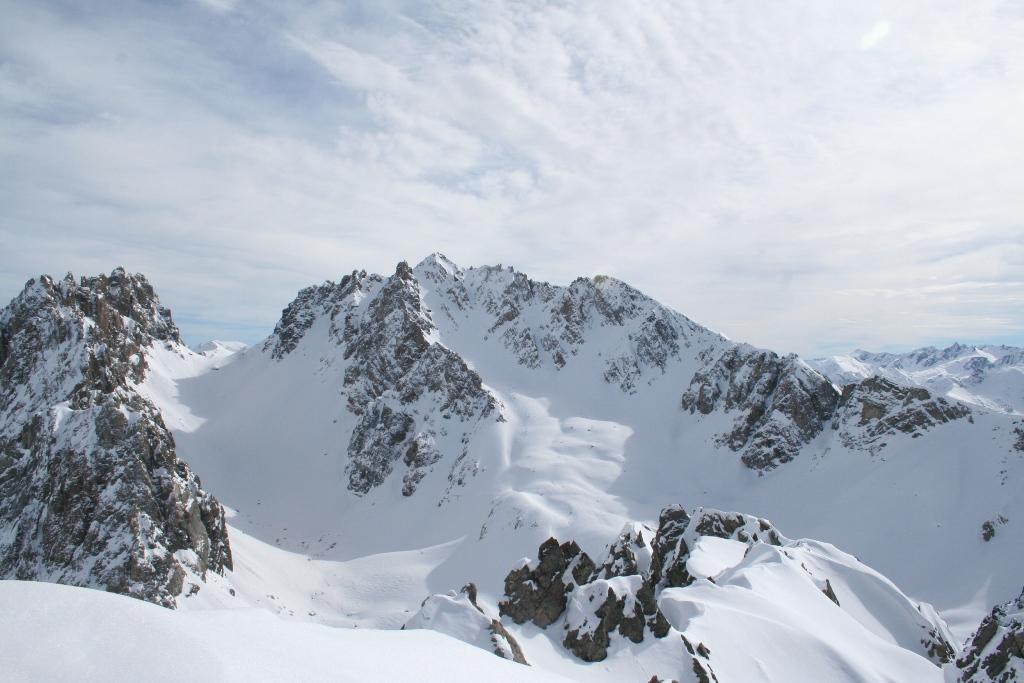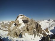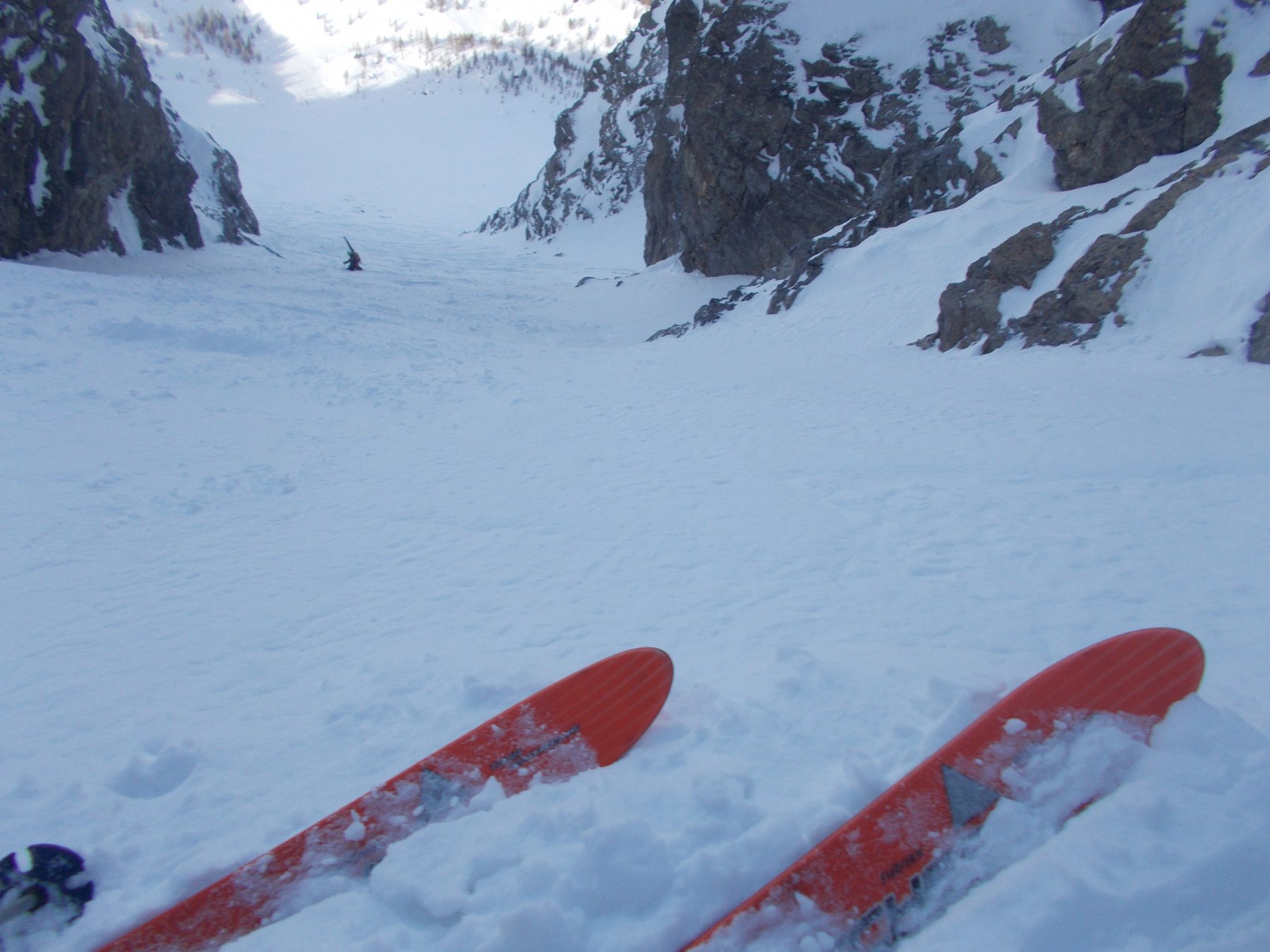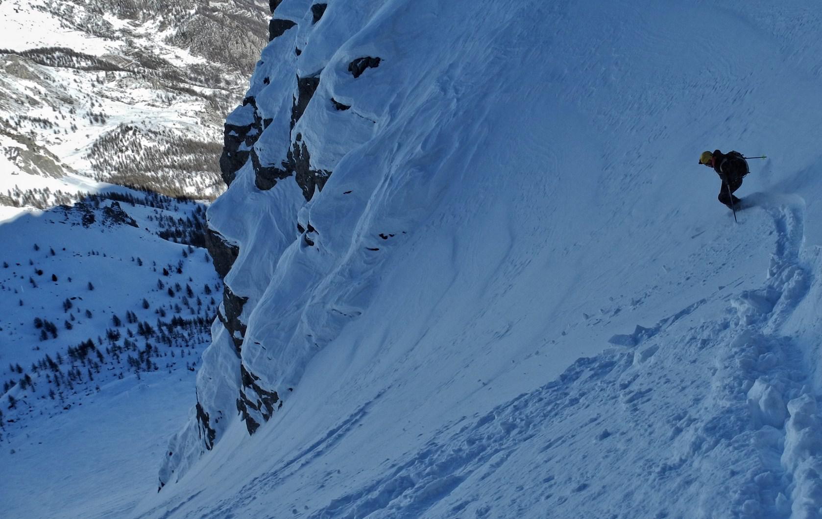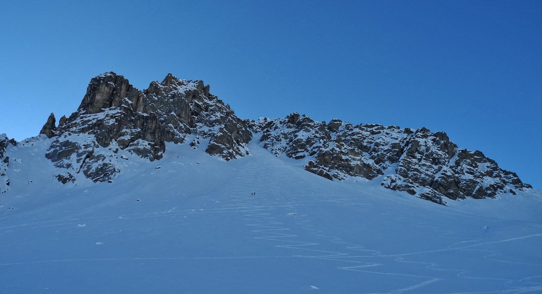 Raggiunta la quota 2150 piegare a sx e risalire l’evidente conoide di iniziazione sui 30/35° per 300m e in seguito il canale fino alla Breche 250m pend 40° max, a breve distanza dalla vetta sud, raggiungibile sulla sx con pochi metri di facile cresta.