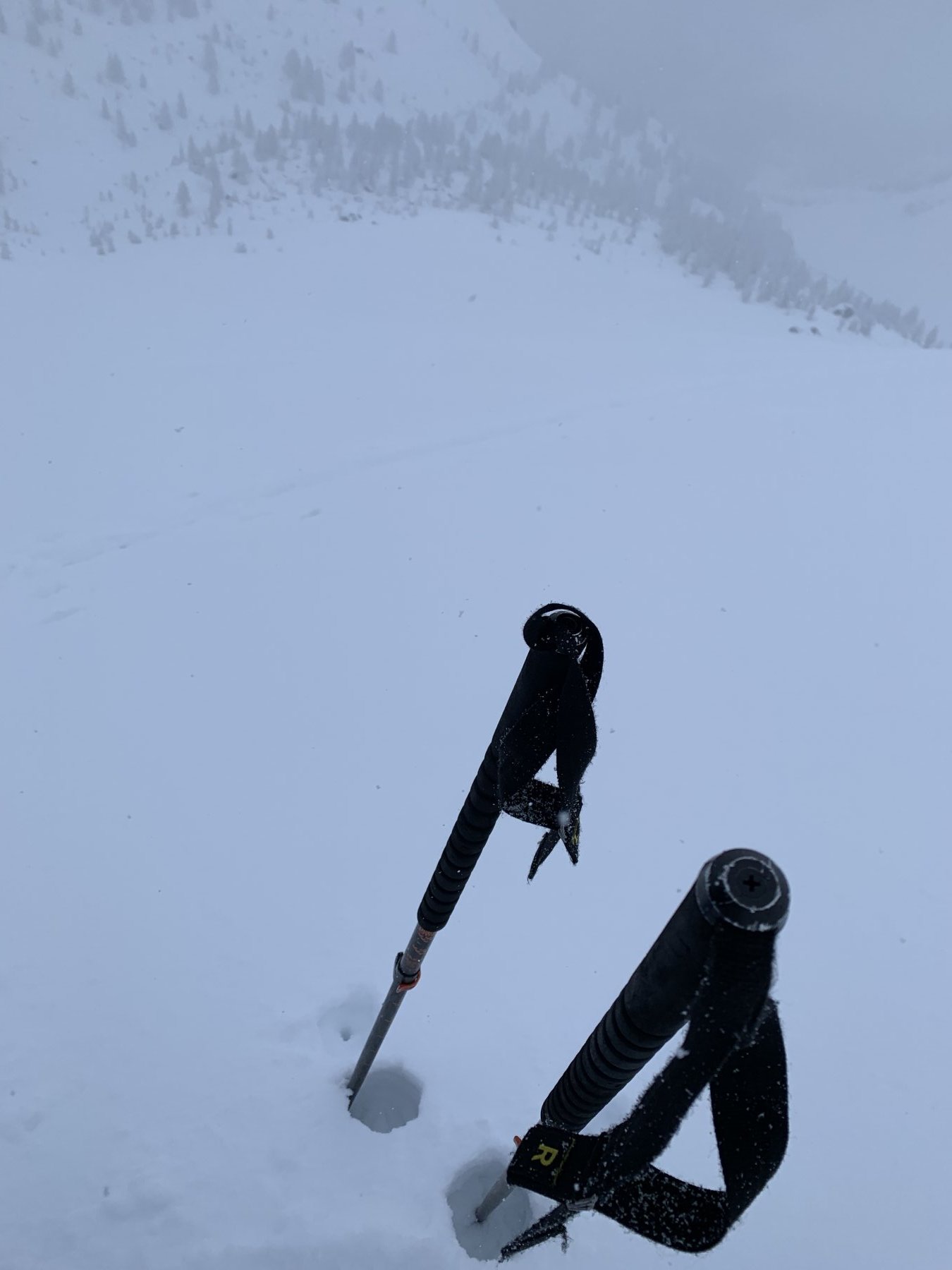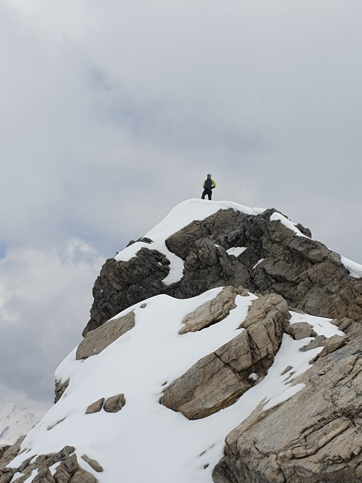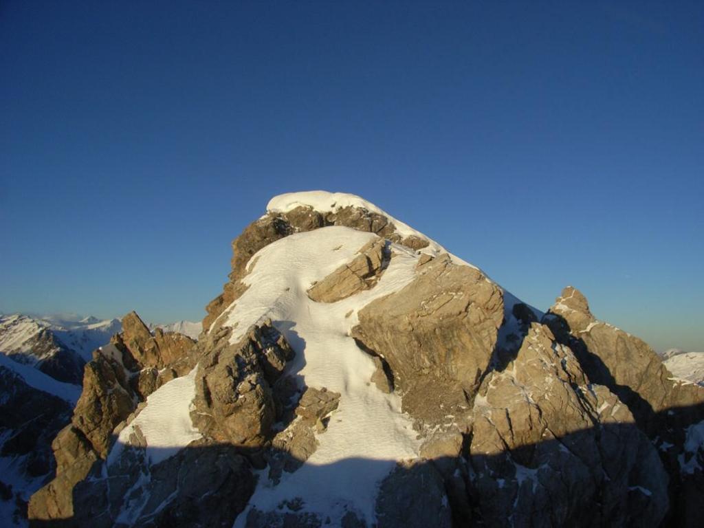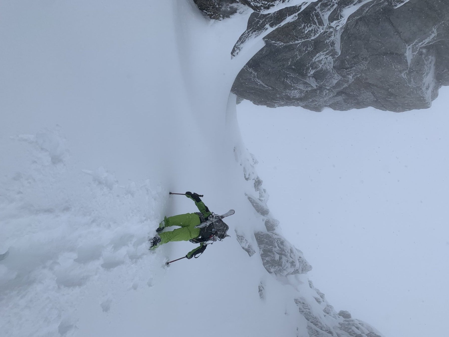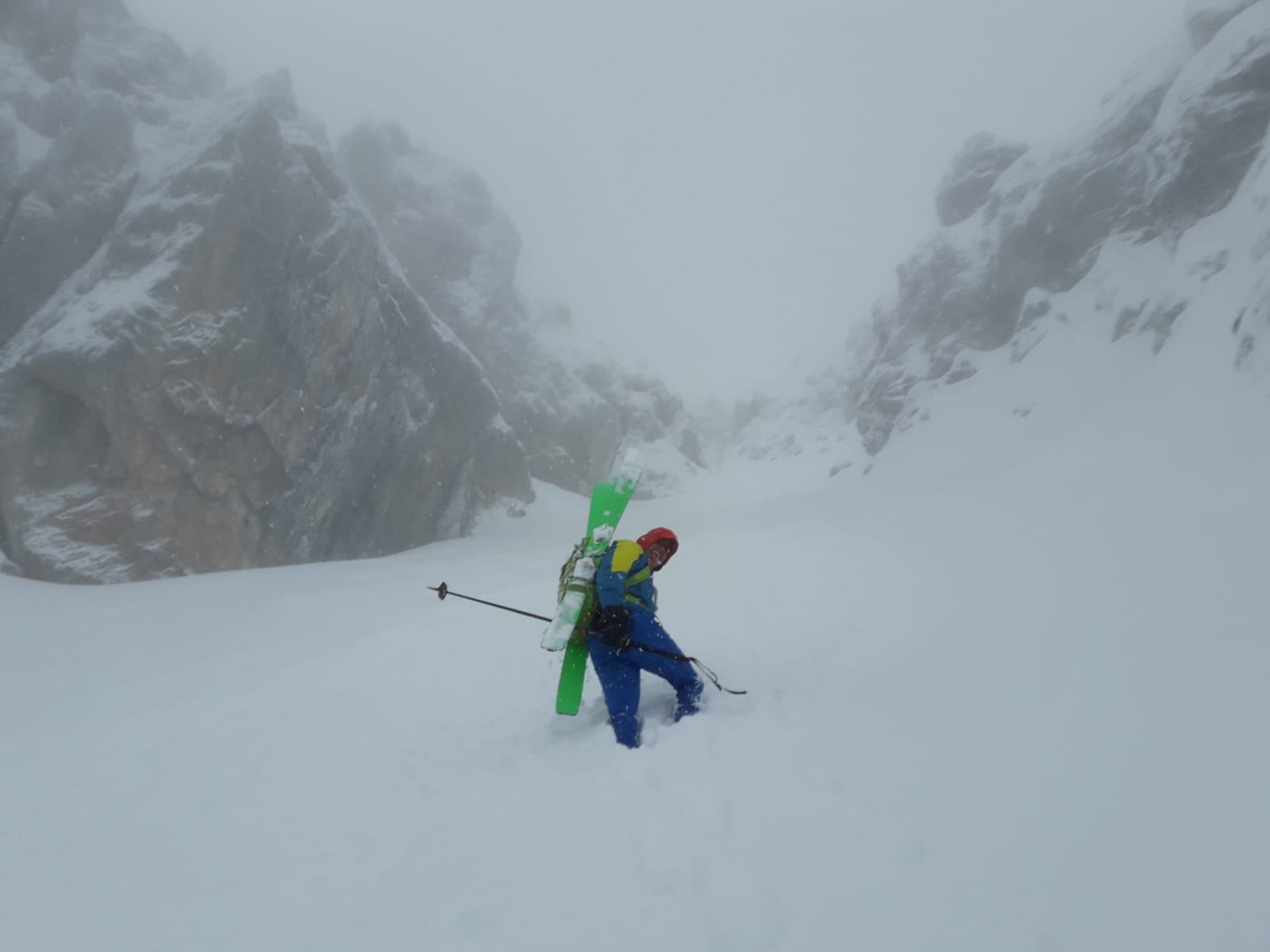 Raggiunta la quota 2150 piegare a sx e risalire l’evidente conoide di iniziazione sui 30/35° per 300m e in seguito il canale fino alla Breche 250m pend 40° max, a breve distanza dalla vetta sud, raggiungibile sulla sx con pochi metri di facile cresta.