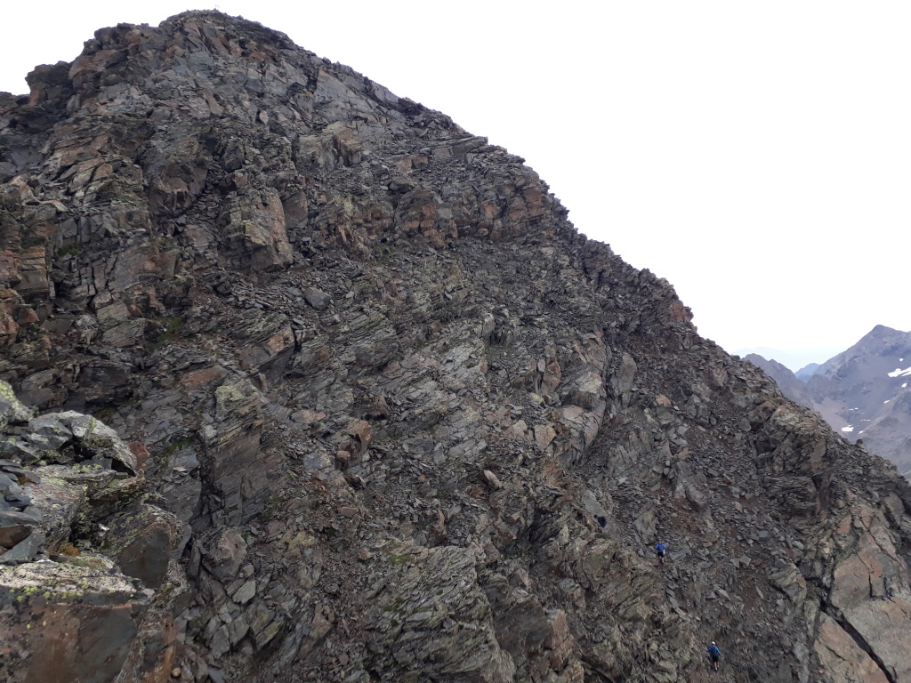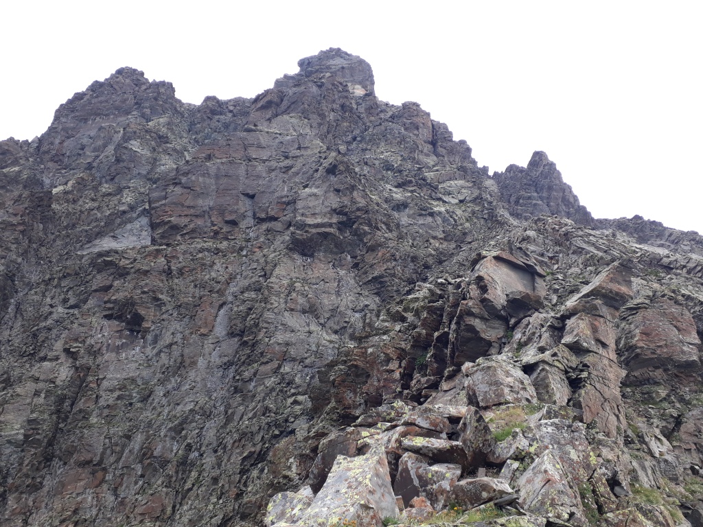 Dall’intaglio si sale direttamente fino alla cima del primo torrione (I°, passi di II°). Dalla cima si scende per pochi metri fino a un intaglio dove si riprende a salire la cresta. Dopo pochi metri si imbocca, tra i due camini che si presentano, il camino di sinistra, che si segue con buona arrampicata (II°, attenzione ai sassi) fino a ritornare sul filo della cresta. Si percorre facilmente la cresta fino alla base di una piccola torre di una decina di metri che si supera stando leggermente sulla sinistra (II°) tornando poi in cresta. Si continua sulla cresta, ora quasi pianeggiante, fino alla base di una bastionata.