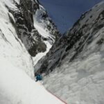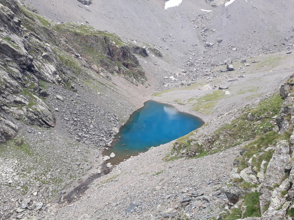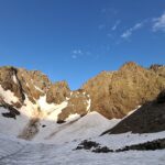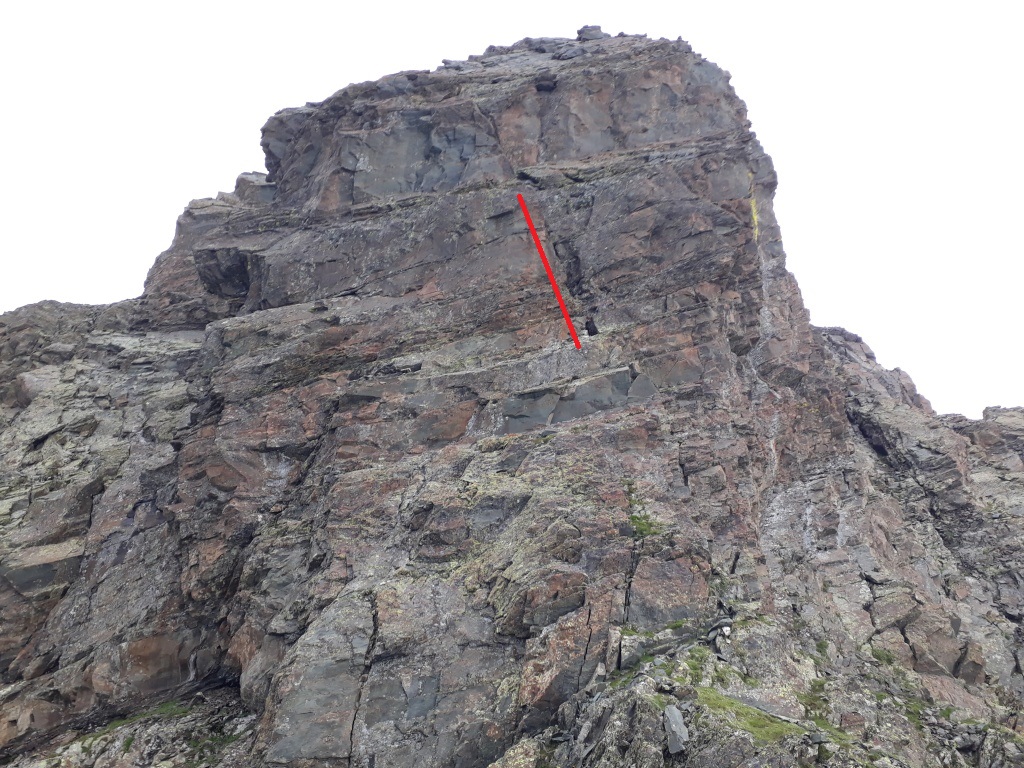 Si scende nella conca sottostante e poi si abbandona il sentiero. Si sale verso sinistra (Nord) il ghiaione e si prende l’evidente canale che porta all’intaglio da dove parte la cresta Sud (neve a inizio e fine stagione).