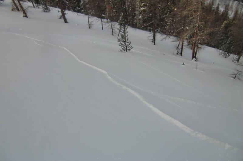 Consiglio però di scendere dalla punta verso il colle evitando il pendio nord. Noi ci abbiamo provato, ma abbiamo sentito un bel assestamento e abbiamo visto delle belle fratture, nonostante la presenza di alberi.
