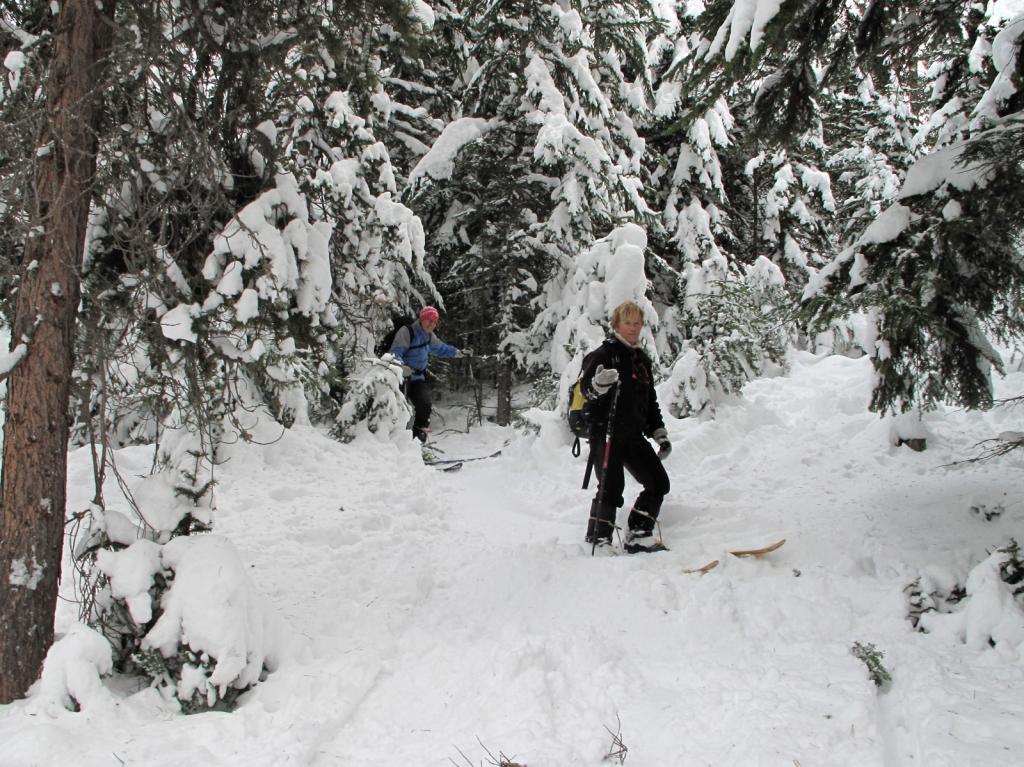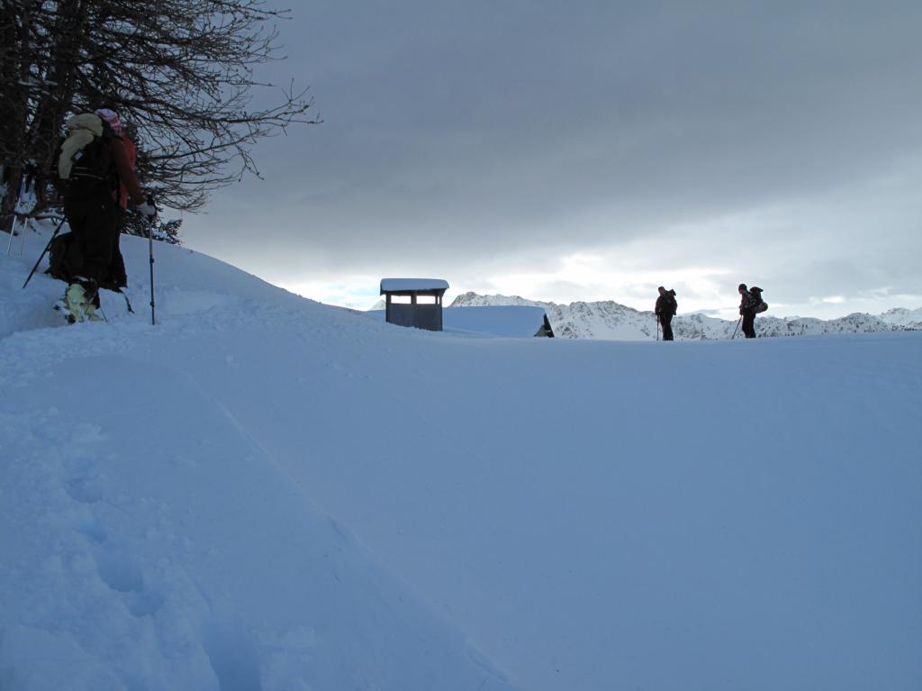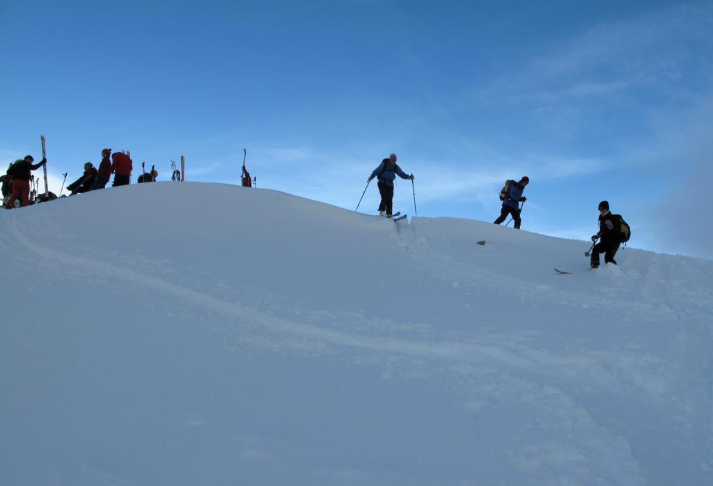 Ancora ottimo innevamento, solo un pò ventato dal colle alla cima. Siamo tornati anche noi dal colle, perchè qualche woof salendo in cima l’abbiamo sentito. Discesa divertente su neve bella. Qualche passaggio obbligato rende un pò laborioso qualche passaggio, ma avercene neve così.