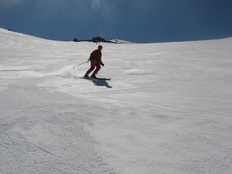 Il canale iniziale salito comodamente senza rampant,dopo il traverso, sul ripido pendio,rampant su neve dura coperta da residui della grandine di ieri. Il piano superiore e l’ultimo pendio con neve recente. Discesa alle 10.30: parte alta firn compatto,il ripido pendio ancora ghiacciato, poi firn morbido fino al ponte..