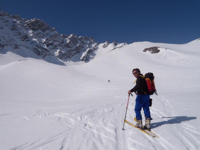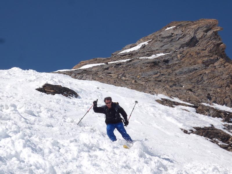 Salita regolare, un solo gava e buta di circa 30m (per il momento)e ottima traccia fino al pendio finale. Noi siamo arrivati su un pò tardi, quindi il pendio era tutto lavorato dai passaggi e abbiamo dovuto ritracciare. Ultimi 20m sci a spalle (la pendenza aumenta un pò). Discesa molto bella, in alto un pò di farina pesante ma scendendo tutta primaverile. Bell’ambiente, dal colle fantastica vista sul Monte Bianco. Oggi molto caldo, la parte bassa non durerà ancora molto. Con Guido e Beppe alla prox ciao…