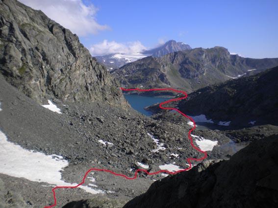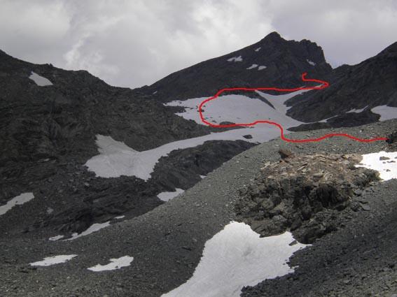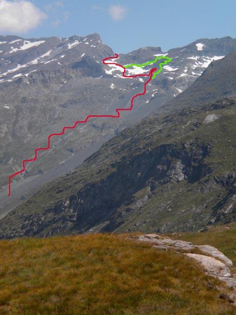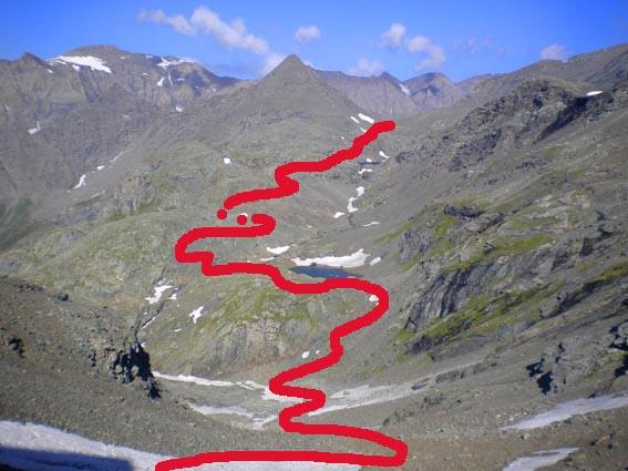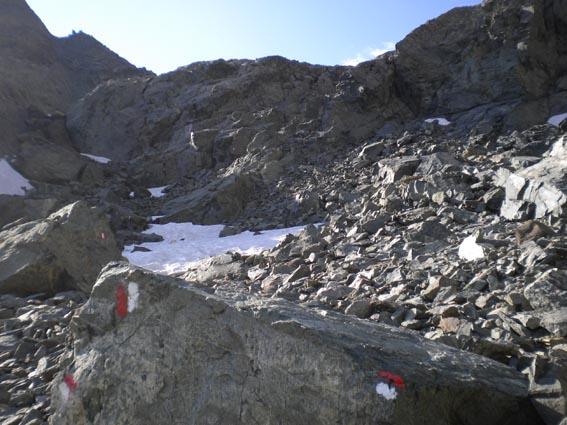 2) dopo il colle Autaret superare il nevaio senza perdere quota sino rintracciare il sentiero. Se si perde quota spostarsi dopo decisamente verso destra quasi in piano sino a rintracciare il sentiero nei pressi di un torrente
