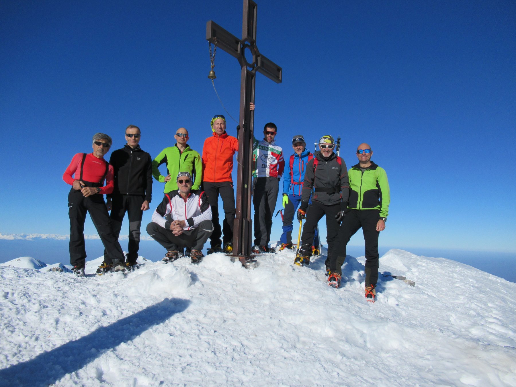 Ssaliamo come itinerario senza neve fino sui 1800 dove inizia e dopo breve tratto ad indossare ramponi e piccozza per poi entrare nel canale in ottime condizioni che risaliamo per uscire sulla sx e sempre su neve portante, percorriamo la dorsale per Cima delle Colme da dove lasciata la Gola delle Scaglie, continuiamo la salita sempre di ramponi fino alla cima del Mongioie. Pranzato con temperature da marzo, scendiamo all’Aseo per continuare al Pian dell’Olio e poi a scendere tra l’ultima neve e tolti i ramponi, continuiamo la discesa fino alle auto terminando la stupenda gita con 1500D+.