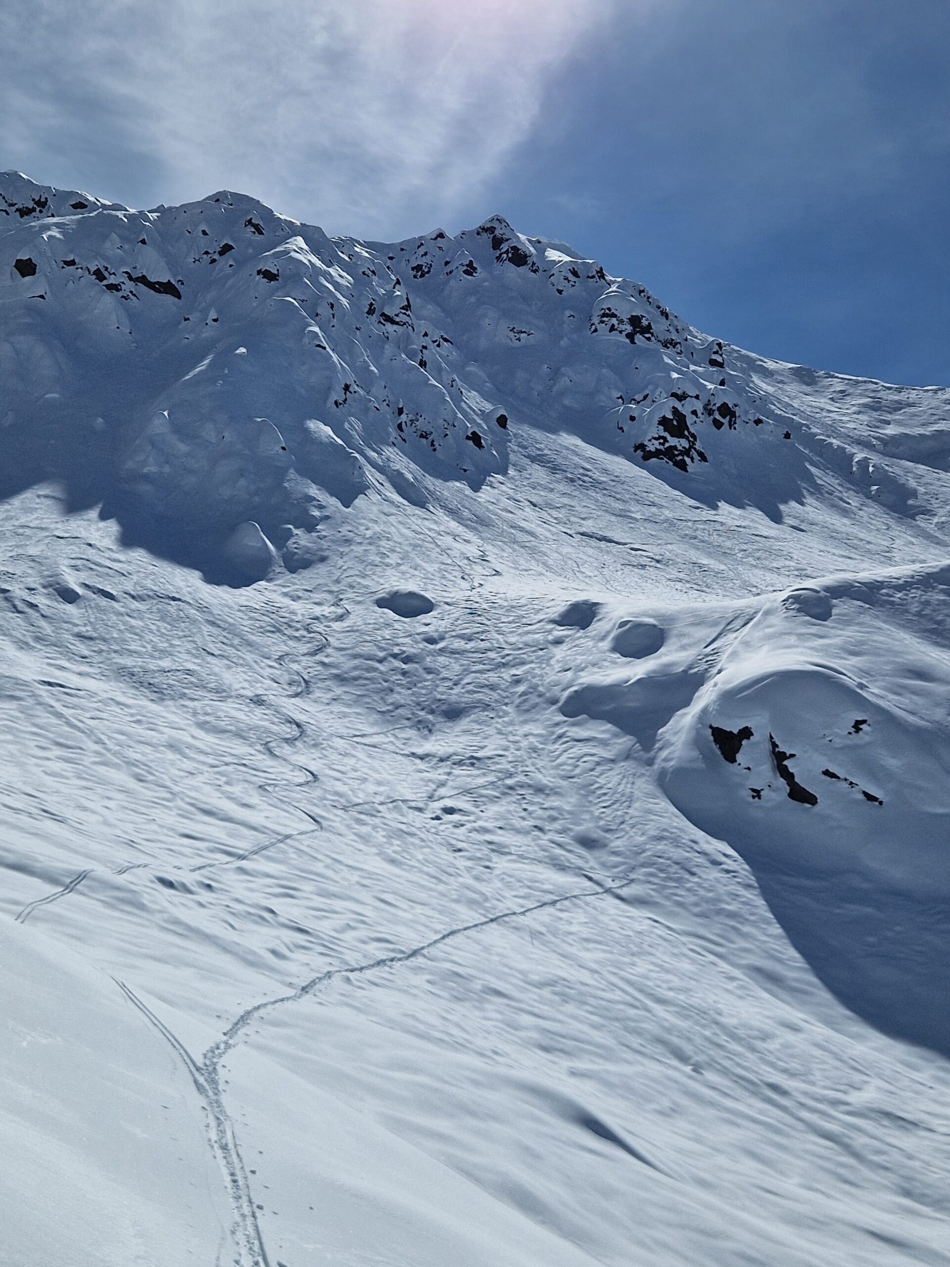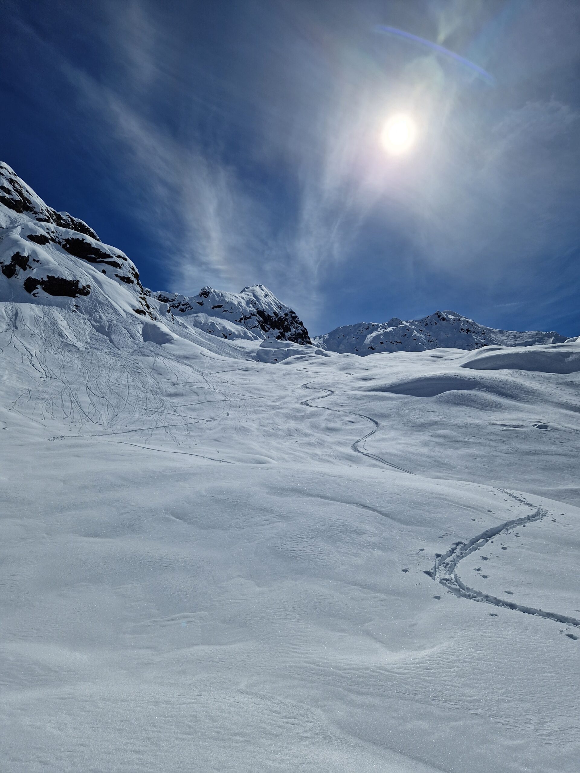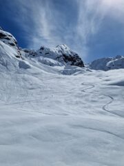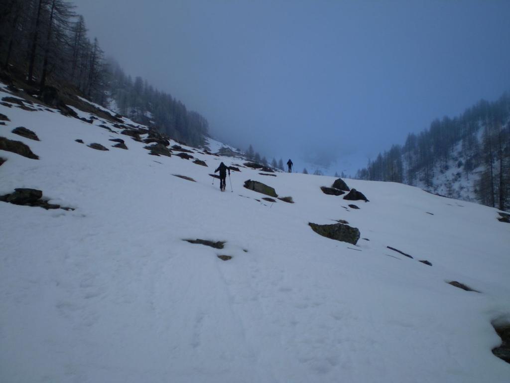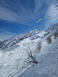 Risalire il sentiero dapprima per fitto bosco di faggi, ontanelle e noccioli fino all’alpe Quartia. Da qui si apre per vasti pratoni incassati in una valle stretta. si sale stando sul versante di destra fino all’alpe Piane Inferiore. Da qui si può attraversare il torrente e stare sulla sinistra del Rio oppure proseguire sulla destra. Tuttavia a destra il pericolo di scariche di valanghe spontanee appare evidente (serie di grosse valanghe di fondo). Arrivare con un po’ di saliscendi fino all’alpe piane Superiore. Da qui inizia la gita vera e propria (con neve decisamente più bella). Attraversare la piana verso sx e risalire un pendio abbastanza ripido stando a destra di un canale. Si giunge All’alpe Laghetto. Risalire seguendo la dorsale e poi spostarsi verso destra. Attraversare una grossa conca (di fronte si intravede la bocchetta di Rosso). Risalire il pendio finale (molto ripido) fino in cima. valutare eventuali cornici in prossimità della Cima. La Discesa avviene lungo il percorso di salita. Eventualmente dall’alpe piane Inferiore stare sulla destra.