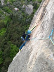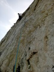 - L4 6c+ (traverso molto ostico, fortunatamente la chiodatura è più ravvicinata rispetto agli altri tiri)