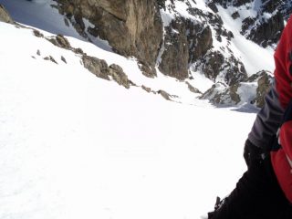 Buone condizioni nel canale neve a tratti trasformata e a tratti un pò sfondosa comunque piacevole sia in salita che discesa solo l’ uscita in punta un pò di neve accumulata dal vento da non stuzzicare troppo.Gran bel canale non molto lungo appeso sulle imponenti rocce che danno un bel senso di vuoto,pendenza costante che non molla fino la conoide.Sotto la neve comincia a trasformarsi a tratti dura e irregolare