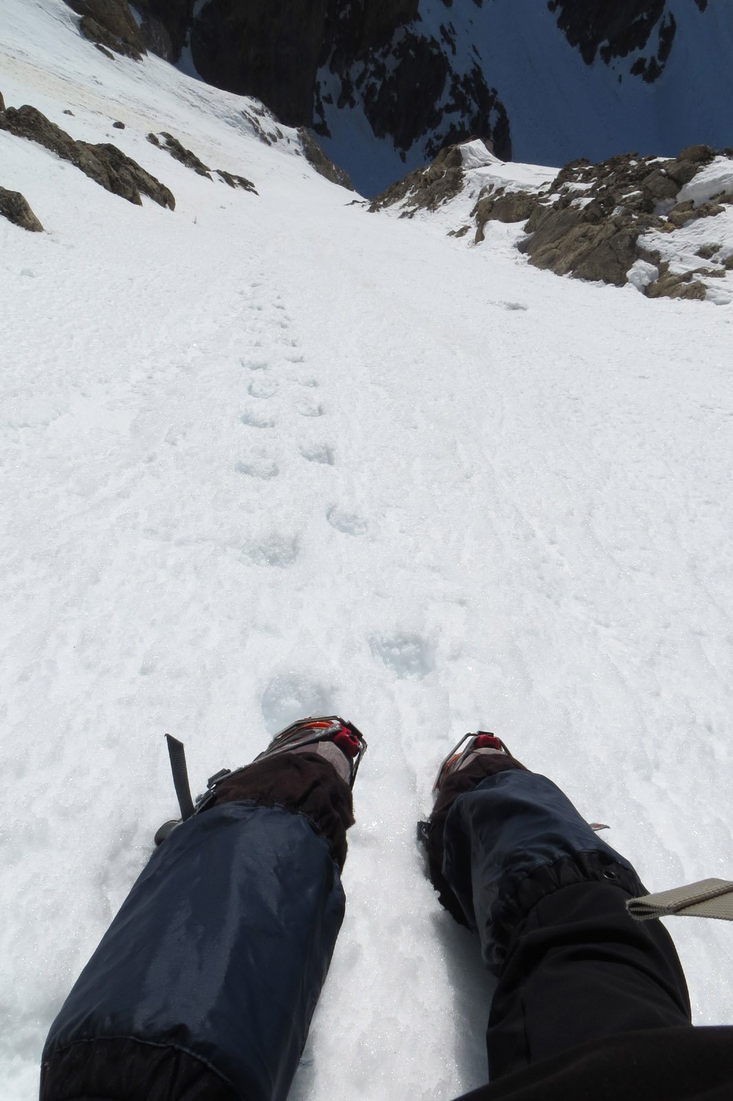 Il canale c’è, l’ho visto il giorno prima. La neve anche, quindi alè. Partenza alle prime luci, neve portante nel pendio ripido di accesso alla base del canale. Primo tratto del canale ripido ma non troppo, poi al bivio prendo a sx e in breve mi trovo in campo aperto e la sensazione di vuoto aumenta. L’hai voluta la bici? Ora pedala… La neve è dura, ramponi e picche (due) mordono bene, ma i polpacci friggono, perchè non c’è tregua. Poi in poco più di 3h sono sulla piatta vetta in balia del solito vento, pronto per la parte più delicata della gita, la discesa. Ma la neve tiene e non si tribola nemmeno troppo, anche se devo fare il giro largo perchè dal colletto del lago non si scende (cornice).