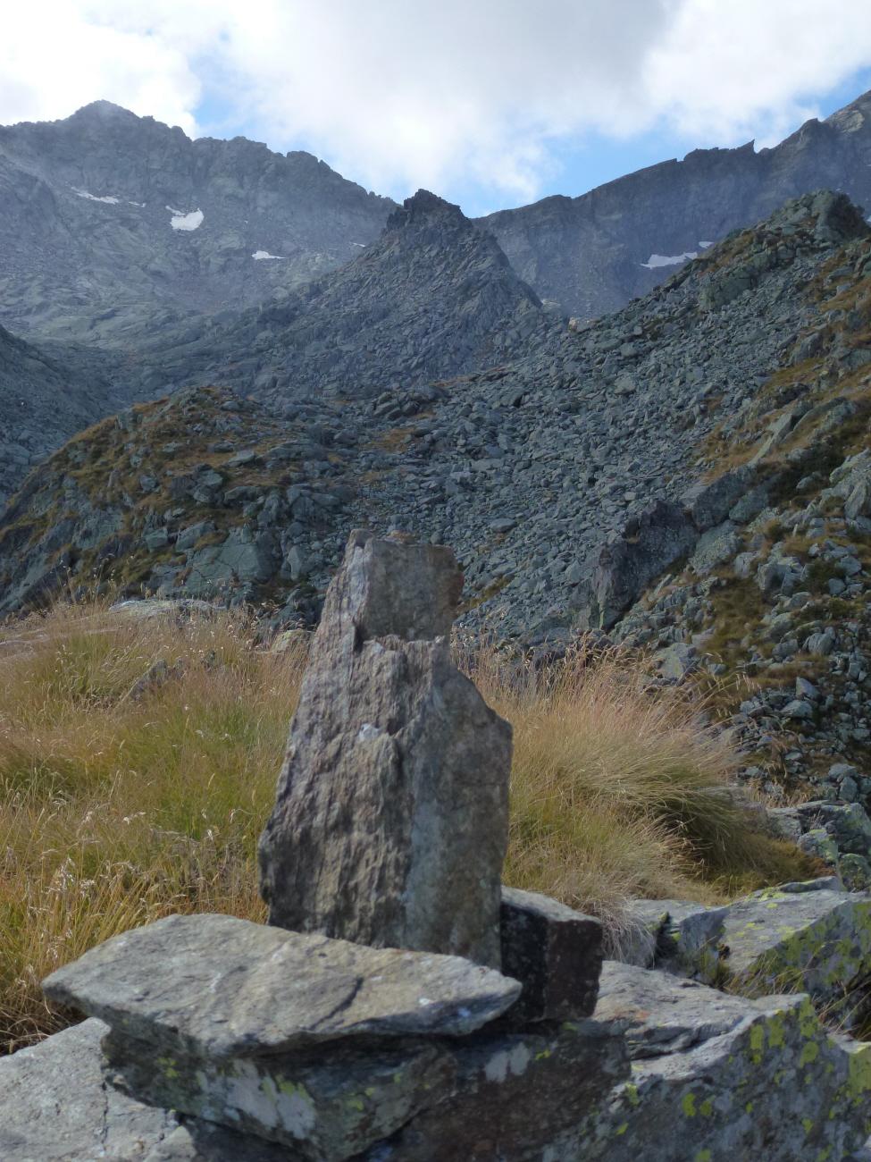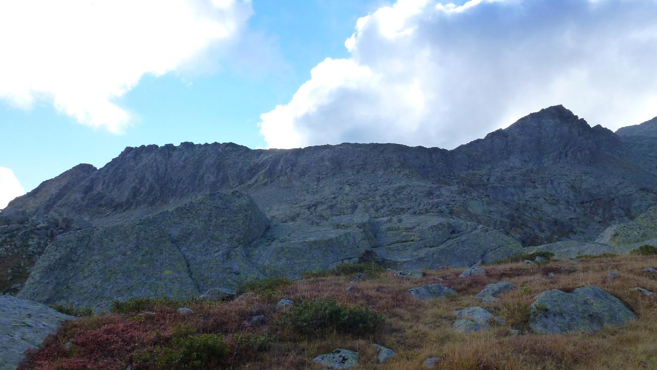 Ora si punta al rio in direzione della quota 2588, lo si supera e si inizia a salire nella pietraia cercando di seguire una specie di corridoio in salita formato da zolle erbose e piccole macchie di rododendro che portano contro un piccolo salto roccioso, dove si piega a destra si risale un breve tratto di pietraia e si arriva ai piedi di un ampio zoccolo a placche.