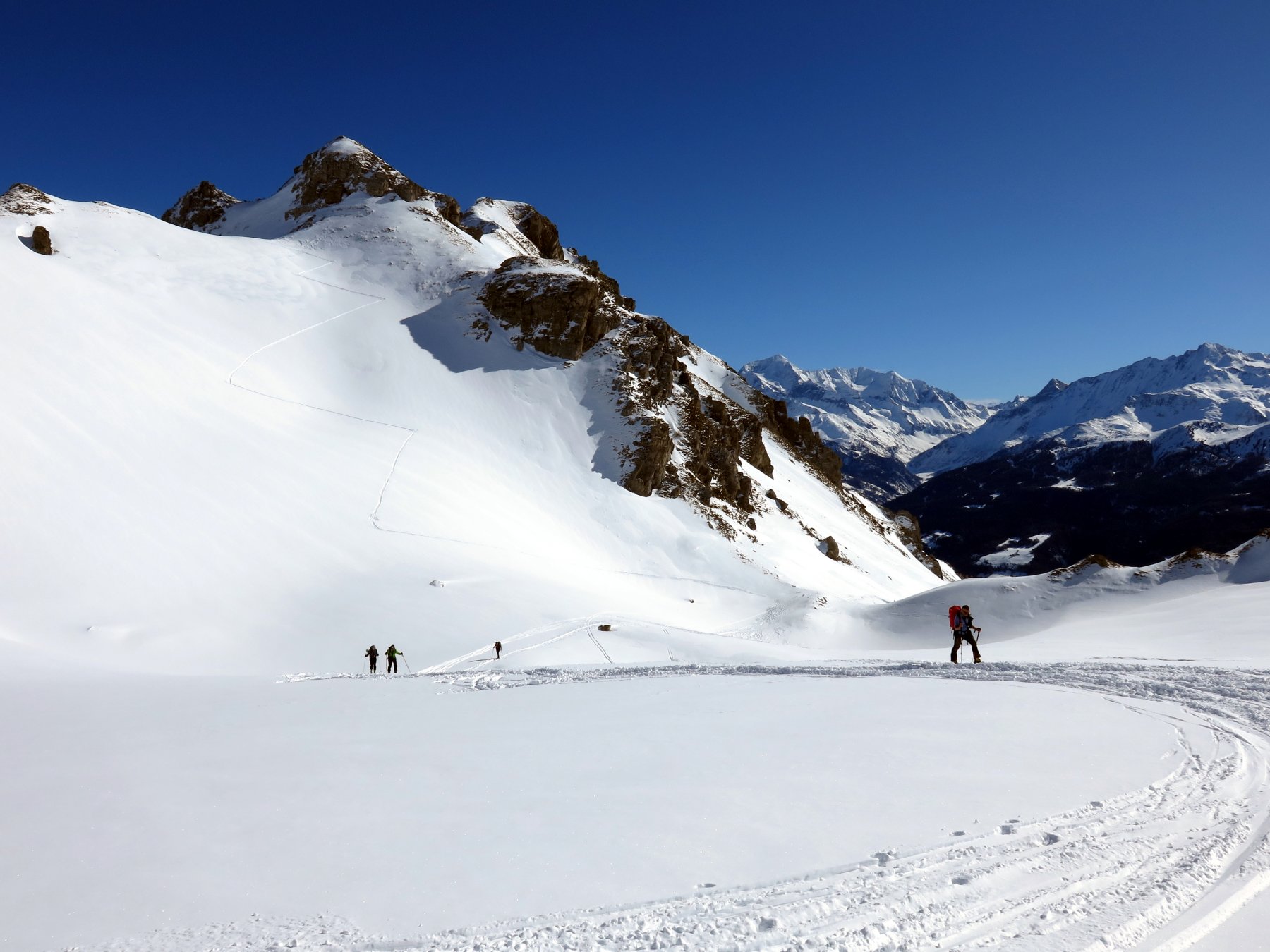 Contornare quindi con lungo traverso “Roche Thomas” senza salire troppo (pendenza sud-ovest, un po ‘ripida, coltelli utili in caso di neve dura) e raggiungere il Lac Guio (2272 m) con un piccolo collo di bottiglia.