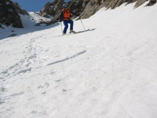 Occorre portare gli sci per circa 45 min a spalle, a circa 1950m si calzano e intorno ai 2600 inizia il conoide…