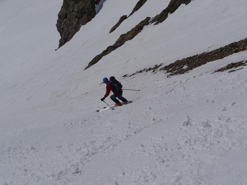 In discesa è possibile scendere direttamente dalla punta per 80-100mt sui 45°