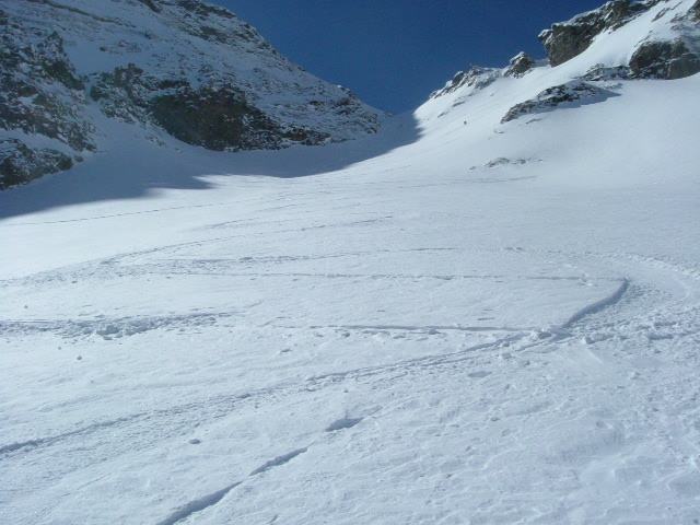 A quota 2300 circa prendere sulla sinistra un pendio-canale che porta ad una comba sospesa con pendenze meno sostenute.