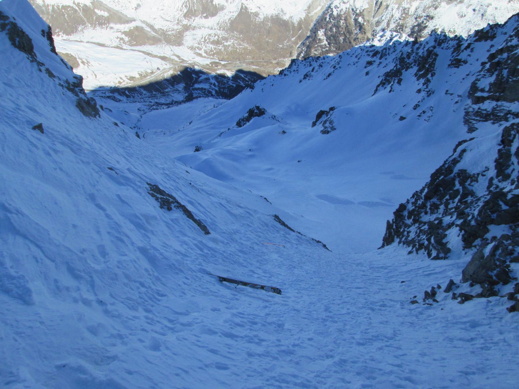 Partito con temperatura -6, ho messo i coltelli a metà della prima rampa. Neve dura crosta portante. Ho trovato uno sci a valle della strettoia, e uno sci, + bastoncino, occhiali cappello a monte del primo tratto ripido a 40°. Ho incontrato un francese che stava raccogliendo l’attrezzatura, che mi ha detto che ieri il suo amico e volato e si è rotto una spalla.