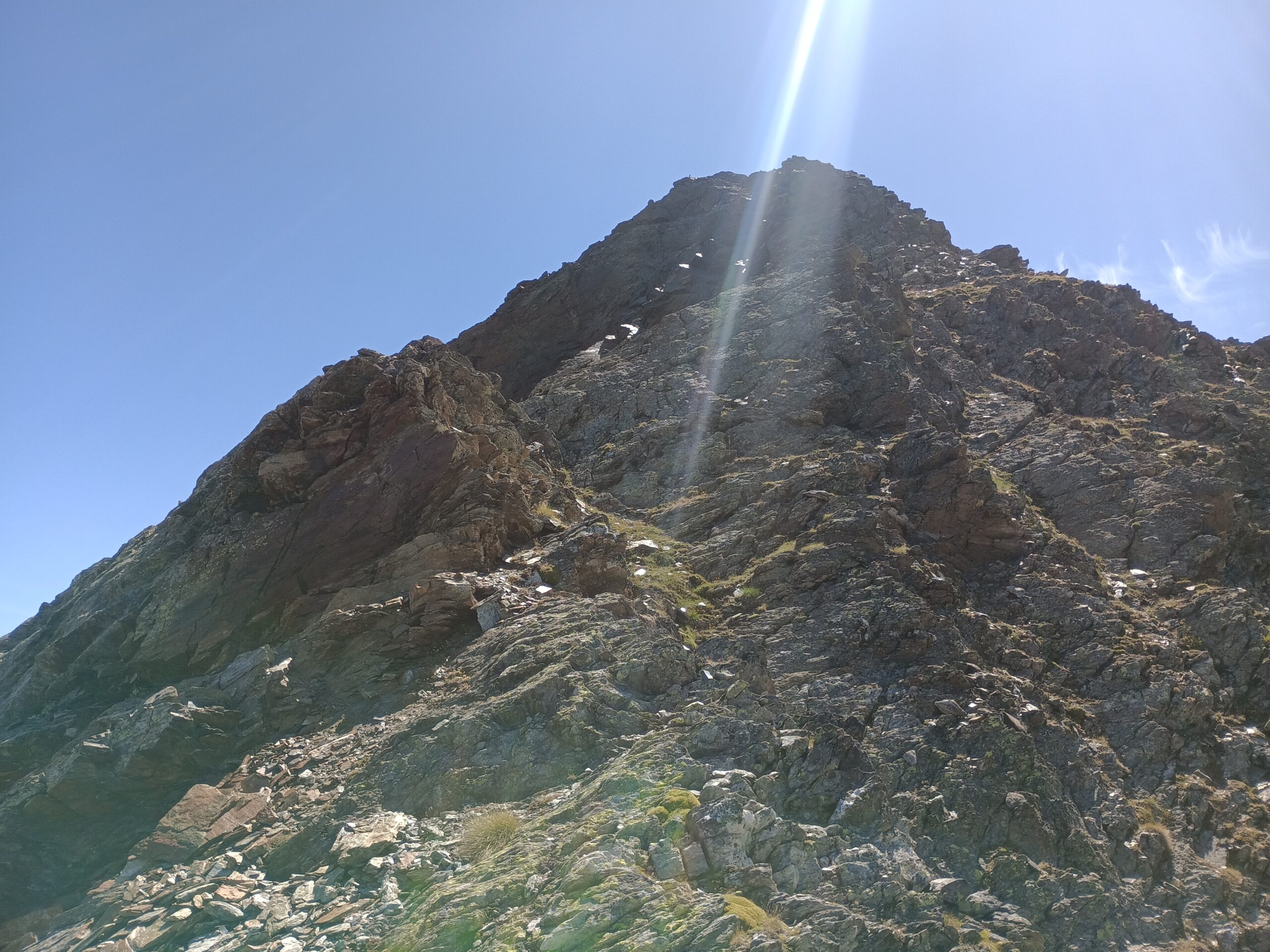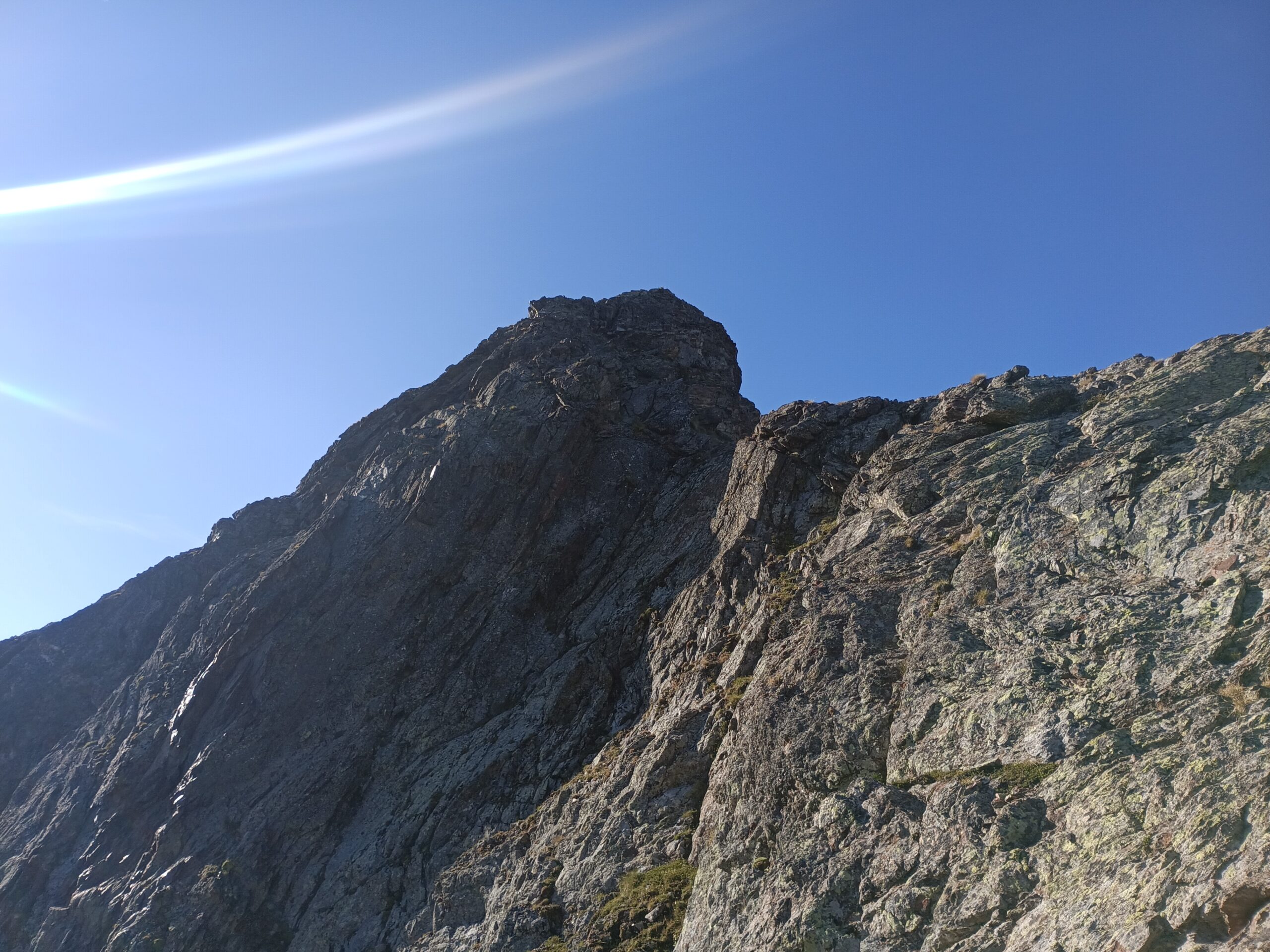 From the Bivouac, immediately go SW toward a small rocky gully / slope and climb it just on the right on the grass. There is a cairn on this small col. Then scramble to the right to the ridge. There the first difficulties start. Go up some small tower and easier ridge scrambling with nice exposure until you have to climb some grassy slopes with some slabs that are difficult to protect. Then approach the large tower over a thin ridge and climb the tower that seems difficult but climbs fine. Arrives at 2720m. Then descend over easy terrain down to a col where you could bail by taking scree slopes back to the bivouac. Instead, we followed the ridge and climbed farther.First on loose terrain the we bypassed by climbing some steep slabs and then just fun easy hiking and scrambling on the NW ridge toward Becca Conge.