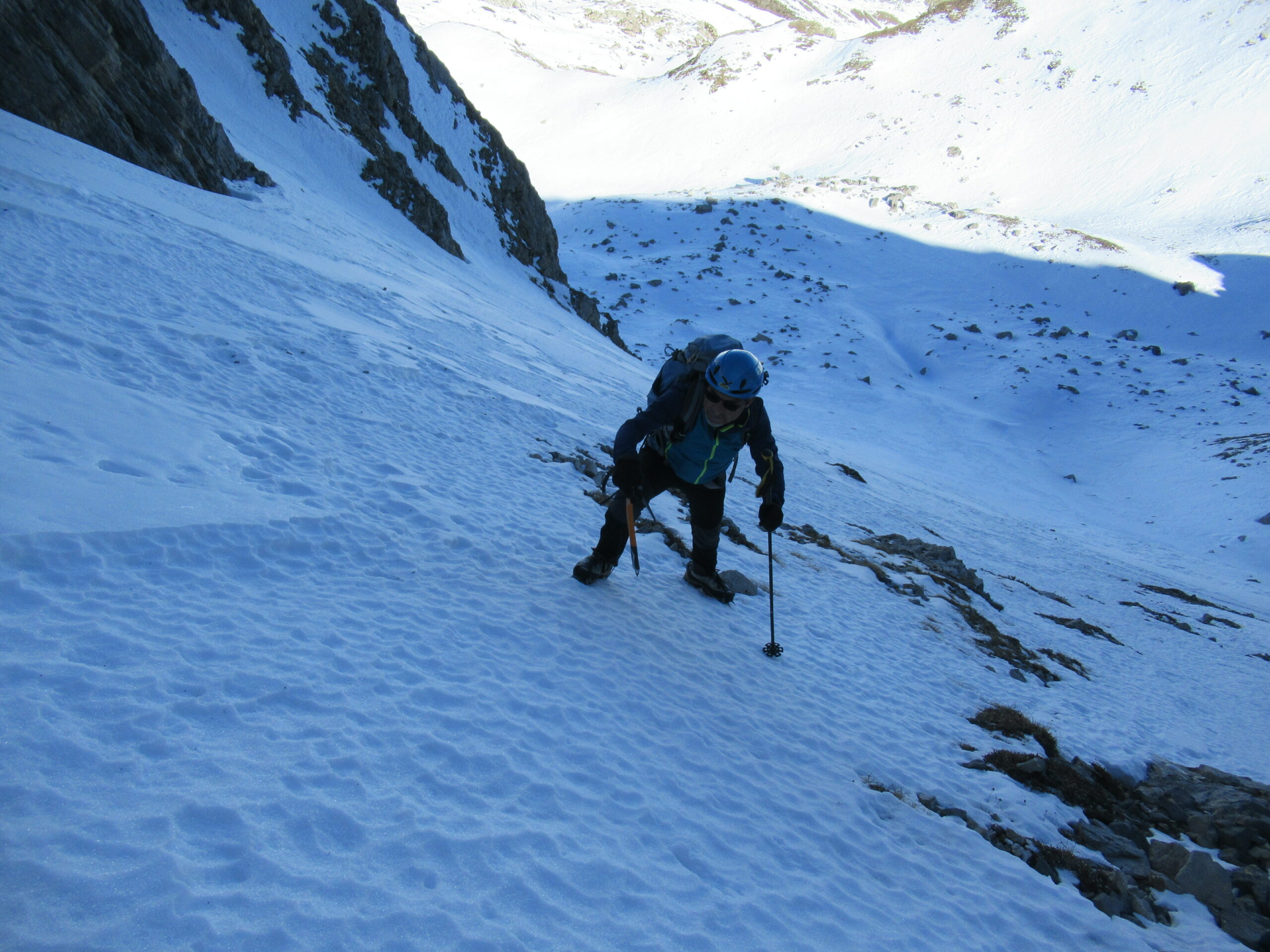 Dopo l’assenza di neve fino sopra il Pian dell’Olio, iniziamo a pestarla e poco dopo calziamo i ramponi per attaccare direttamente i ripidi pendii portandoci gradualmente a dx e poi a salire il pendio finale con l’ultimo tratto pulito e ad arrivare sul Monte Rotondo (m.2495). Dopo essere scesi sfruttando delle lingue di neve, diventa continua e siamo scesi leggermente nel versante opposto fino all’attacco del primo canale che vedendolo piu’ innevato che il successivo, lo abbiamo attaccato su neve portante e continua, anche se poca ma in buone condizioni per uscire alla forcella tra le pietre e li ad affrontare il pendio finale tra poca neve e un po’ di pietre nello strappo finale. Pranzato in vetta con un meteo primaverile, ripartiamo per scendere con attenzione il primo tratto e dopo un tratto pulito, si torna nella neve per passare dalla Sella del Profondo e poi’ giu’ per i pendii al sentiero dove togliamo l’attrezzatura e a scendere fino all’auto per il percorso dell’andata. Nonostante la poca neve e qualche pietra, condizioni tutto sommate buone su neve ben ramponabile, il tutto svolto con Ale. Buona Montagna!