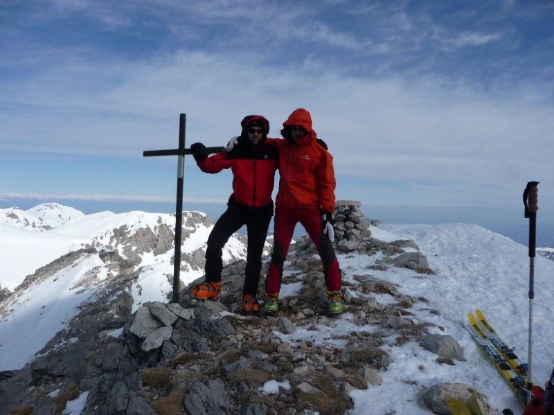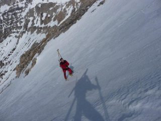 Si portano gli sci fino all’attacco del canale. La salita era tutta con neve ghiacciata e dura percui abbiamo usato i ramponi senza mai togliere gli sci dallo zaino fino in punta.