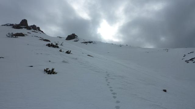 a 1800 circa per fortuna diventa portante arrivato alla biforcazione 2 sciatori scendono ululanti e questo mi fà ben sperare poco dopo abbadono le ciastre e proseguo senza.