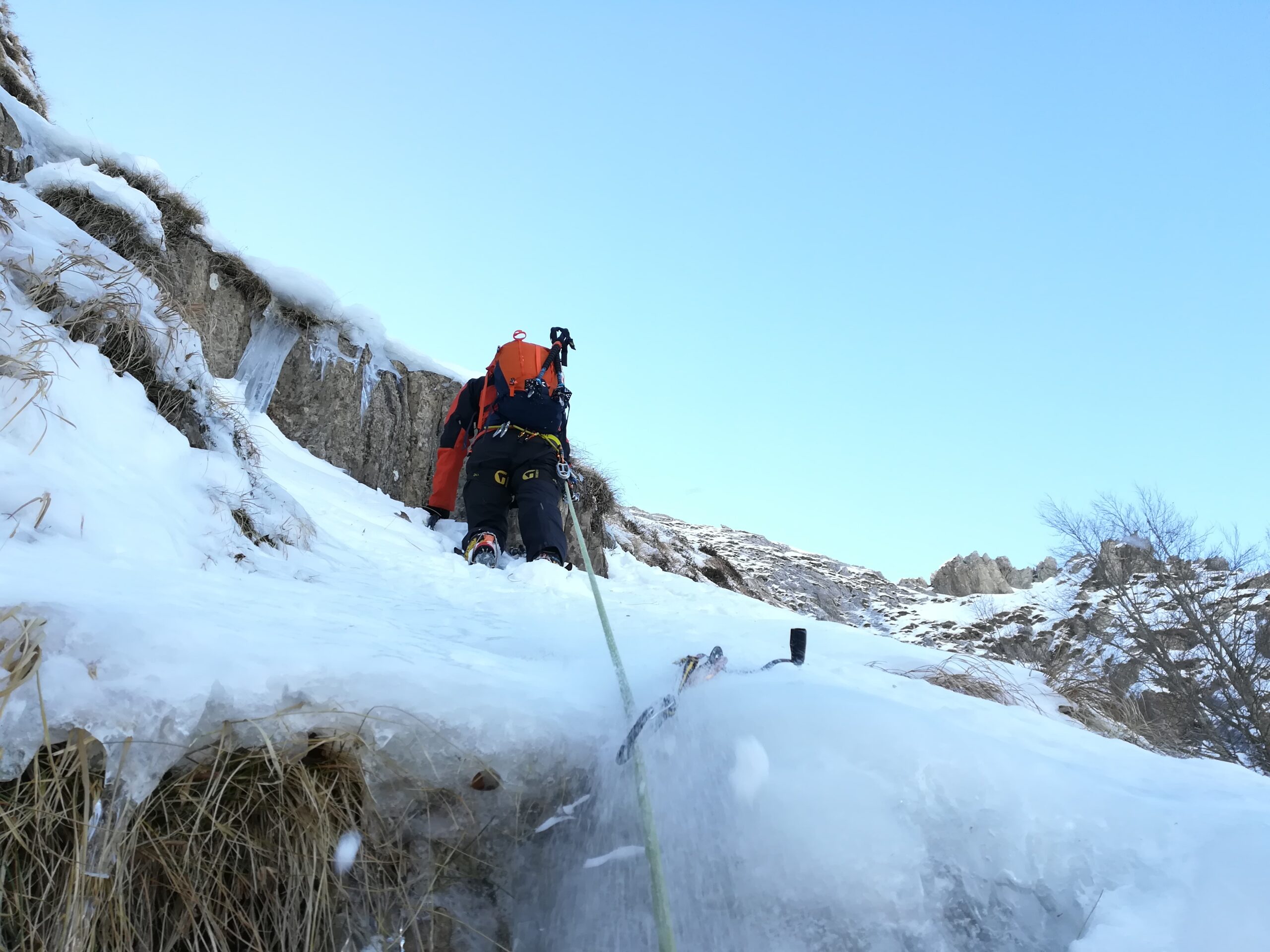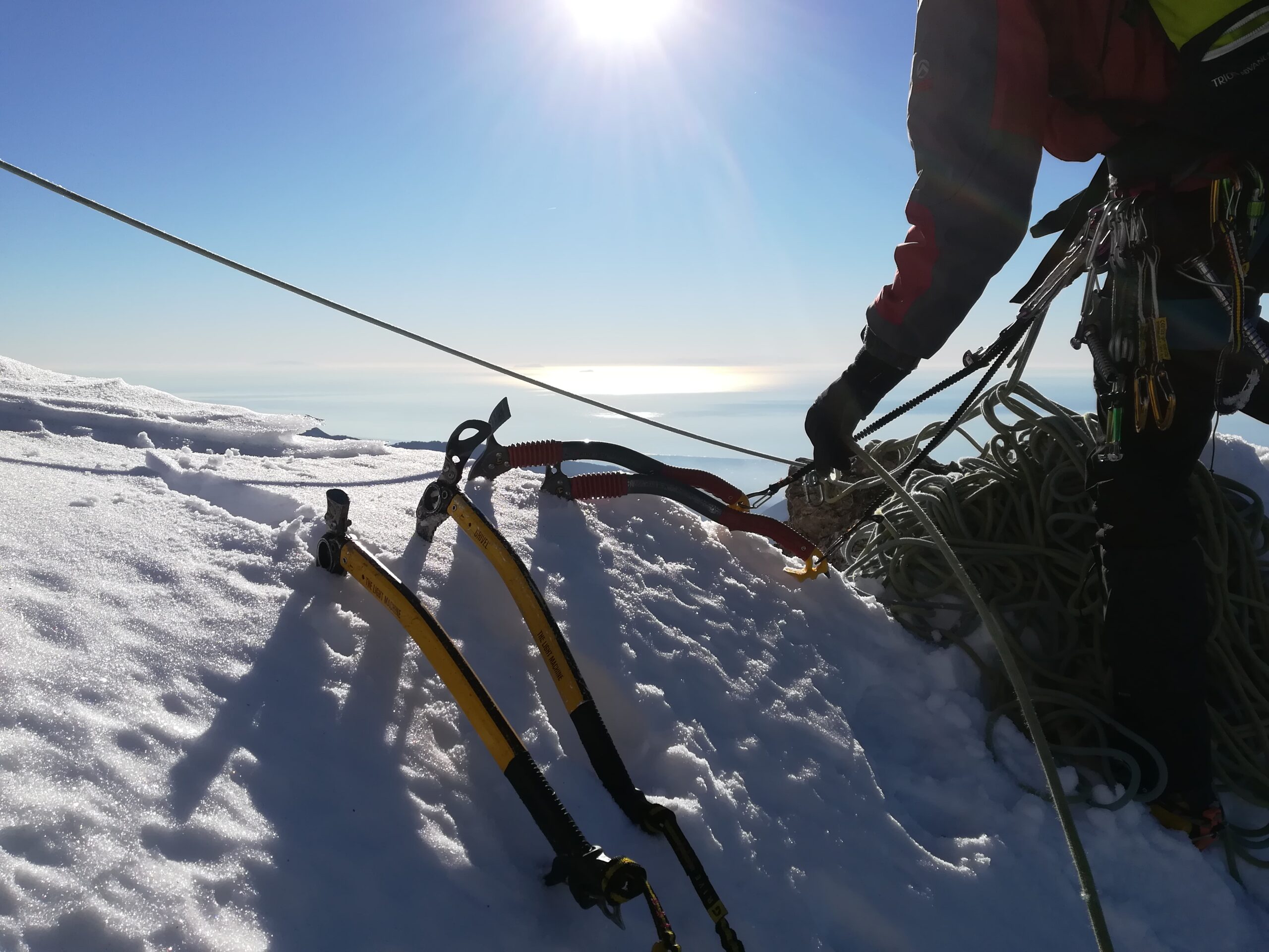 Circa 30 cm di neve fresca nel bosco, poi sul ripido e nei tratti dove ha tirato un po’ di vento le condizioni migliorano e si pesta la neve vecchia sottostante, più dura, con tratti anche di ghiaccio. Ci siamo legati sotto la strozzatura, da qui alla vetta con 4 tiri di cui l’ultimo in cresta. Delicata la prima parte di discesa lato Cavallo, poi dalla sosta attrezzata (meglio controllarla, comunque c’è un cordone abbastanza nuovo) calata di 40 metri fino a un faggio, altra calata da 50 fino a terreno più facile, e giù fino al sentiero per bosco a tratti ancora ripido. Bella gita su una vetta piccola ma tignosa! Giornata magnifica con clima ideale.