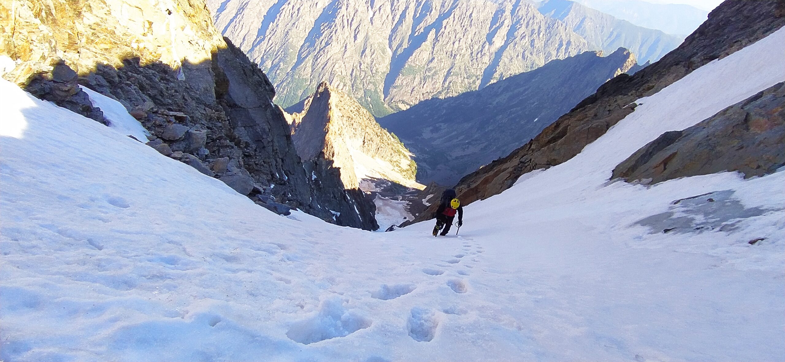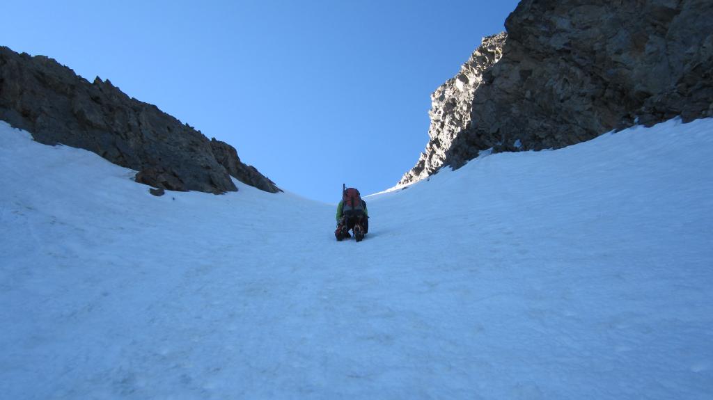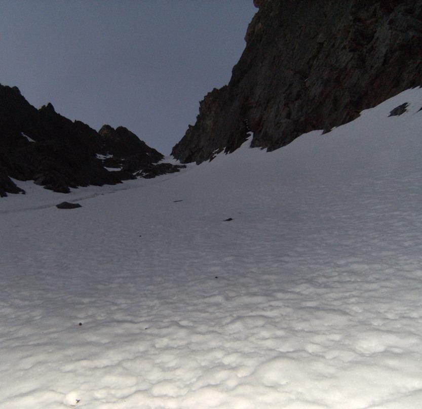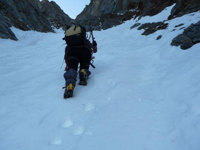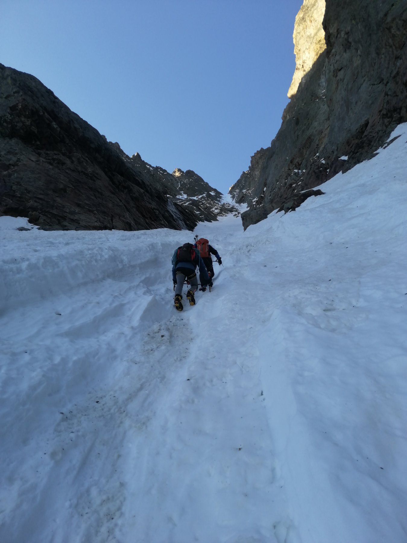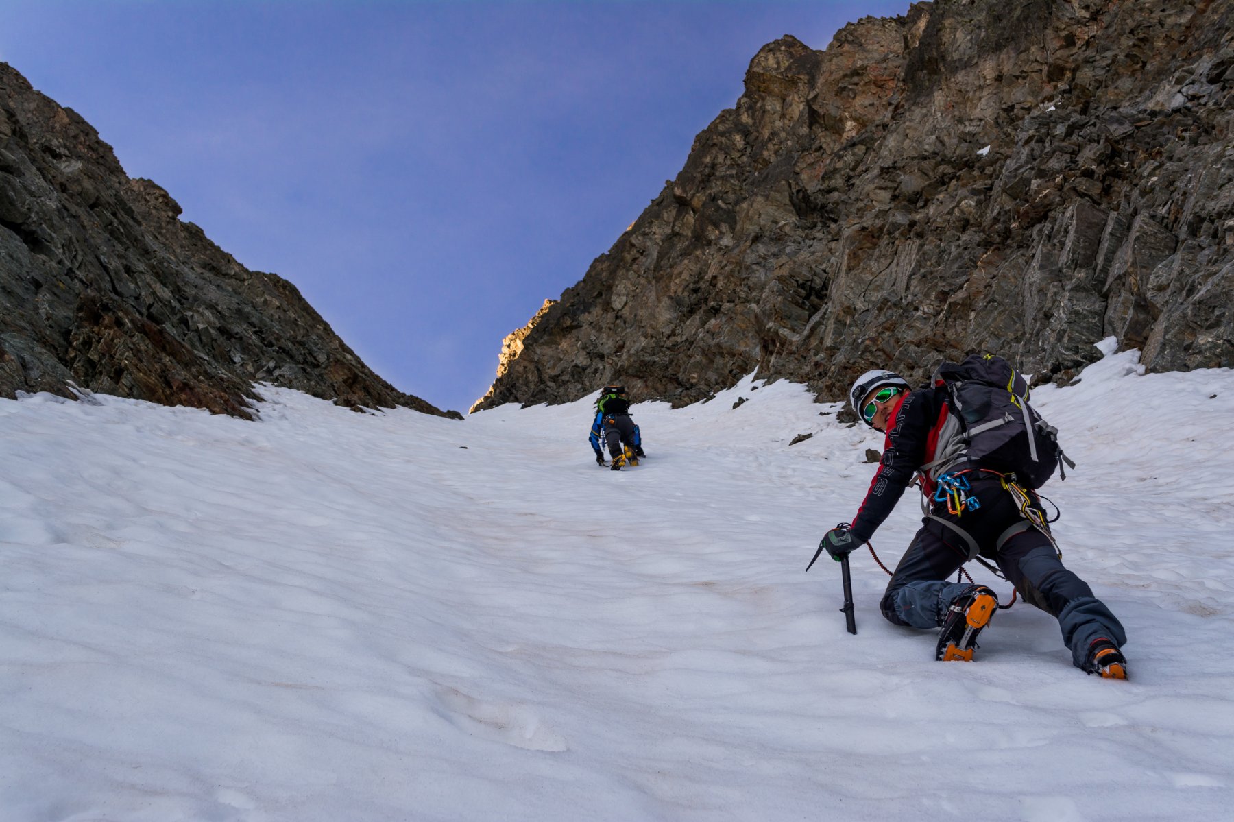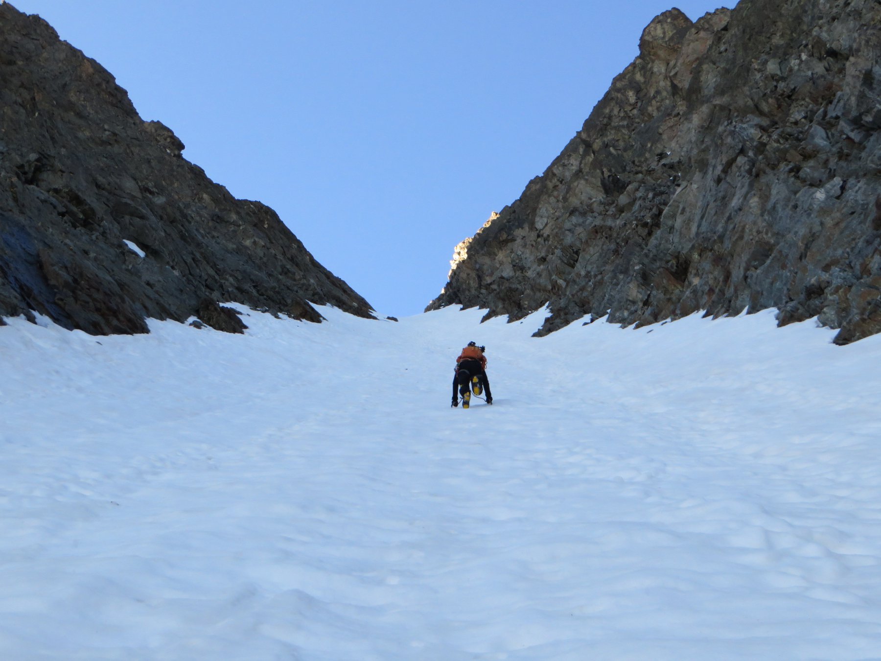 Dal bivacco si prosegue in direzione E seguendo i molti ometti, si scavalcano alcuni massi e si raggiunge una zona erbosa dove si incontrano tracce di sentiero (lamiere di un precedente bivacco). Si inizia ora a salire più ripidamente in direzione della grande morena, la si affronta direttamente (faticoso) su terreno franoso fino a raggiungere il pianoro morenico (grossi ometti) da cui inizia il vero e proprio canale. In alternativa alla salita ripida della morena ci si può portare sul nevaio sotto il Corno Stella e risalirlo con un semicerchio, raggiunto il culmine della morena, si scende fino ad incontrare l’imbocco del canale. Calzati i ramponi si inizia a risalire il ripido canale (800 m a 45-50 gradi) stando sempre sul ramo di dx (senso di salita) fino al colletto Coolidge. Utili due picche.