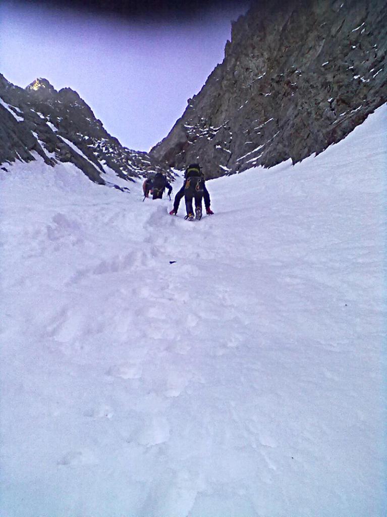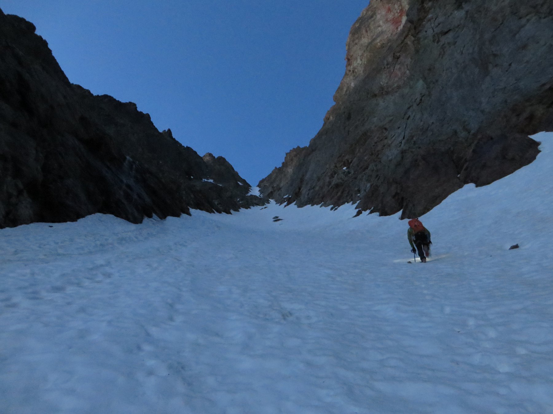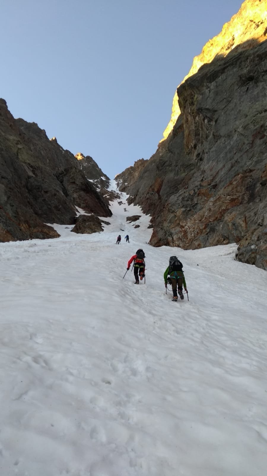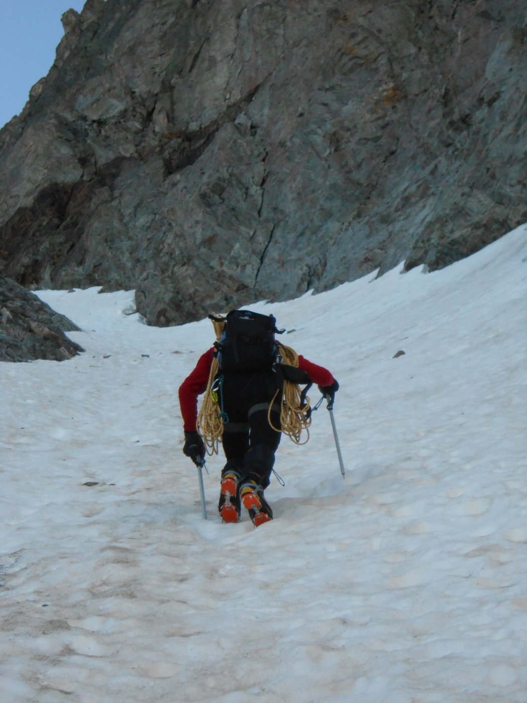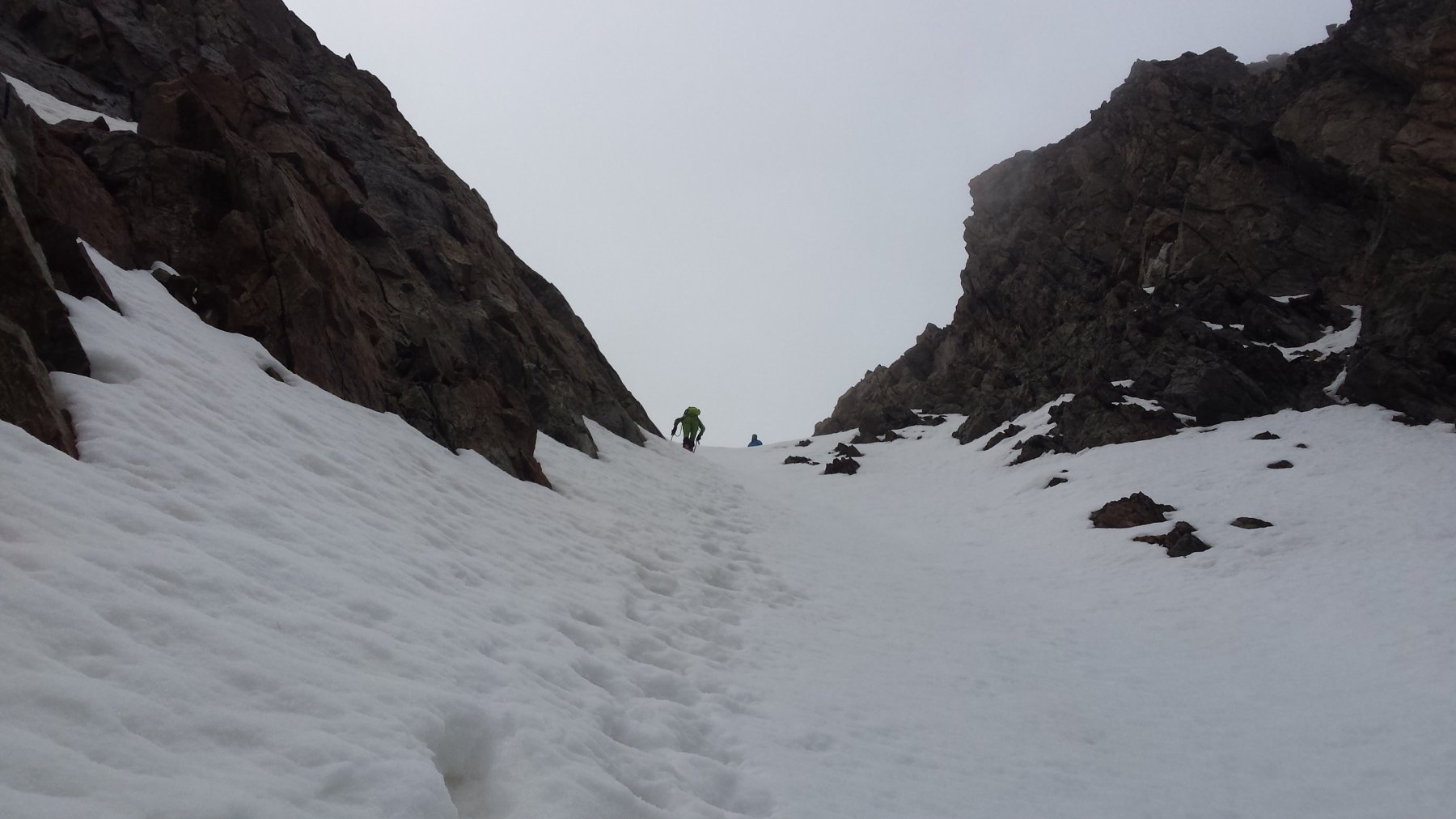 Dal bivacco si prosegue in direzione E seguendo i molti ometti, si scavalcano alcuni massi e si raggiunge una zona erbosa dove si incontrano tracce di sentiero (lamiere di un precedente bivacco). Si inizia ora a salire più ripidamente in direzione della grande morena, la si affronta direttamente (faticoso) su terreno franoso fino a raggiungere il pianoro morenico (grossi ometti) da cui inizia il vero e proprio canale. In alternativa alla salita ripida della morena ci si può portare sul nevaio sotto il Corno Stella e risalirlo con un semicerchio, raggiunto il culmine della morena, si scende fino ad incontrare l’imbocco del canale. Calzati i ramponi si inizia a risalire il ripido canale (800 m a 45-50 gradi) stando sempre sul ramo di dx (senso di salita) fino al colletto Coolidge. Utili due picche.