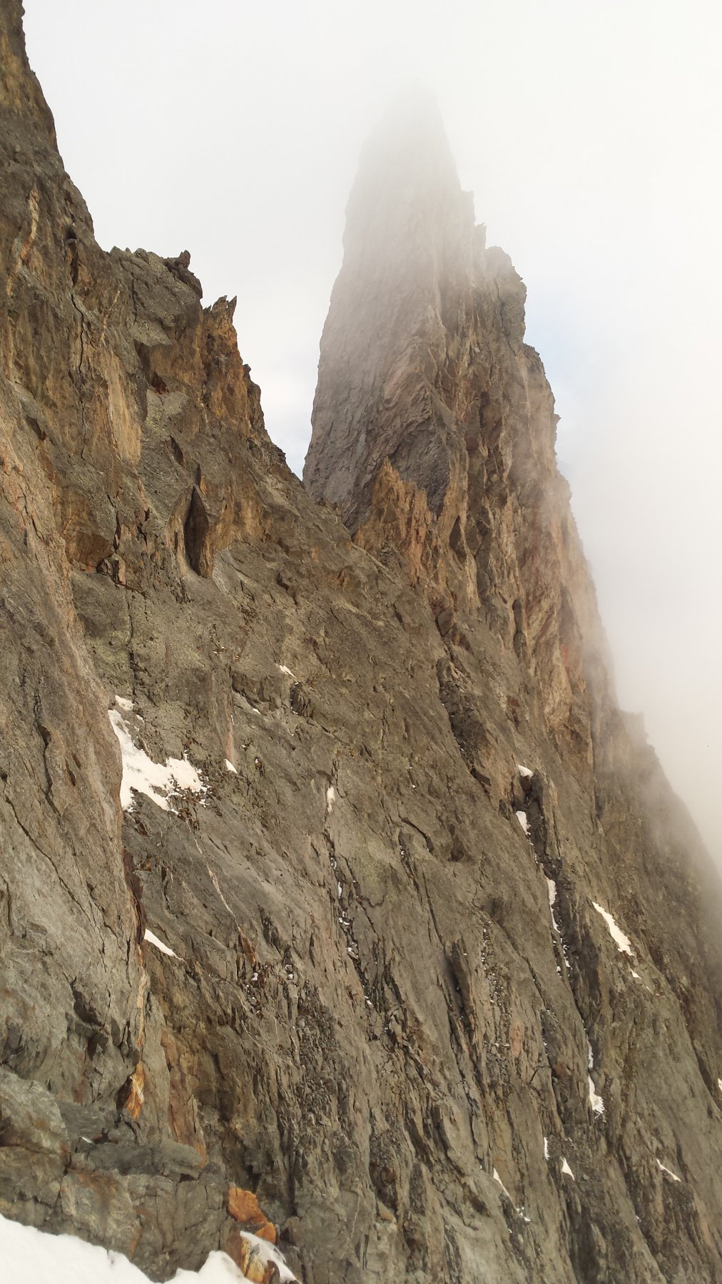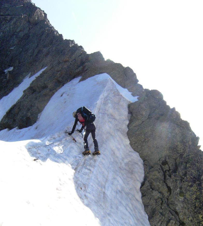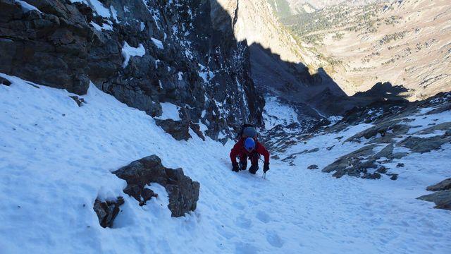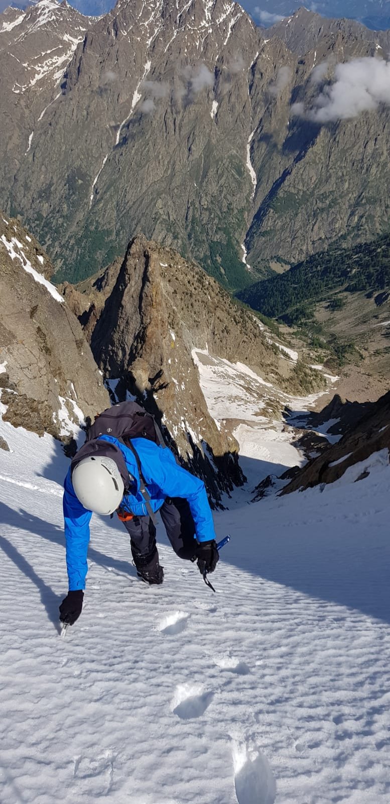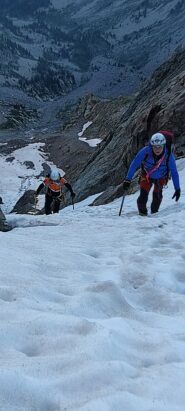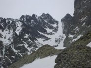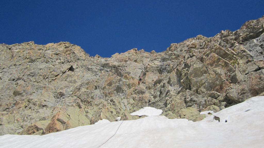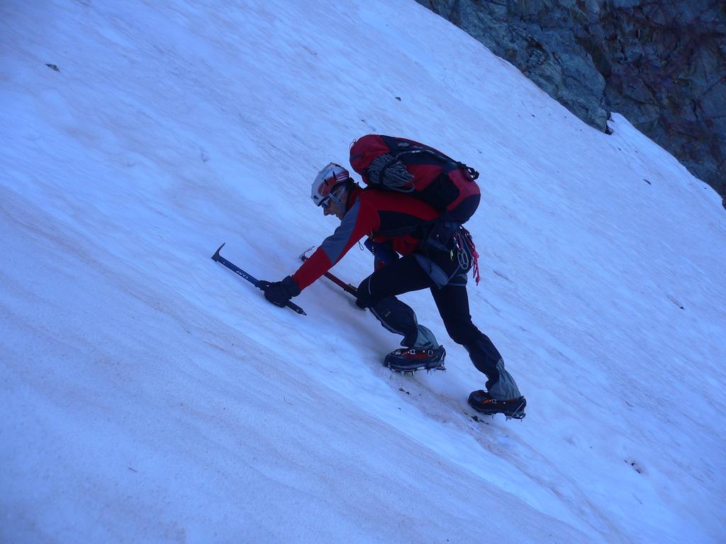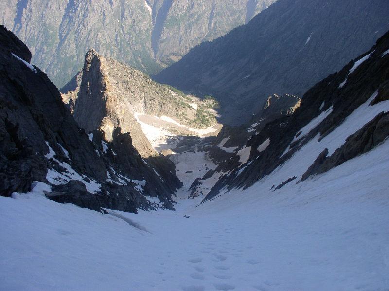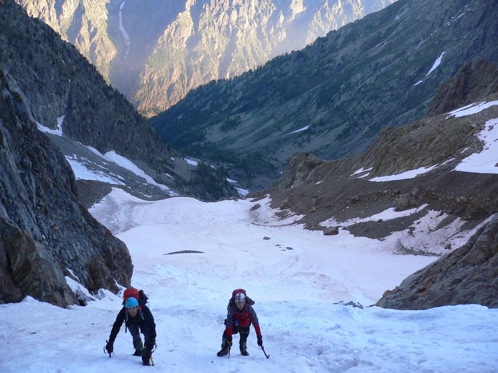 Dal bivacco si prosegue in direzione E seguendo i molti ometti, si scavalcano alcuni massi e si raggiunge una zona erbosa dove si incontrano tracce di sentiero (lamiere di un precedente bivacco). Si inizia ora a salire più ripidamente in direzione della grande morena, la si affronta direttamente (faticoso) su terreno franoso fino a raggiungere il pianoro morenico (grossi ometti) da cui inizia il vero e proprio canale. In alternativa alla salita ripida della morena ci si può portare sul nevaio sotto il Corno Stella e risalirlo con un semicerchio, raggiunto il culmine della morena, si scende fino ad incontrare l’imbocco del canale. Calzati i ramponi si inizia a risalire il ripido canale (800 m a 45-50 gradi) stando sempre sul ramo di dx (senso di salita) fino al colletto Coolidge. Utili due picche.