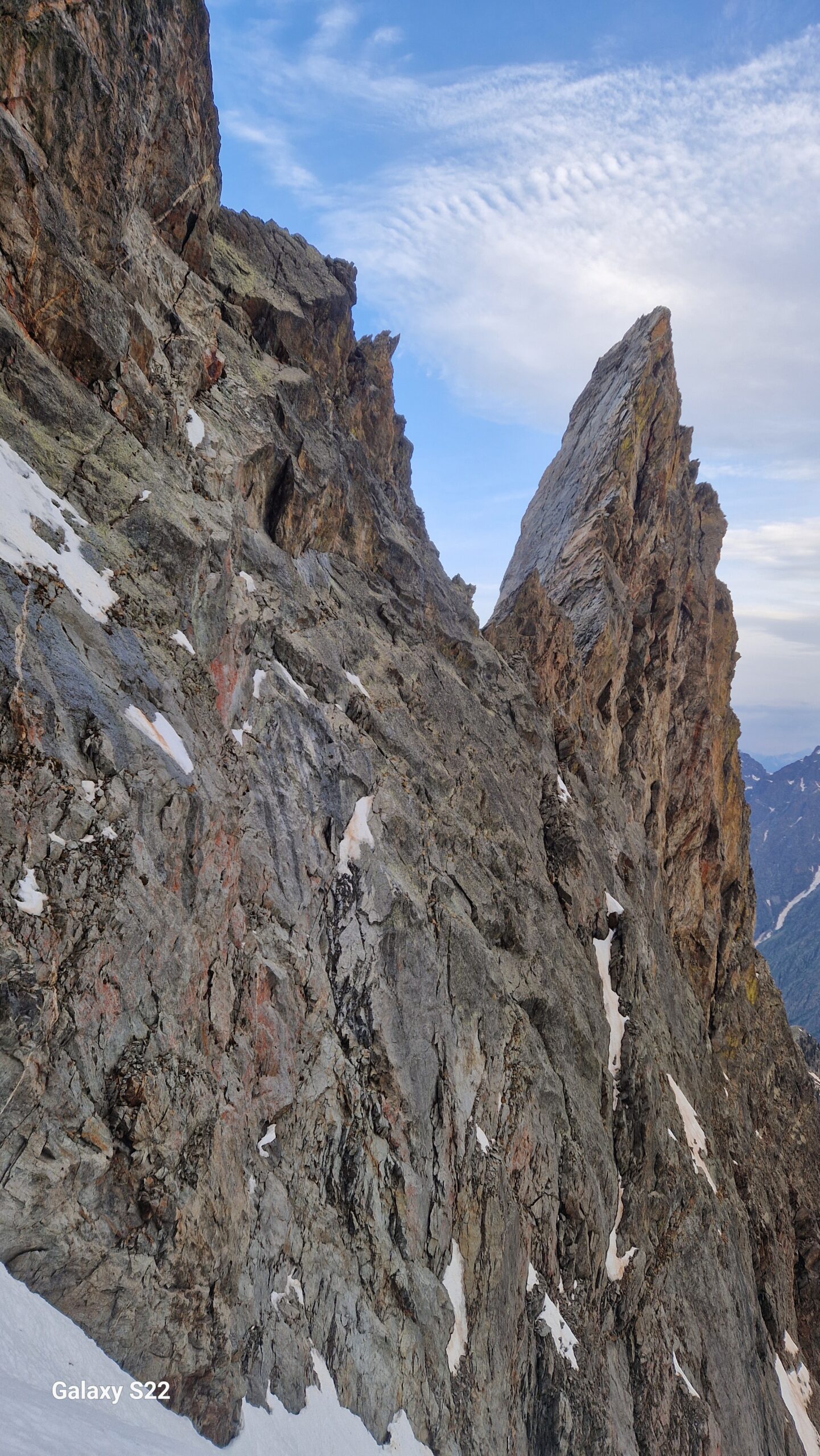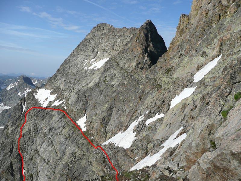 si segue una cengia discendente verso destra fino a incontrare la via normale di salita alla Cima Nord dell’Argentera. Seguendo i bolli di vernice, con facile disarrampicata, si giunge nei pressi di una stretta cengia-rampa verso sinistra che permette di scendere fino al sottostante altopiano del Baus.