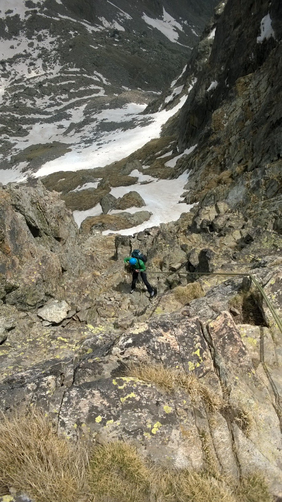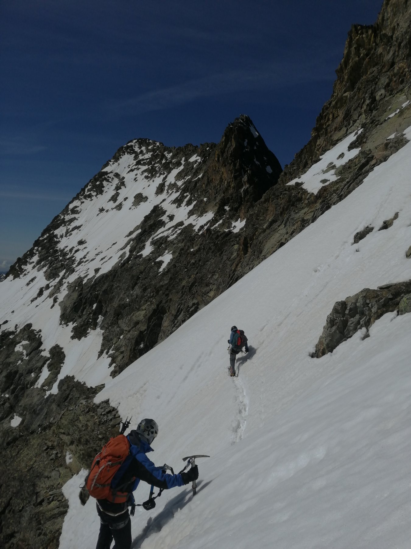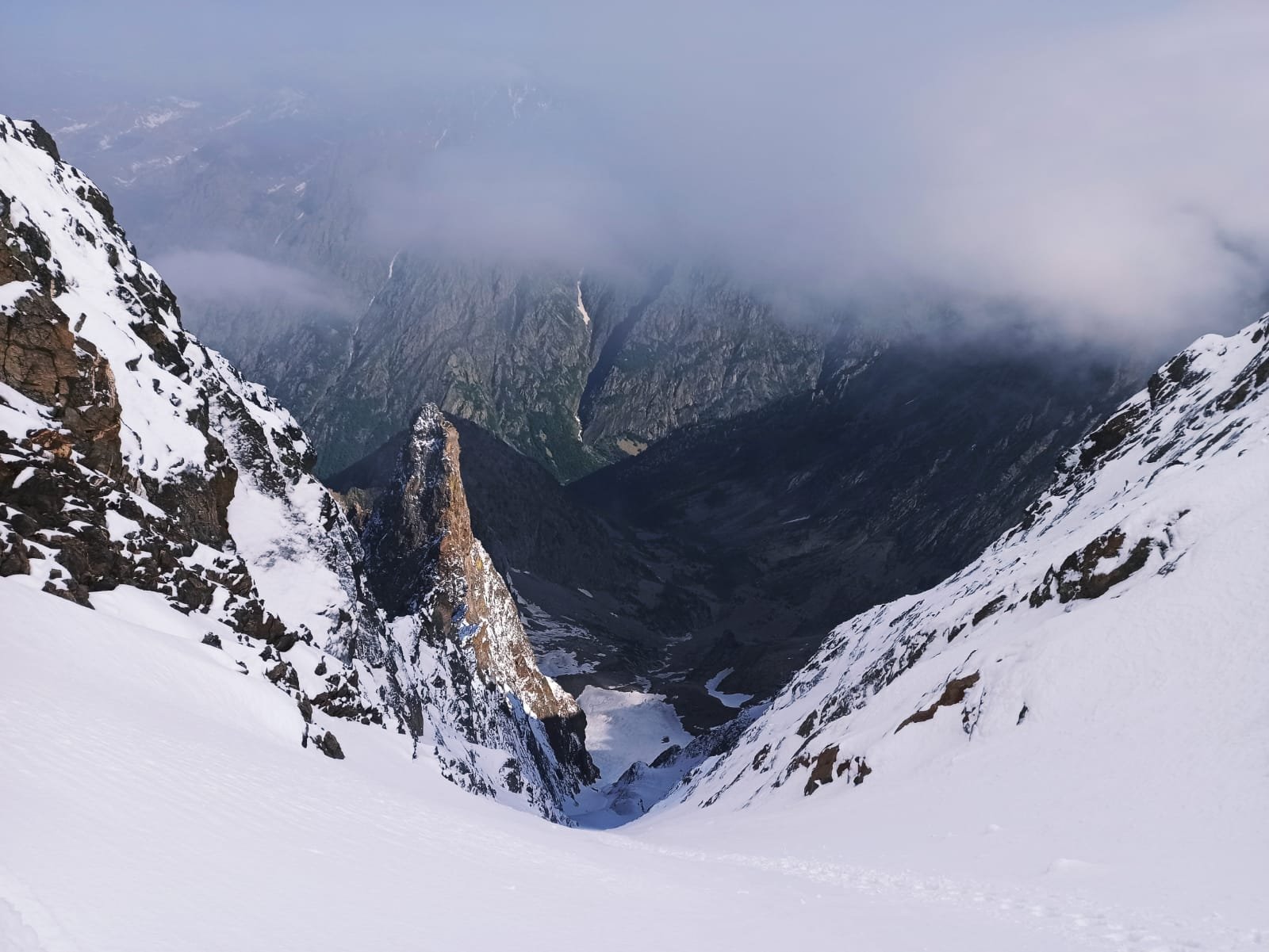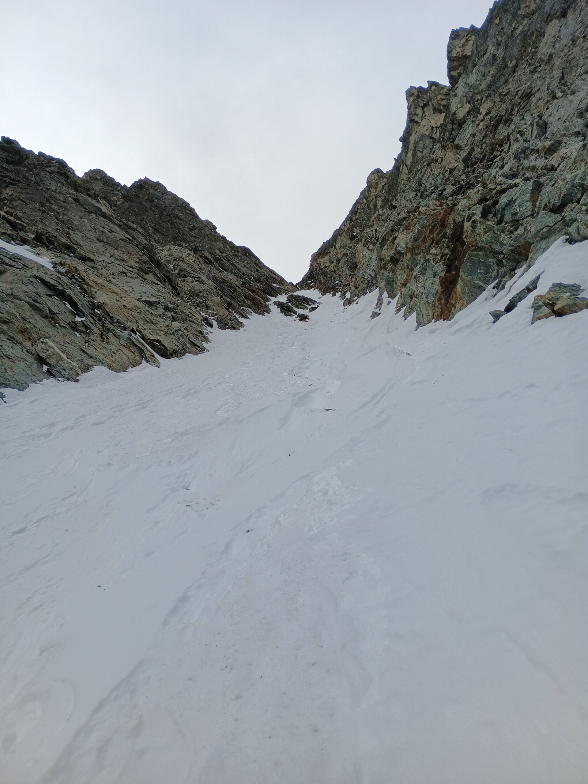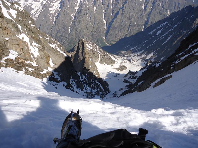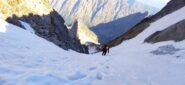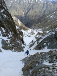 Discesa lunga e altrettanto complessa sul versante opposto, specie in presenza di neve ammollata dal sole, assolutamente da non sottovalutare.