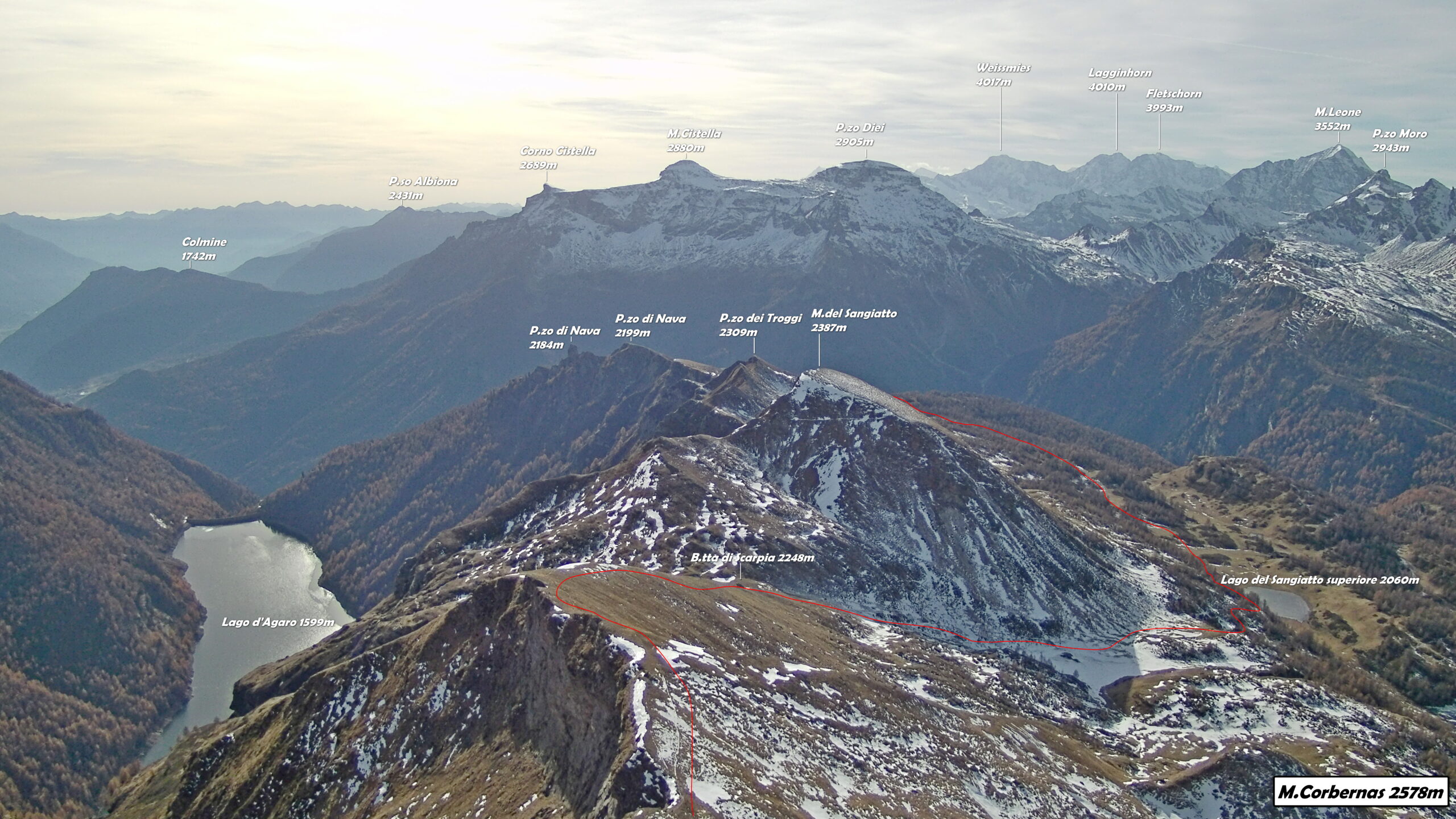 Dal parcheggio alla fine della galleria si risale al bordo della diga e seguendo la destra orografica del lago di Agaro arrivando alle baite Spygher 1607 m. Da qui si seguono le indicazioni per l’Alpe Pojala seguendo il sentiero che sale tra i larici uscendo poco sotto l’Alpe Bionca 1992m. Con un traverso e una risalita che passa sotto la stazione della teleferica si aggira il costone che porta in leggera pendenza verso l’Alpe Pojala 2148 m. Si prende ora il sentiero che traversa e passa sotto il versante S-E del M.Corbernas portandosi alla Bocchetta di Scarpia 2248 m dove si intercetta un labile sentierino che sale a dx su pratoni della larga cresta verso il visibile Monte Corbernas. Ultimo tratto ripido che aggira sulla sx la rocciosa punta sbucando ad una poco pronunciata sella dove in breve si arriva facilmente alla cima del Monte Corbernas.