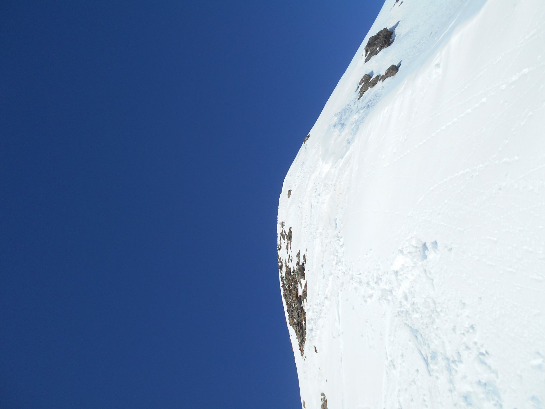 Partito con gli sci dalla croce di vetta, bisogna toglierli una prima volta in cresta per una decina di metri e una seconda volta nella strettoia del canale sud , ghiaccio e roccette, poi si ricalzano definitamente alla tana della marmotta.