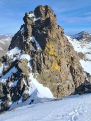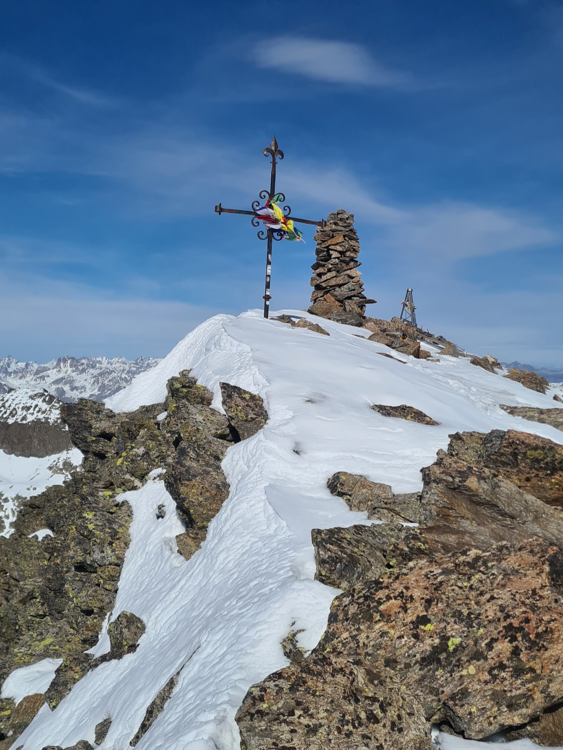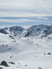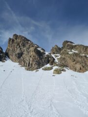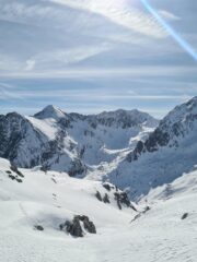 Sci ai piedi da Strepeis, con alcuni tratti in cui sì è costretti a togliere gli “assi” (situazione decisamente peggiore al rientro), su neve battuta e poi, per un bel po’, su ottima traccia dal Rifugio Dahu in su. Verso i laghi del Lausfer non ho visto tracce, ma si proseguiva senza “sprofondare” eccessivamente. Numerose valanghe sotto la cresta che va dal Corborant alla Punta Gioffredo. Canalino di accesso al Buco della Marmotta abbastanza magro, ma agevolmente percorribile. Mi sembrava pericoloso passare sulla lingua di neve presente nella parte finale poco sotto la Forcella Est, ho allora scavato con la pala per liberare la “grotta attrezzata”… Niente da fare, gradini non pervenuti, sono salito quindi scavalcandola esternamente, cercando di fare il tutto nella maniera più sicura possibile. Cornice in buone condizioni e pala finale non del tutto innevata. Panorama da commozione, grandioso! Ottimo innevamento nella conca che un tempo ospitava il ghiacciaio del Corborant. Neve bagnata (bisognava scendere alle 11:00 – 11:30 anziché le 13:45); comunque non ho toccato fino a circa 2300 m – 2400 m; di lì in poi molta attenzione. Speriamo che ne arrivi altra il prima possibile! Gita indimenticabile!