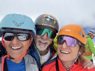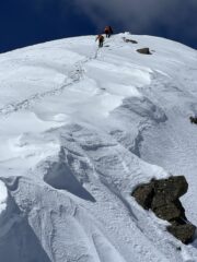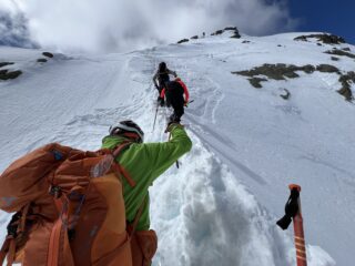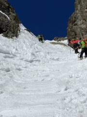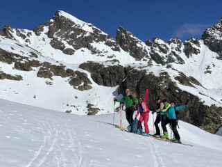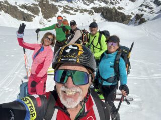 Oggi si calzano gli sci a quota 1850 . Il pendio svalangato e ripido , lo abbiamo superato tutto sulla destra . Più in alto neve abbondante con numerose tracce . Solo noi siamo saliti al Corborant , altri hanno fatto la Gioffredo , scendendo presto e trovando neve migliore . Noi abbiamo risalito il canalino da quota 2830 circa , dopo aver fatto traverso scivoloso e un poco sfondoso . La salita con picca e ramponi non è stata difficile , grazie a Danilo e Debora che hanno fatto le peste , quelle vecchie erano presenti solo dopo il colle . Tutti in vetta con discesa senza problemi . La neve invece salvo alcuni tratti nella parte alta ed in basso è risultata abbastanza difficile .