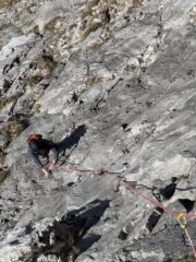 - L7 – uscire sulla sinistra del tetto, attraversare la cengia con paleo per ritrovare la via su una bella placca verticale, 5b