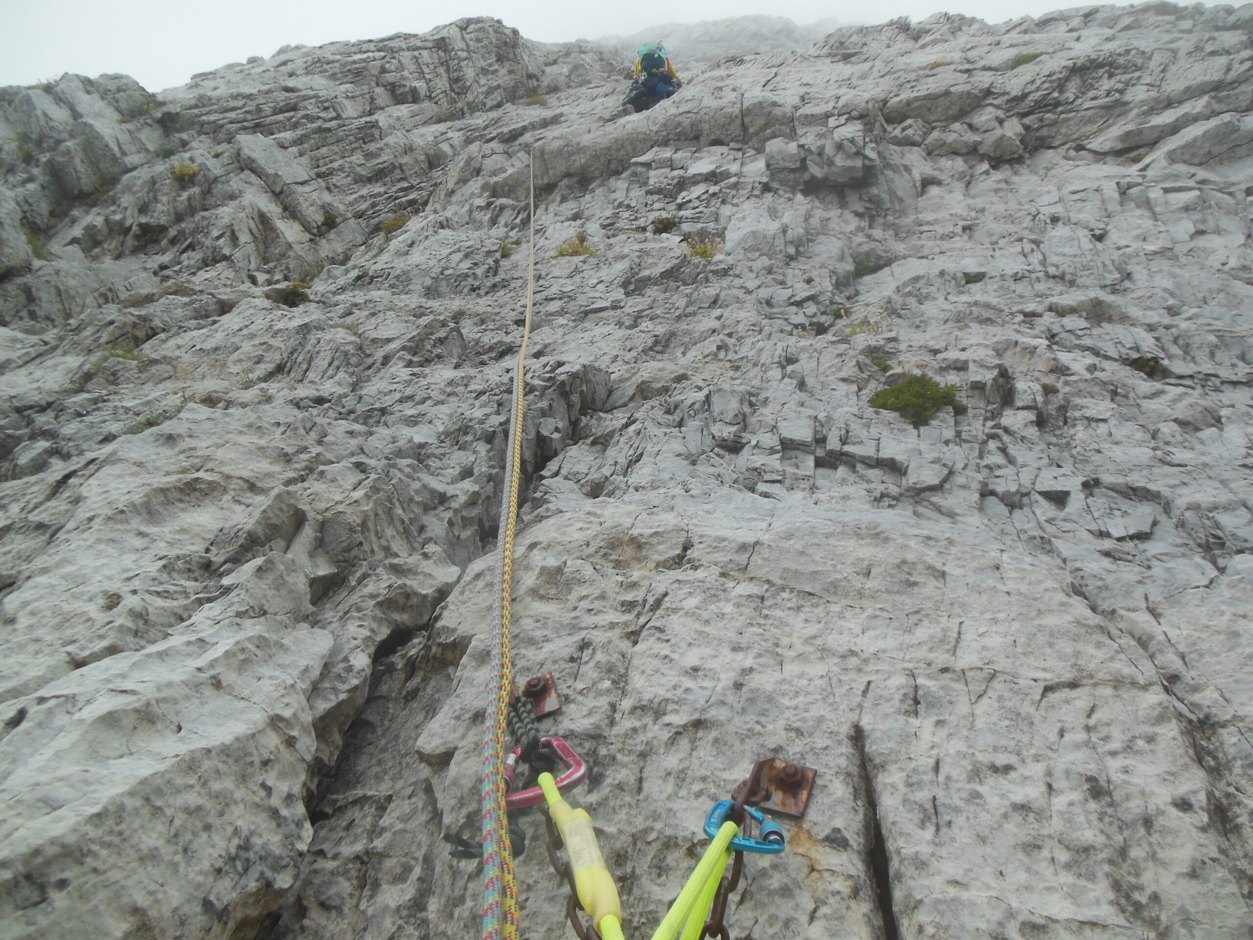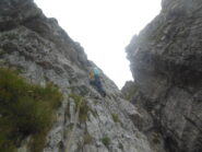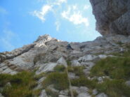 - 3° tiro. Su per placca a gradoni leggermente a sx fino ad incontrare una fessura che si supera con arrampicata atletica sempre con buone prese. Alla fine della fessura di traversa leggermente a destra fino ad una sosta con catena. ( 5c chiodatura rada).
