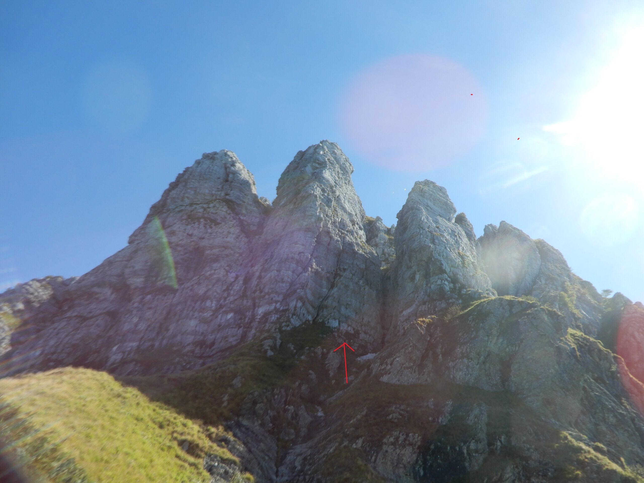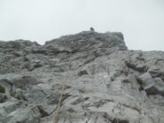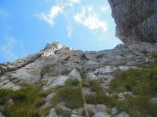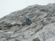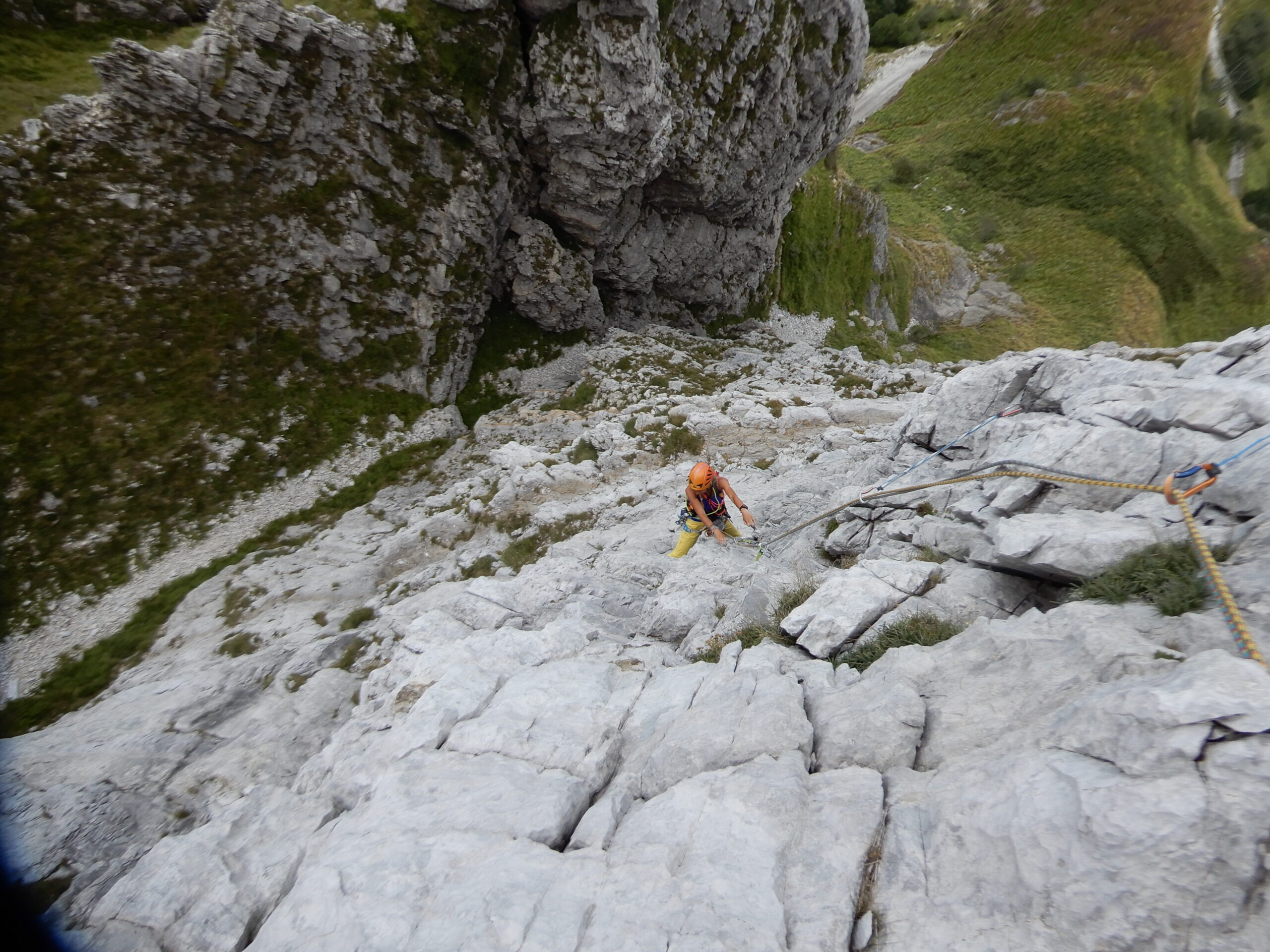 - 4° tiro (chiave). Si supera la sosta a sinistra poi su per una rampa dove è presente un friend incastrato con lungo cordone rosa. Da lì si traversa a dx (presenti due vecchi chiodi ma ancora buoni) e poi su per un difficile ma breve diedro che culmina con un ribaltamento (chiodo). Da lì per placca a gradoni si procede dritti ad un grosso masso con un fittone dove si sosta. (VI° spesso V+).